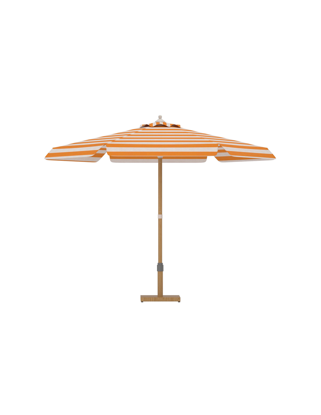 CEROX Parasol udført i et moderne design af stål i trælook og med skærm i hvid og orange stribet polyester. Parasollen måler 240 cm i højden og 270 cm i diameter.