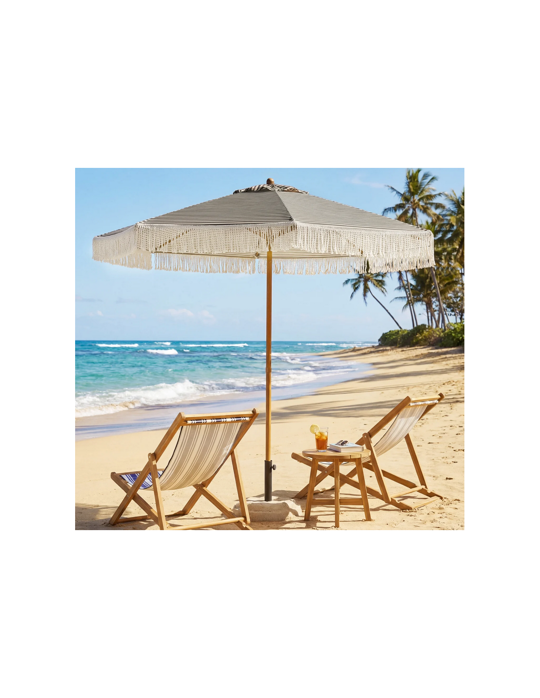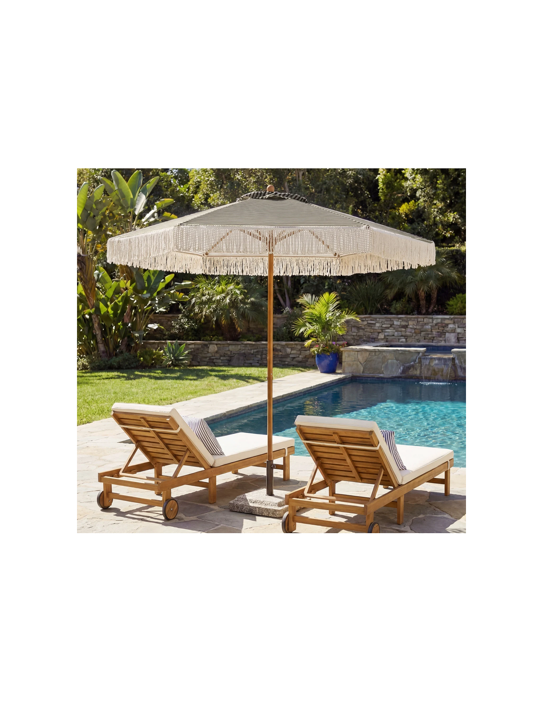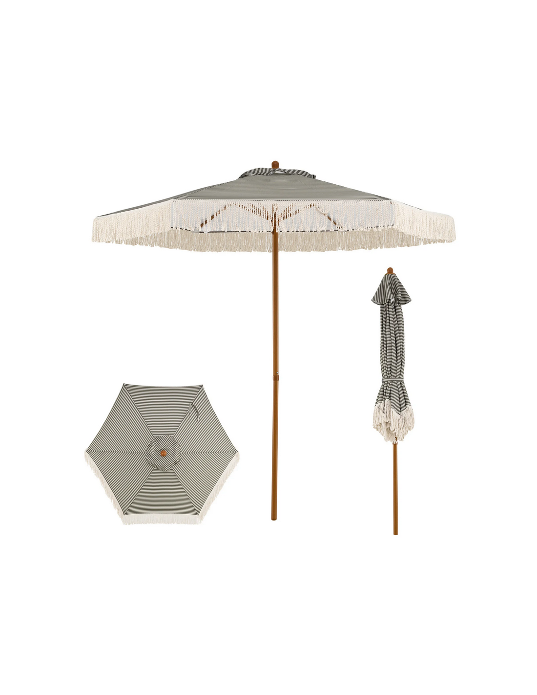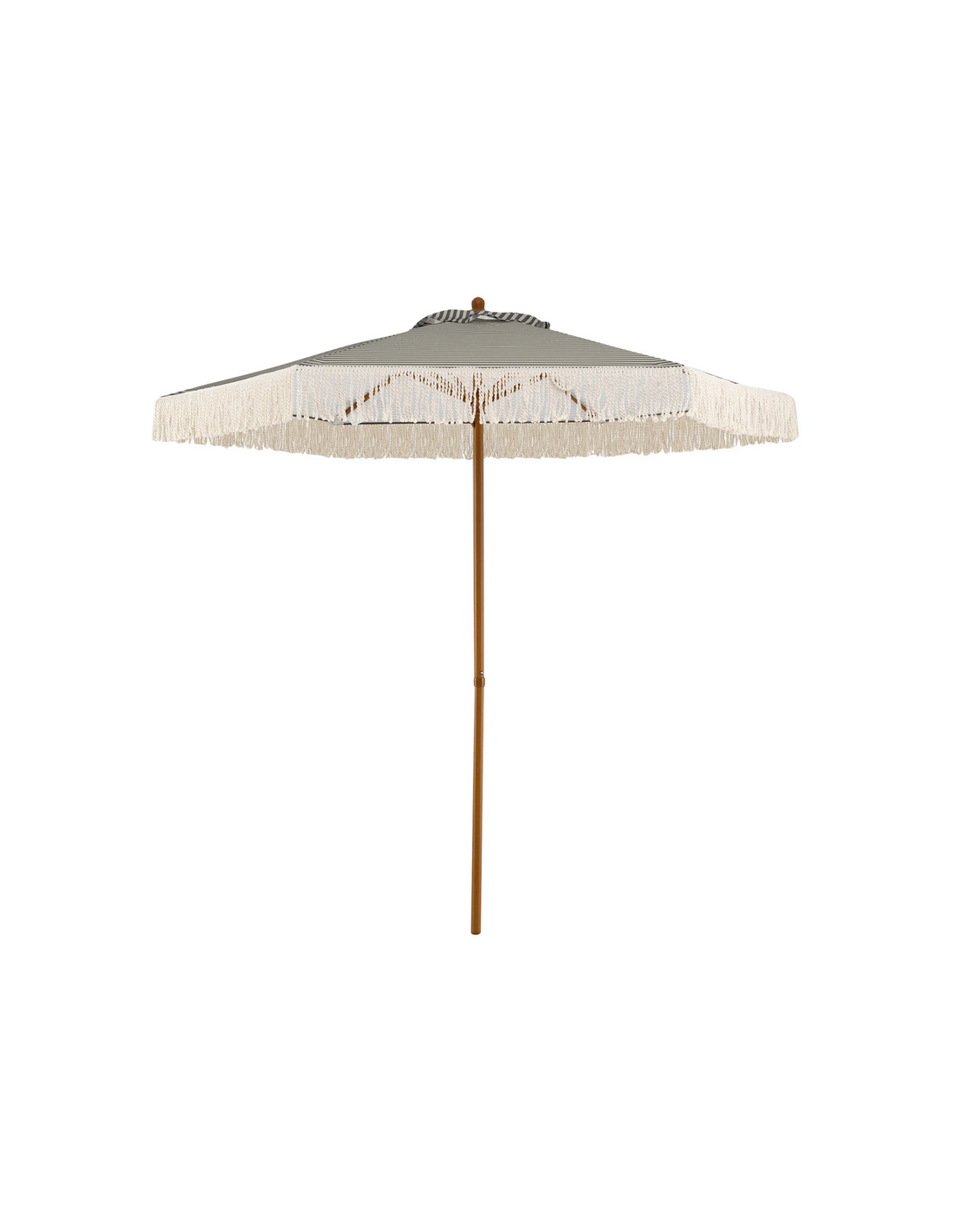 Parasol med frynser udført i et moderne design af aluminium i trælook og med skærm i hvid og grøn stribet polyester, der er UV-resistent og vandafvisende. Parasollen måler 228 cm i højden og 210 cm i diameter.
