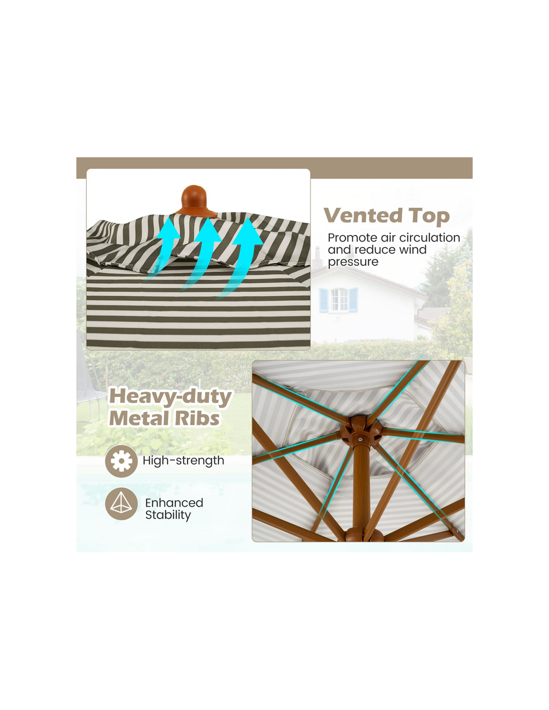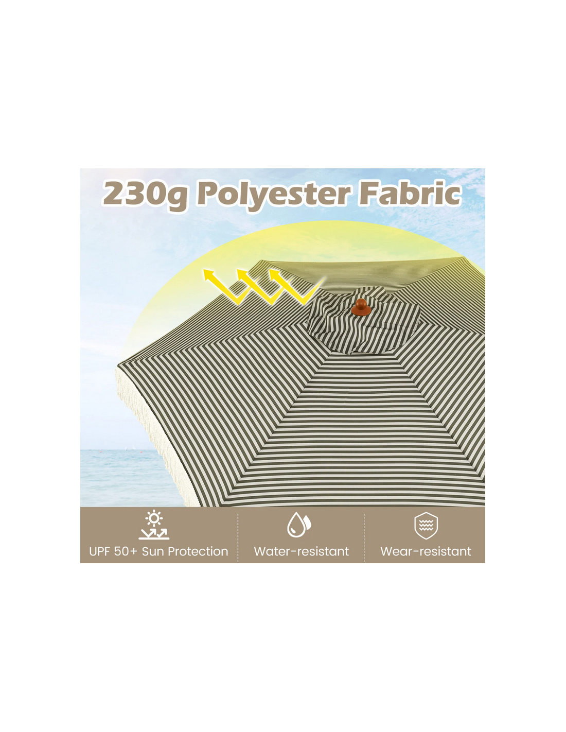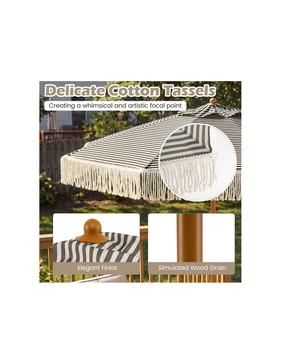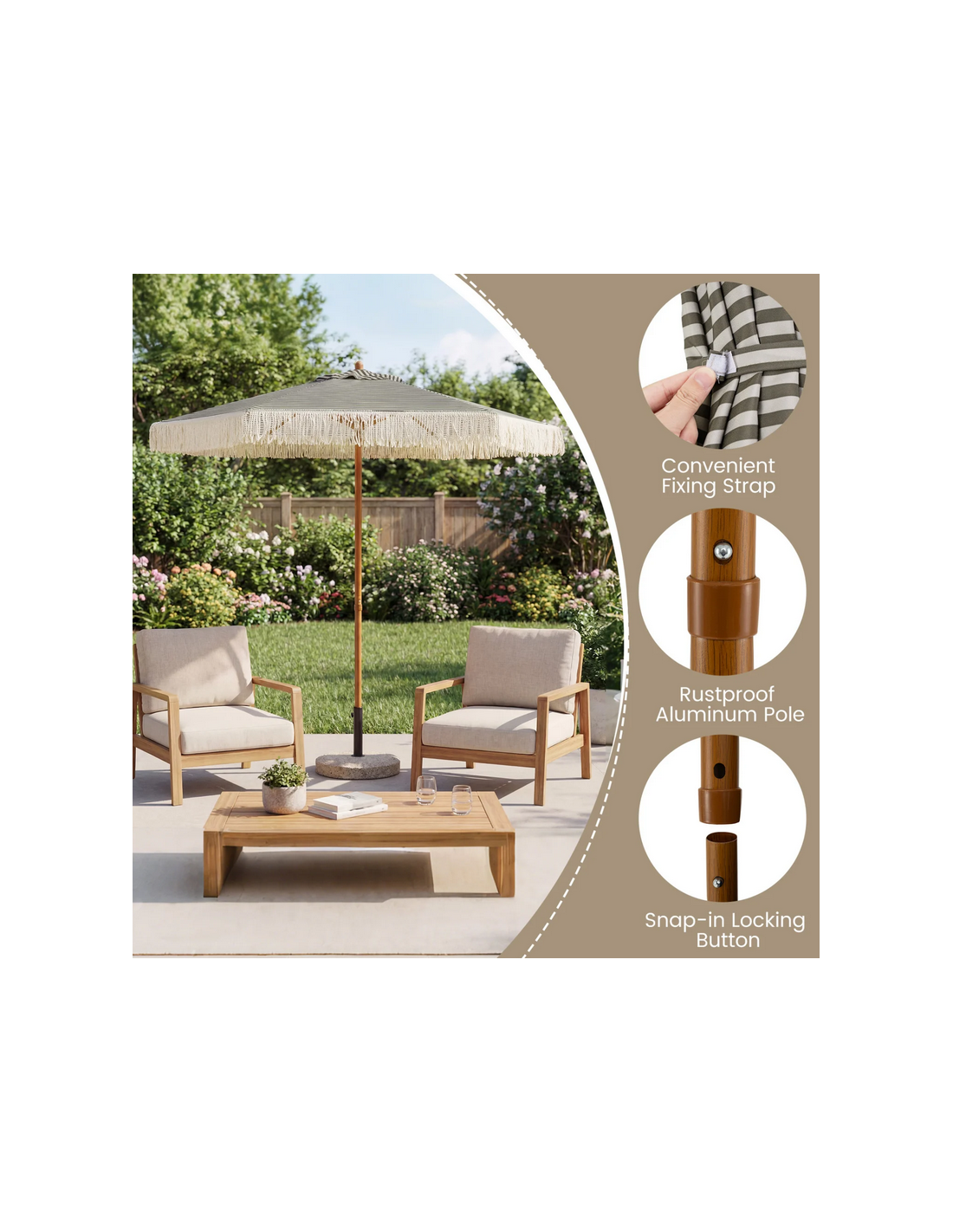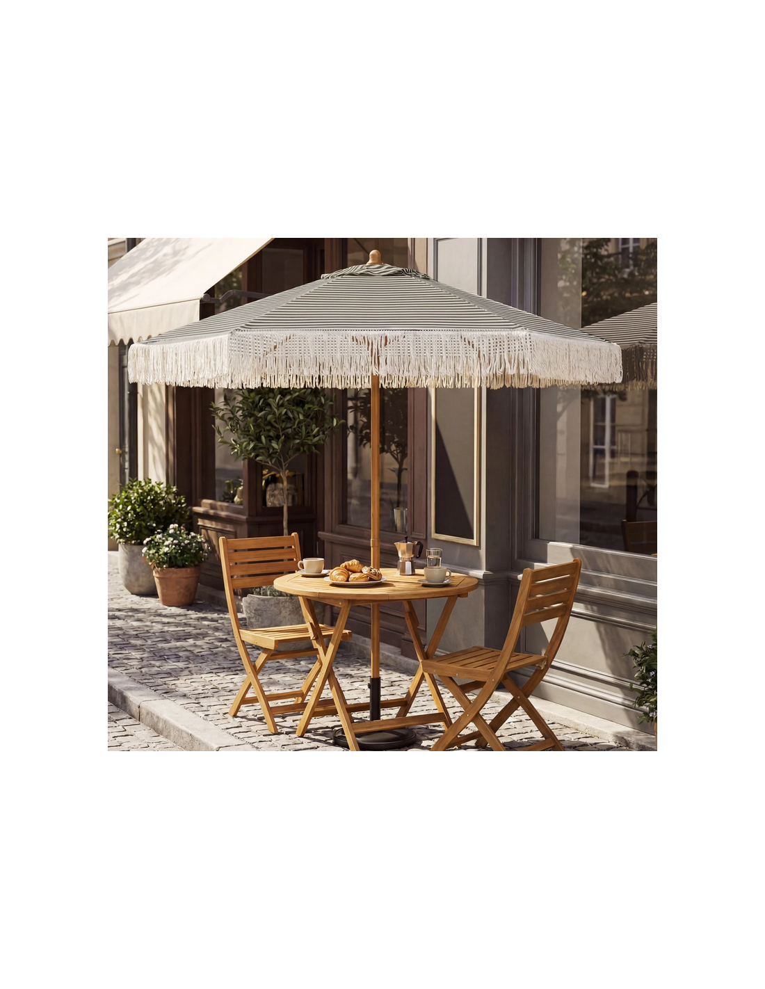 Parasol med frynser i aluminium og polyester Ø210 cm - Trælook/Hvidgrøn stribet