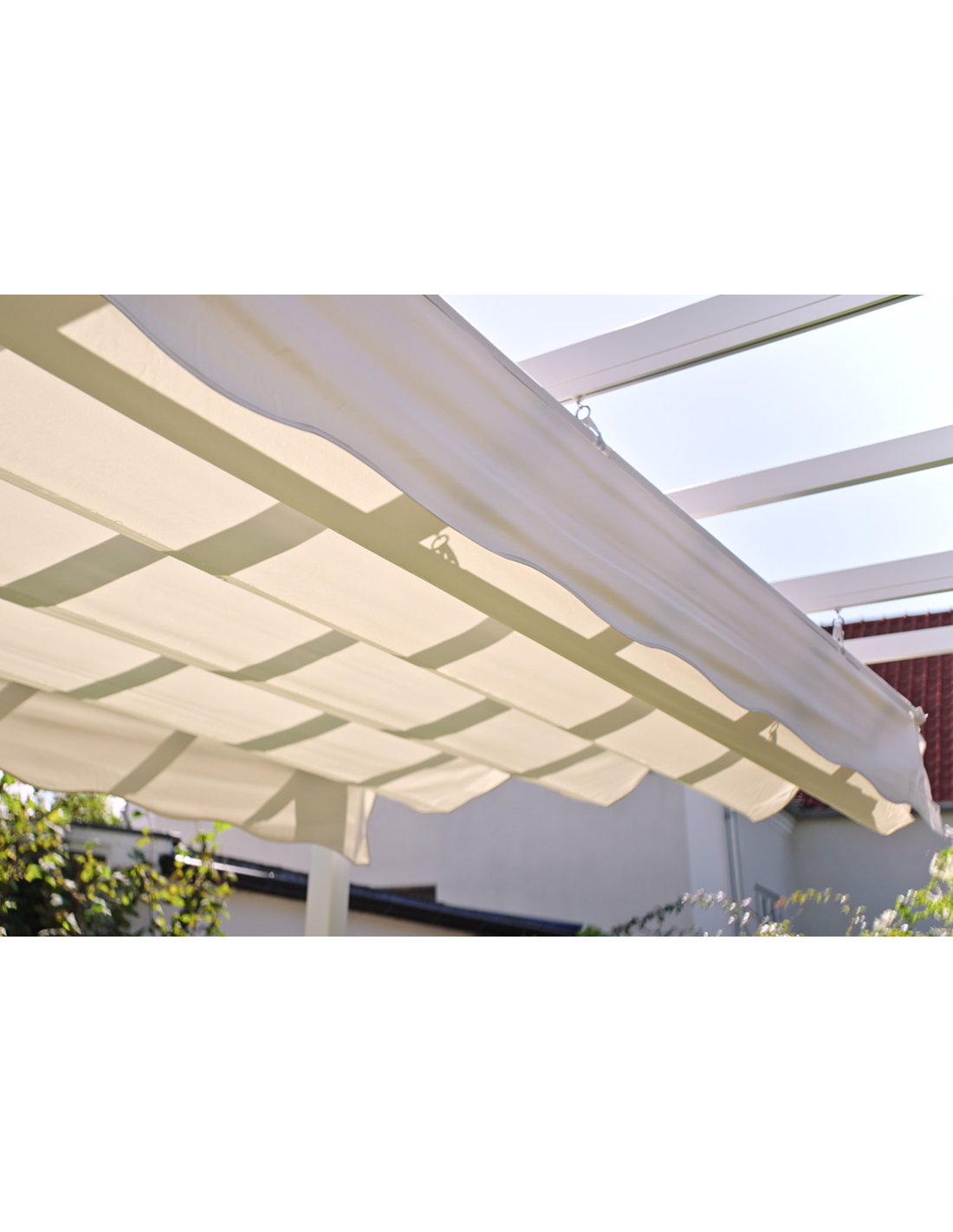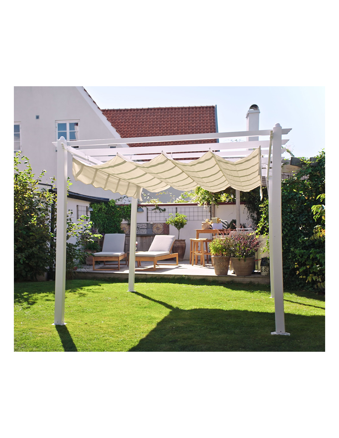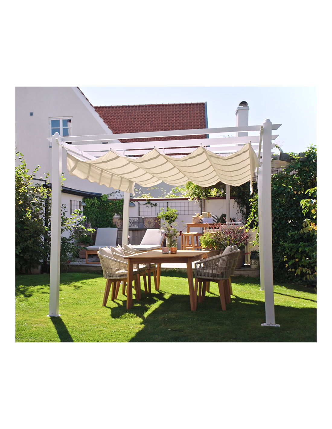 Moderne havepavillon fra Svenske Hillerstorp, udført i et stilrent design af hvidlakeret aluminium og stål. Dertil pavillondække i sandfarvet polyester der kan trækkes til eller fra. En smuk havepavillon til hygge i haven eller på terrassen. Pavillonen måler 3 x 4 m i bredde og dybde og 2,35 m i højden.