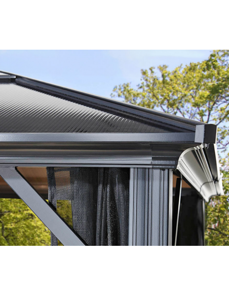 MERIDIEN Pavillon udført i et design af antracit pulverlakeret aluminium og tag i polycarbonat med myggenet i mørkegrå nylon. Pavillonen måler 270 cm i højden og 485 x 365 cm i bredde og dybde.