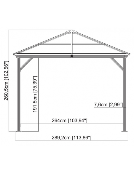 VENTURA Pavillon udført i et design af basaltgrå pulverlakeret aluminium og tag i basaltgrå lakeret stål. Pavillonen måler 260,5 cm i højden og 295,5 x 295,5 cm i bredde og dybde.