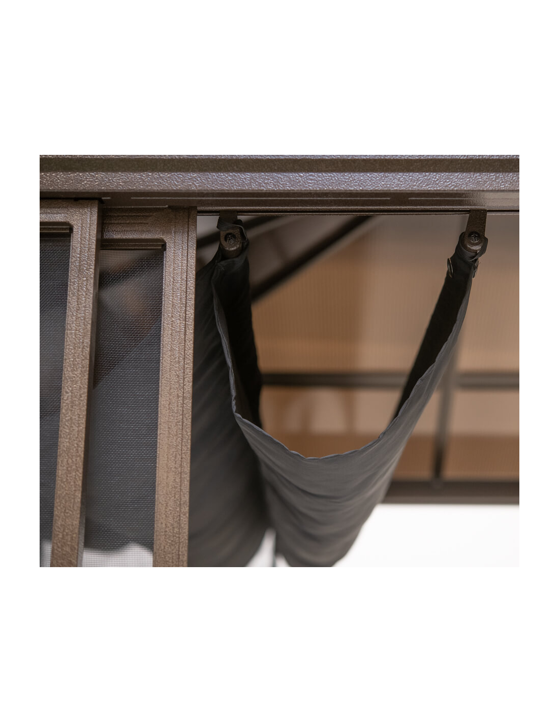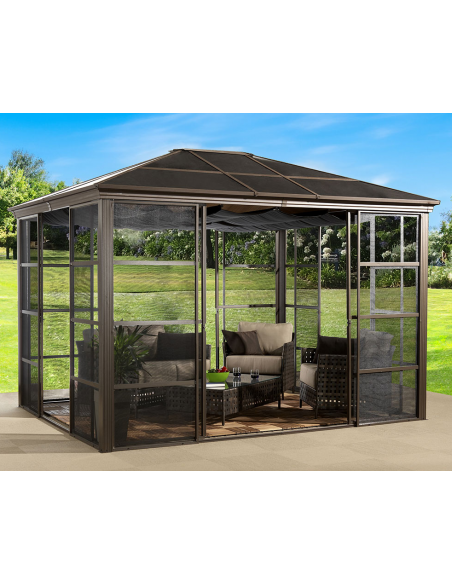 CASTEL Pavillon udført i et design af bronzebrun pulverlakeret aluminium og tag i polycarbonat samt myggenet i mørkegrå nylon. Hertil dække der kan trækkes til og fra, for beskyttelse af solens stråler. Pavillonen er med skydedøre og måler 296,28 cm i højden og 427,08 x 362,08 cm i bredde og dybde.