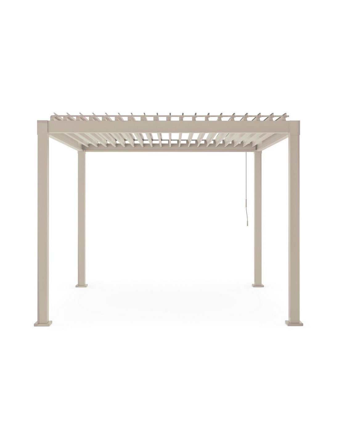 Moderne pavillon udført i et design med vipbart lameltag, udført i et design af beigelakeret aluminium. Havepavillonen måler 300 x 300 cm i bredde og dybde og 240 cm i højden. Taget åbnes og lukkes med håndtag.