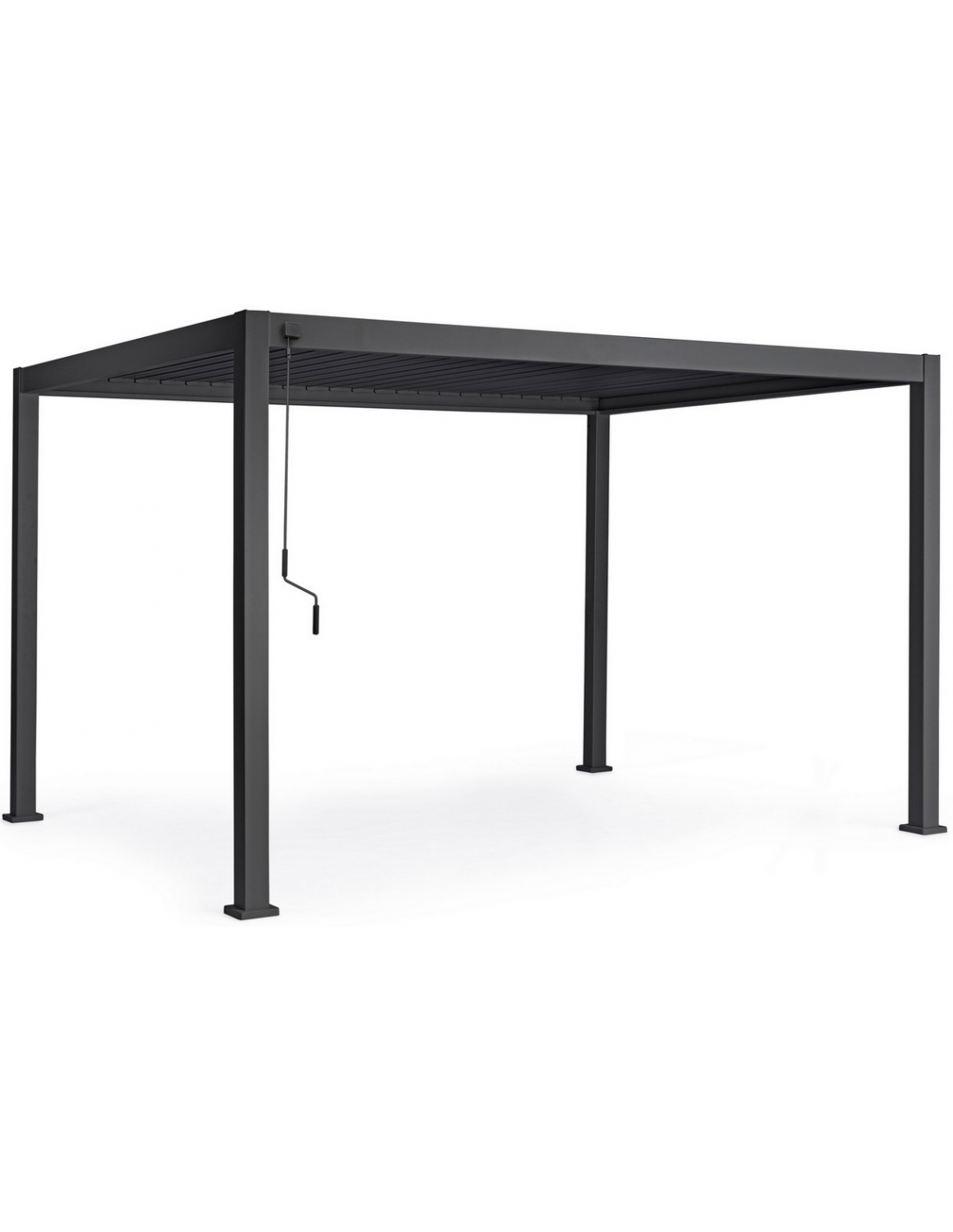 Moderne pavillon udført i et design med vipbart lameltag, udført i et design af charcoal lakeret aluminium. Havepavillonen måler 300 x 400 cm i bredde og dybde og 250 cm i højden. Taget åbnes og lukkes med håndtag.
