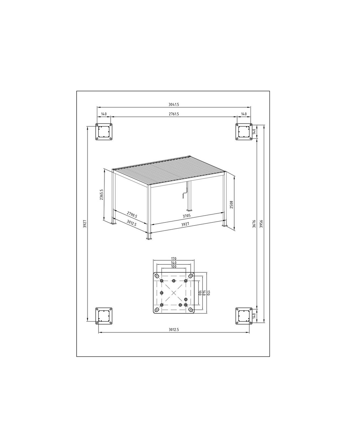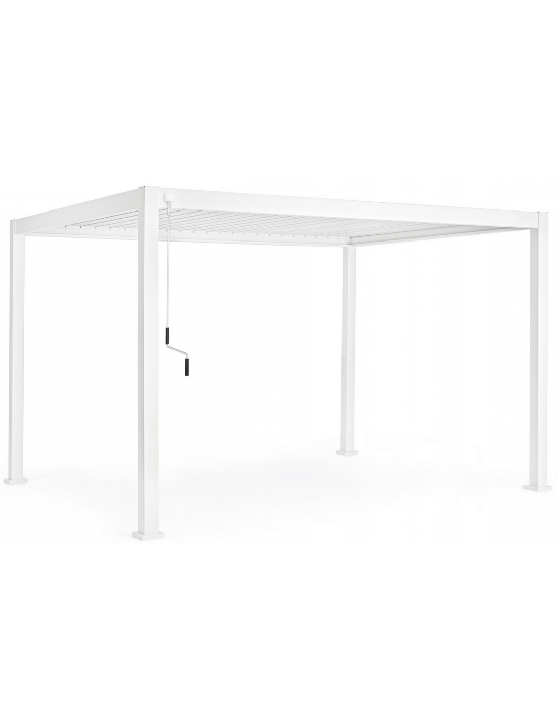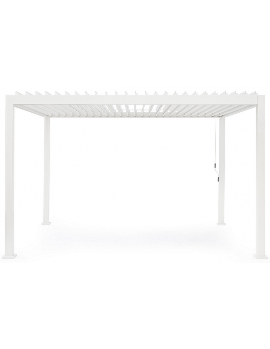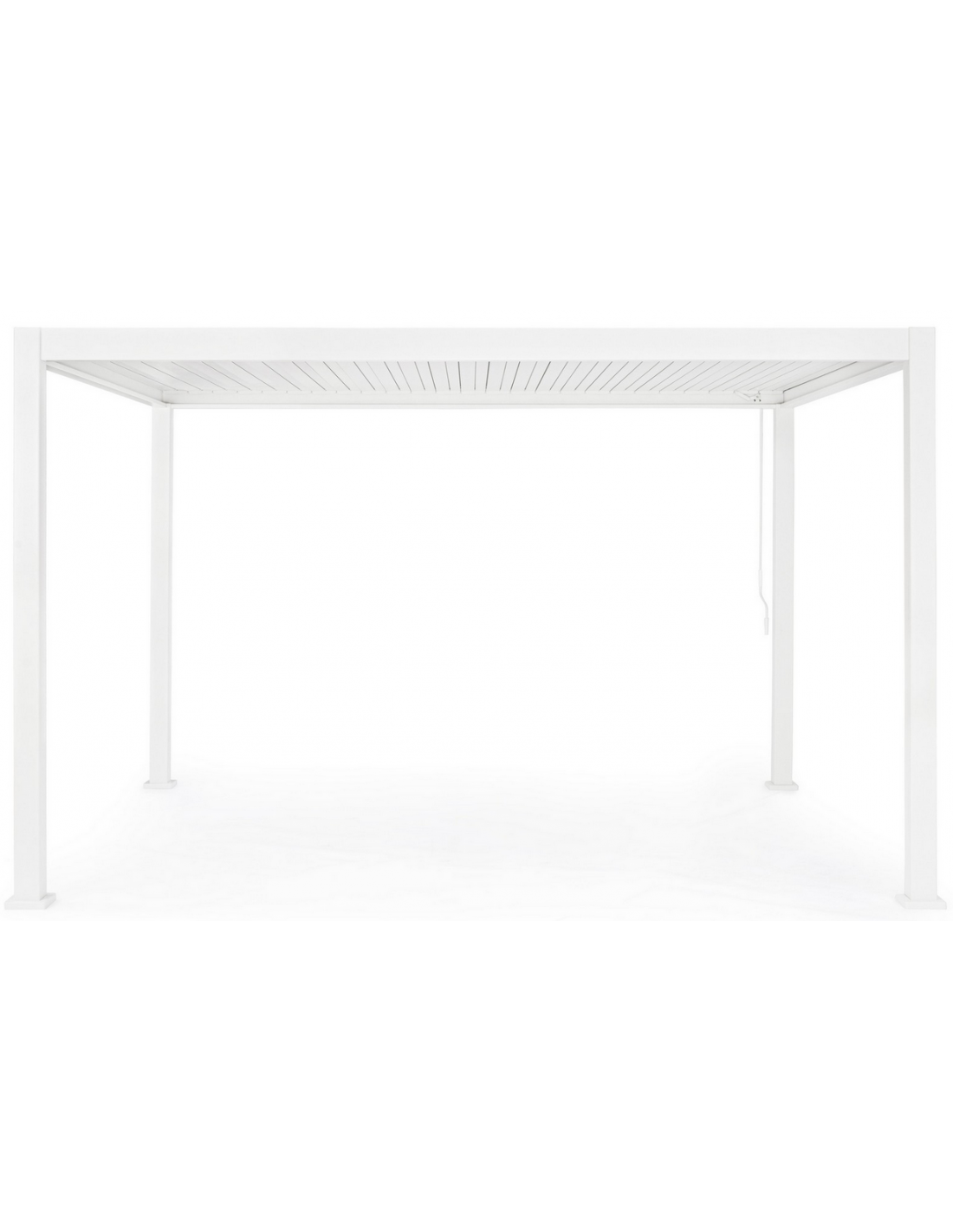 Moderne pavillon udført i et design med vipbart lameltag, udført i et design af hvidlakeret aluminium. Havepavillonen måler 300 x 400 cm i bredde og dybde og 250 cm i højden. Taget åbnes og lukkes med håndtag.