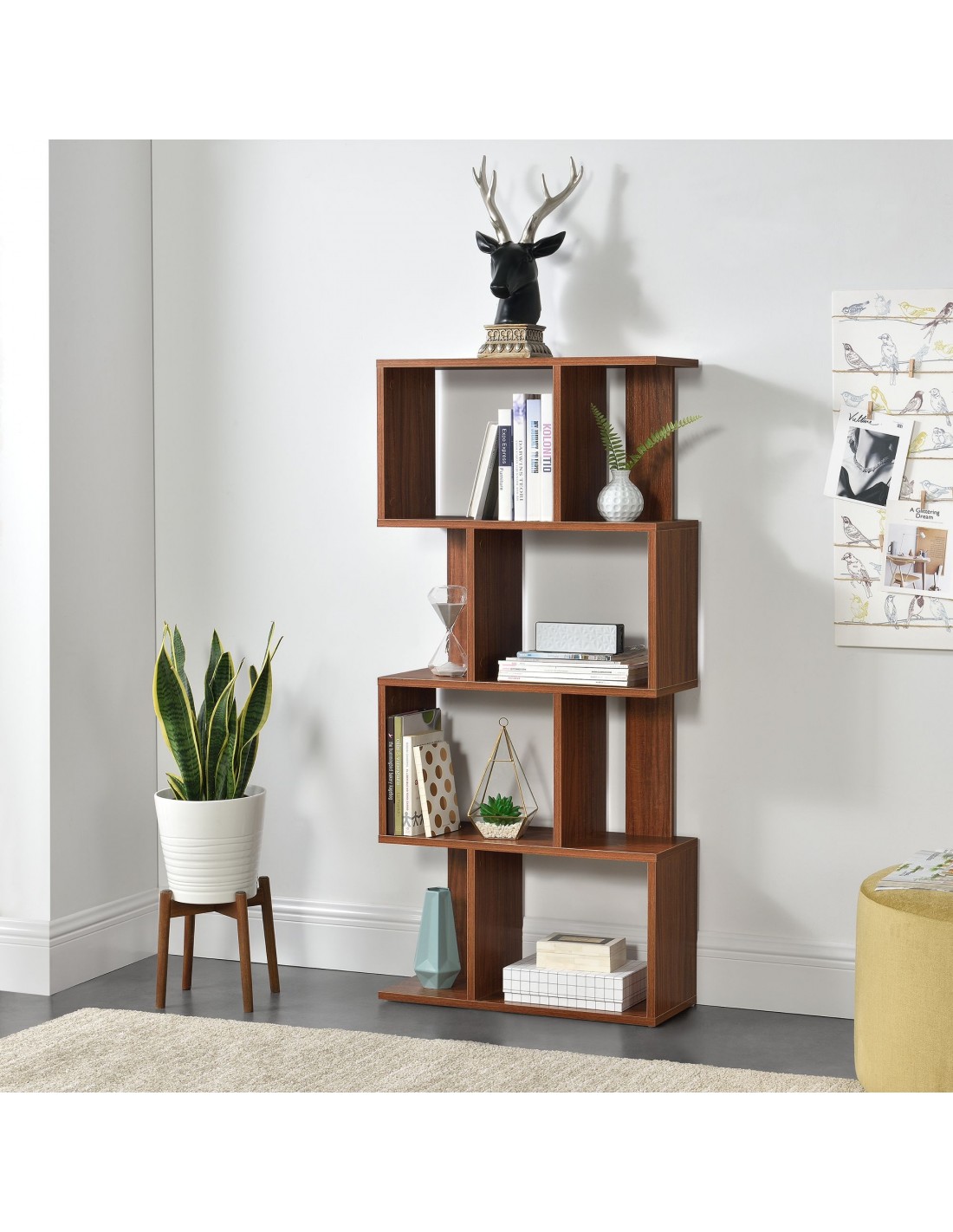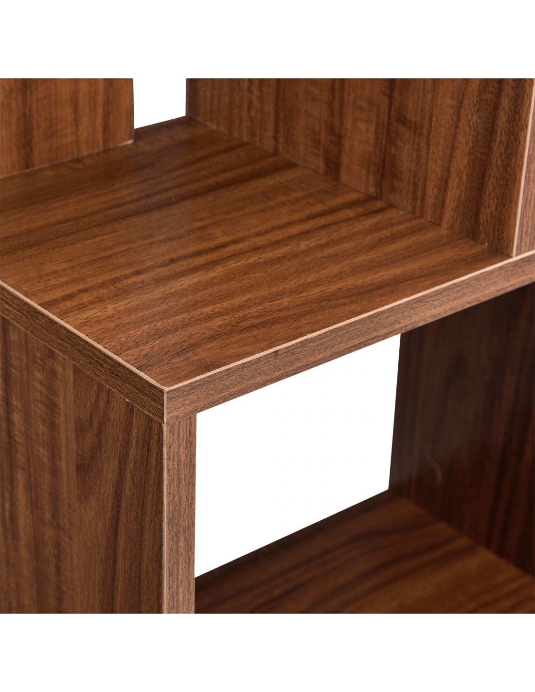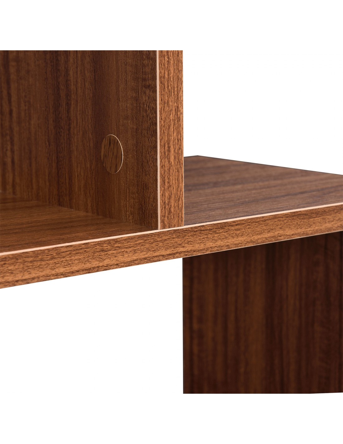 Bogreol udført i et design af valnøddebrun møbelplade, med varierede hylder. Reolen måler 130 cm i højden og 60 x 24 cm i bredde og dybde.