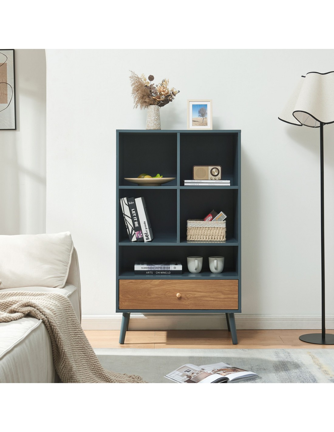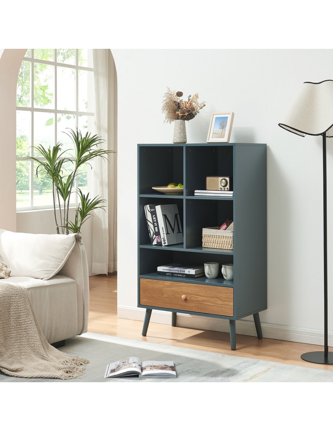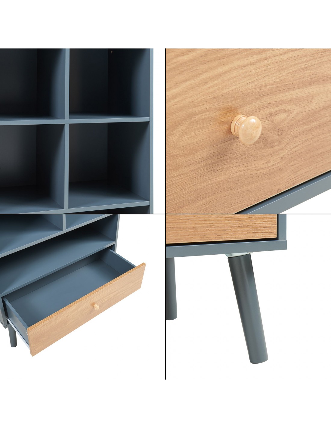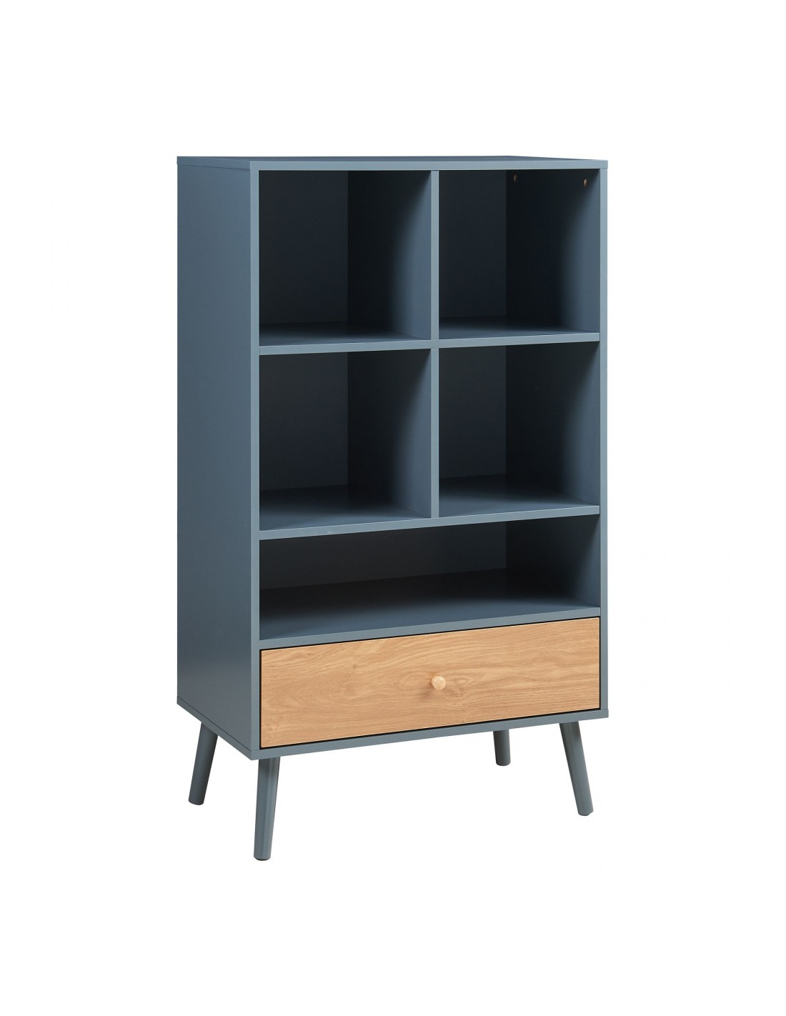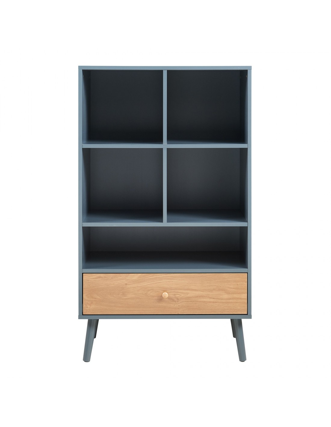 Bogreol udført i et design af gråblå lakeret fyrretræ og gråblå og brun MDF. Reolen måler 120 cm i højden og 70 x 40 cm i bredde og dybde. I reolen forefindes 1 skuffe med målene H16,5 x B66,5 x D30 cm.