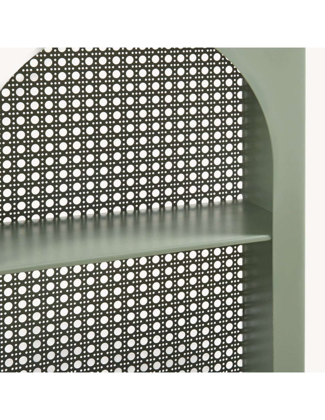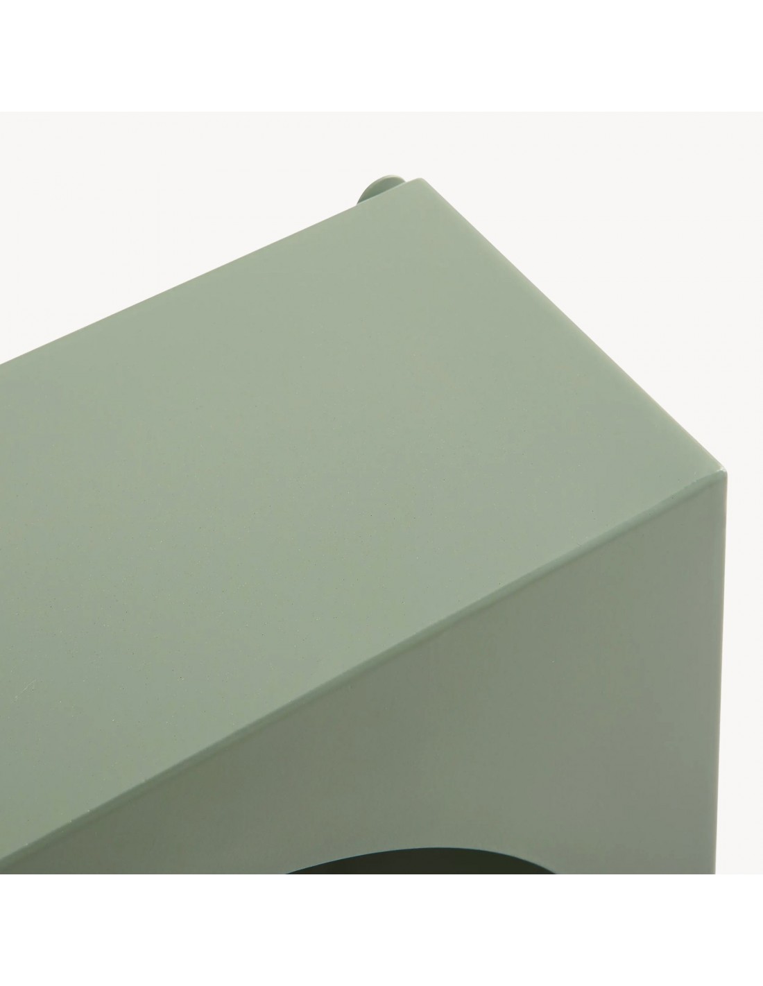 Hylde udført i et moderne design af grønlakeret metal. Hylden indeholder 2 hylderum og måler 40 cm i højden og 30 x 13 cm i bredde og dybde.
