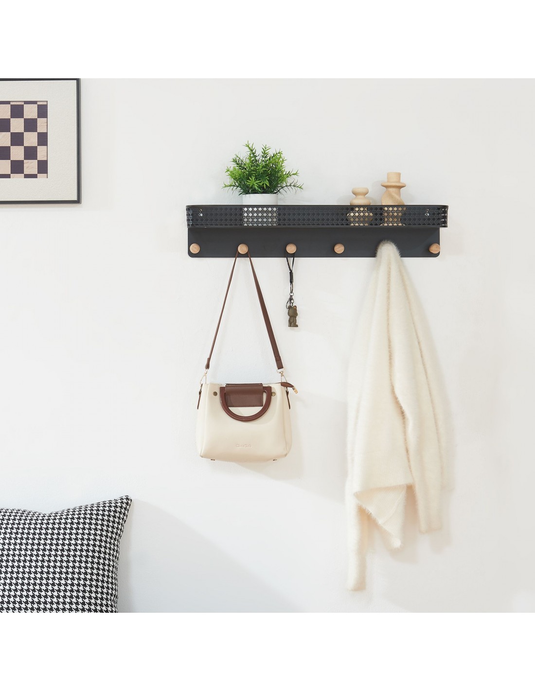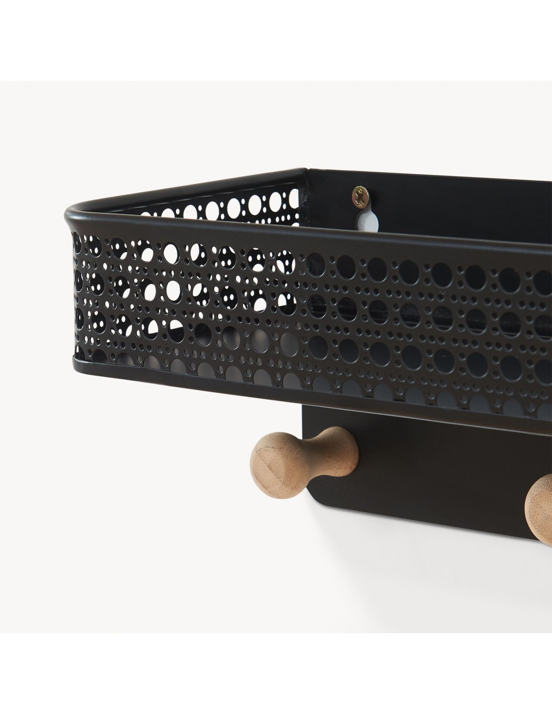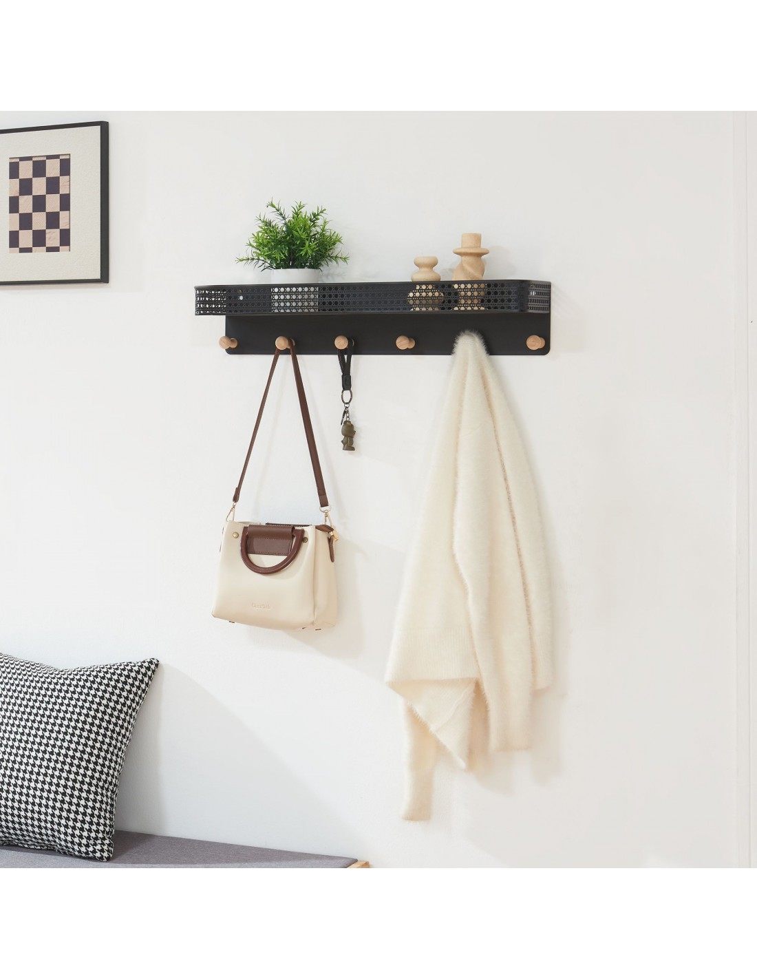 Hylde med knagerække i metal og bambus H12 x B60 x D13,5 cm - Sort/Natur
