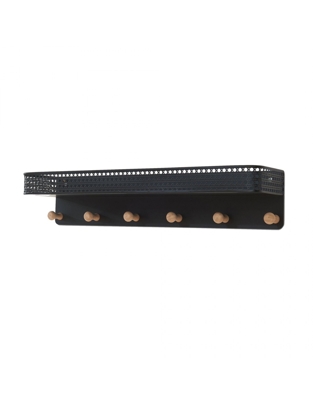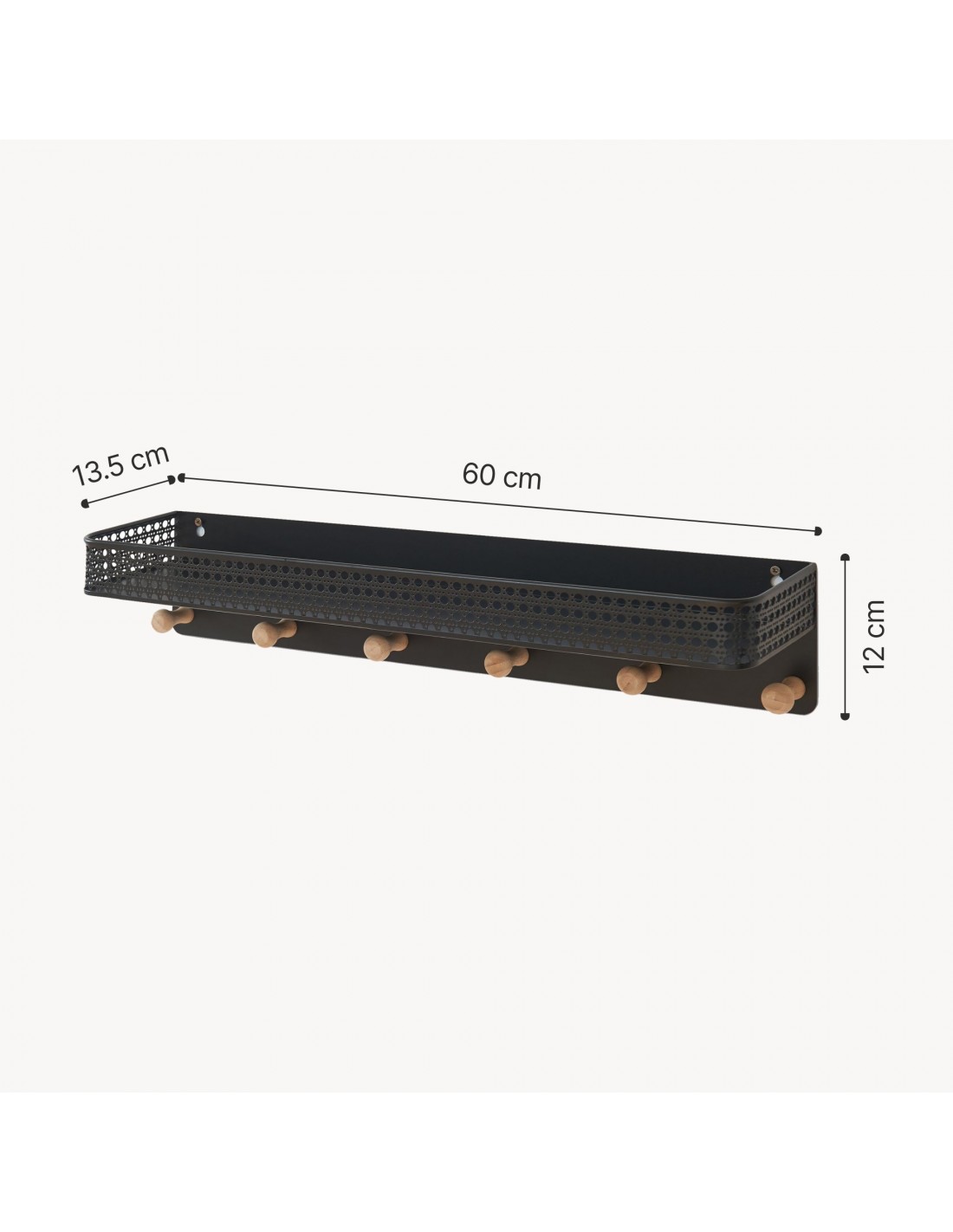 Hylde med knagerække udført i et moderne design af sortlakeret metal og naturfarvet bambus. Hylden har 6 knager og måler 12 cm i højden og 60 x 13,5 cm i bredde og dybde.