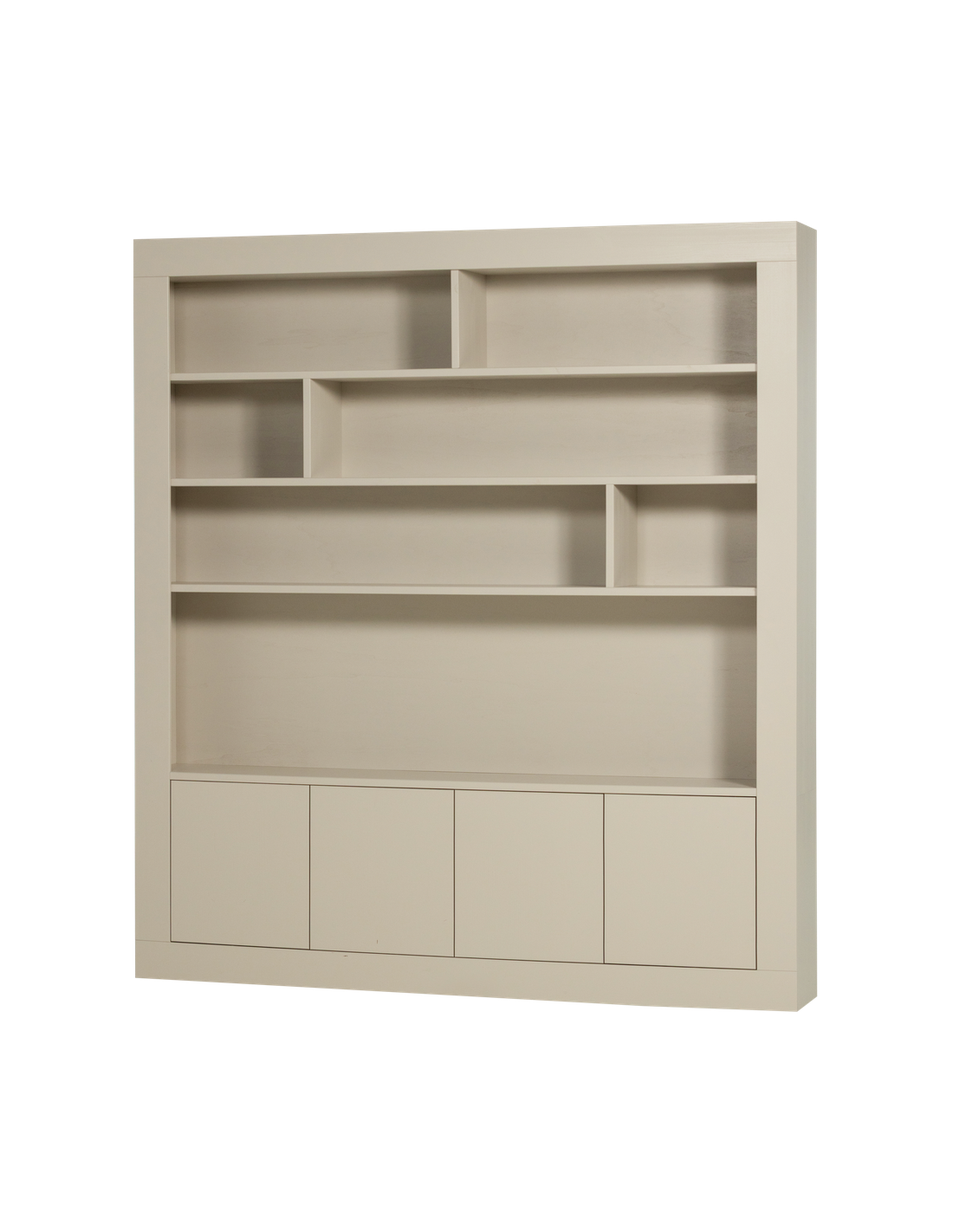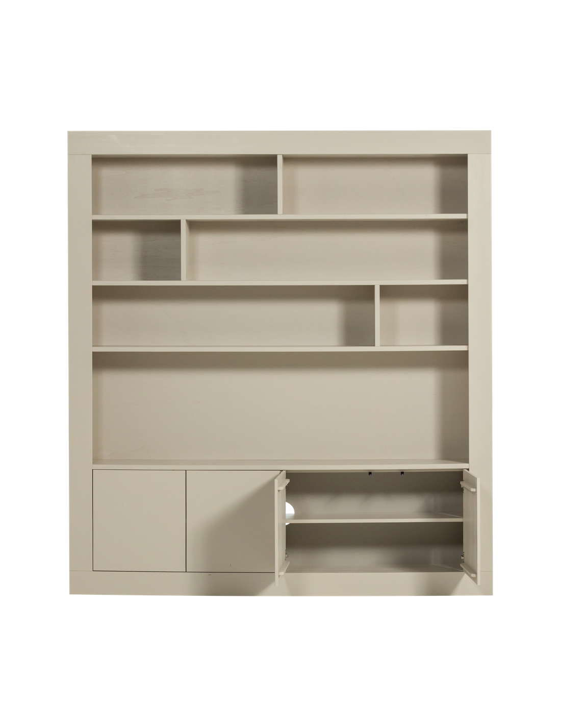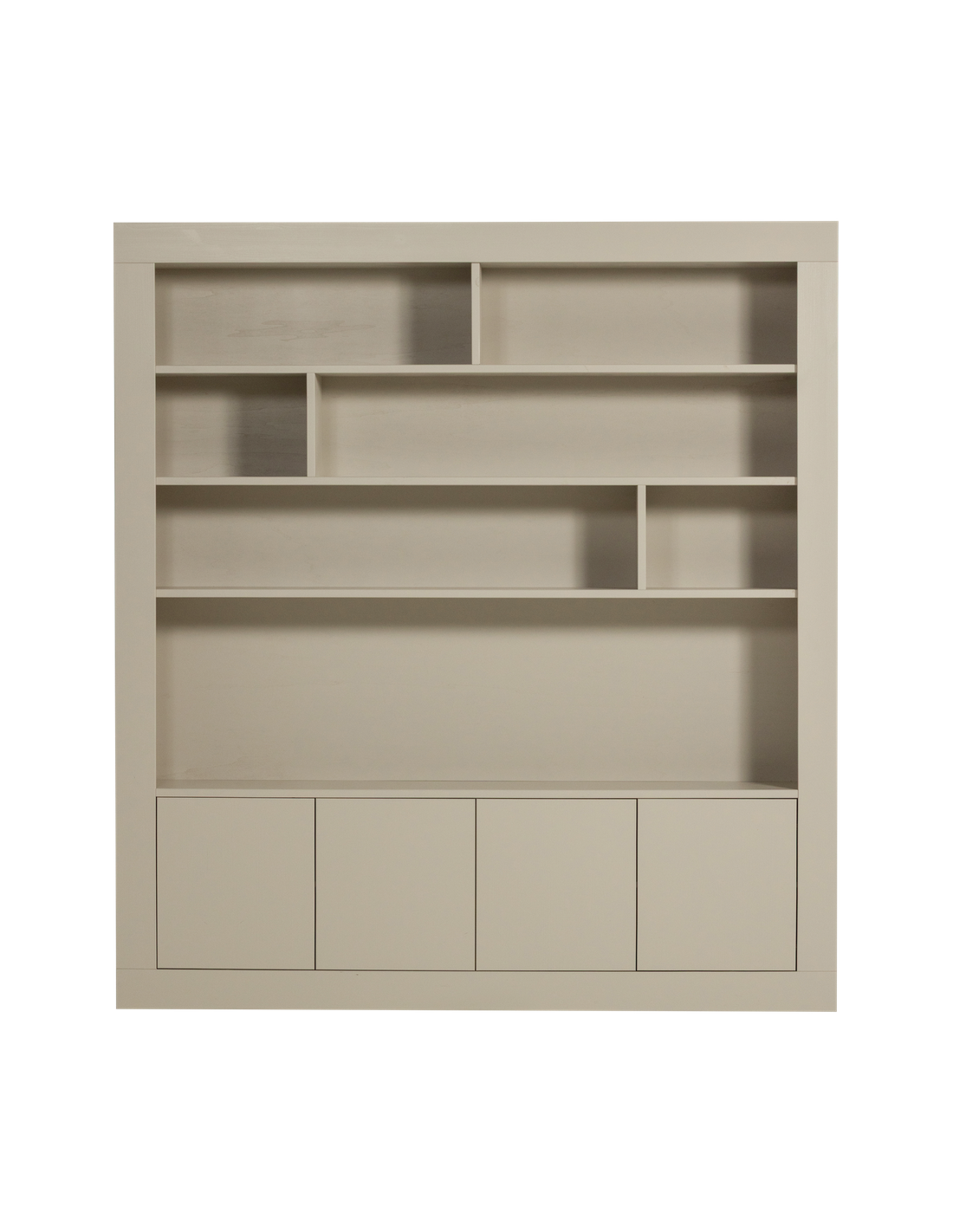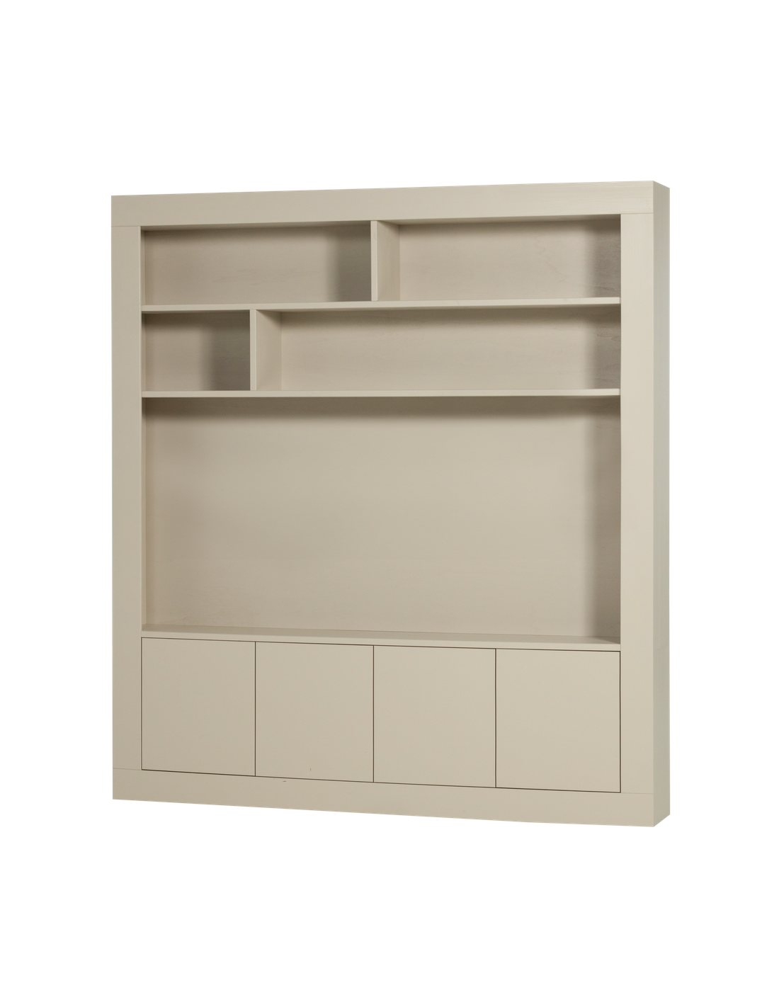 WALLCOVER Reol udført i et rustikt design af støvgrå lakeret fyrretræ. Den rustikke stil kendetegnes ved tydelige knaster fra træets naturlige fremtoning. Reolen måler 229 cm i højden og 210 x 31 cm i bredde og dybde. I reolen forefindes 4 skabslåger med push-to-open funktion.