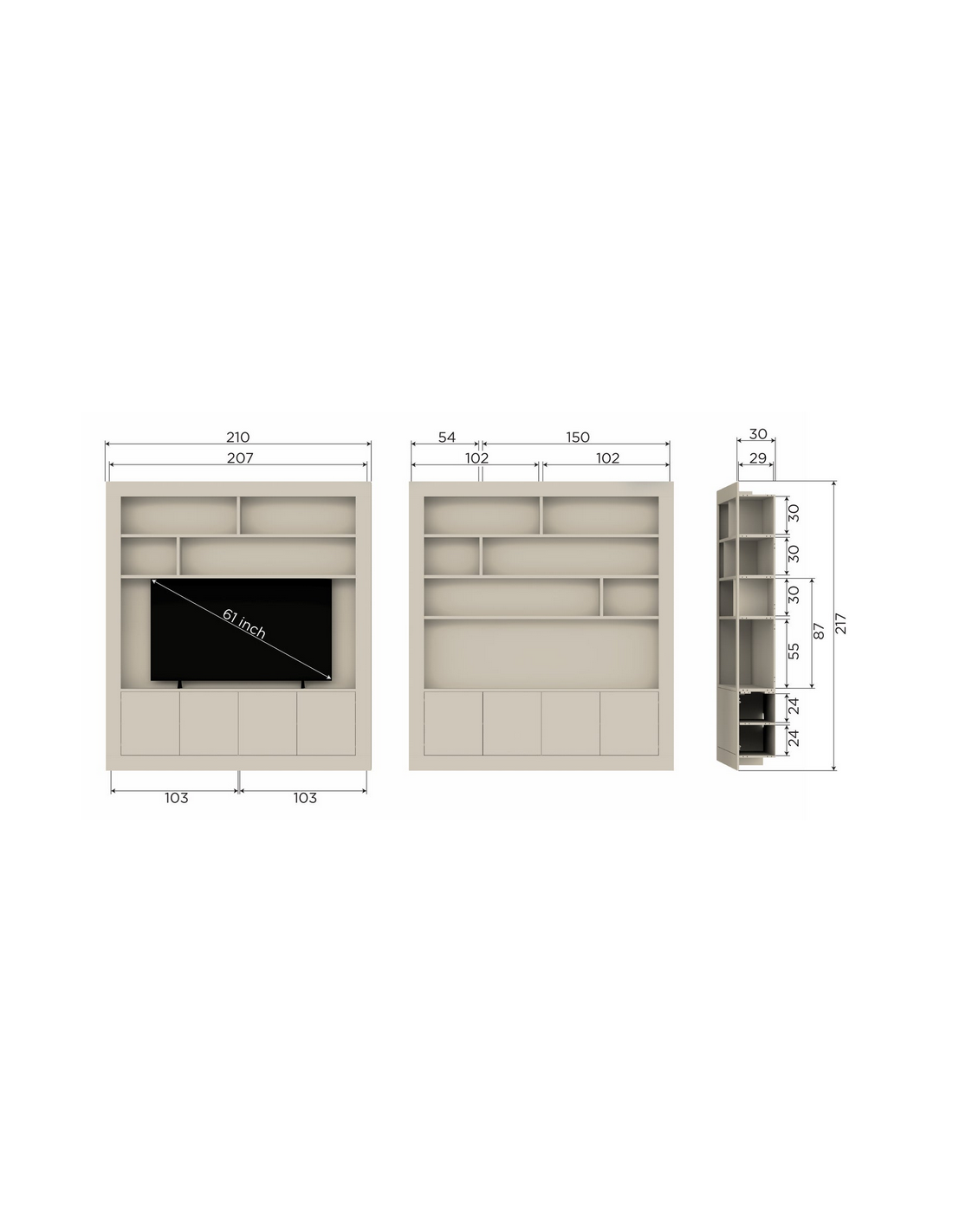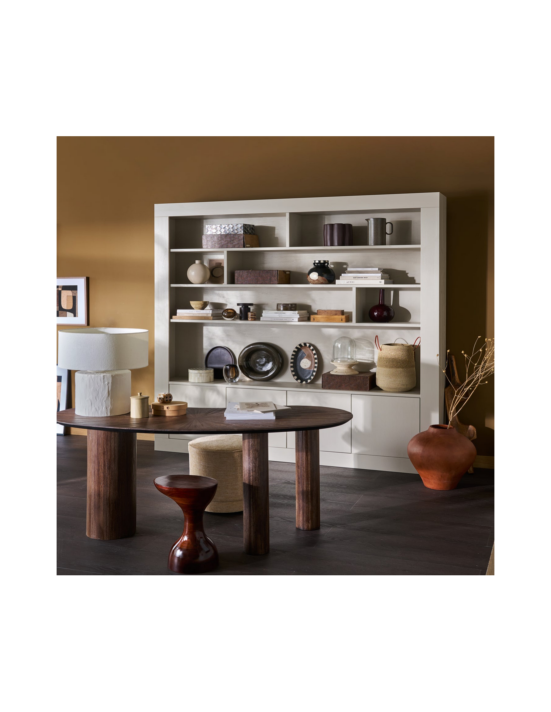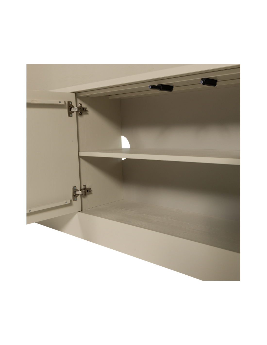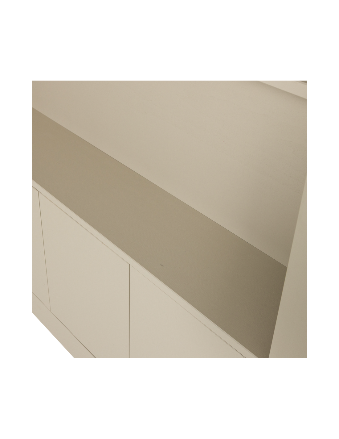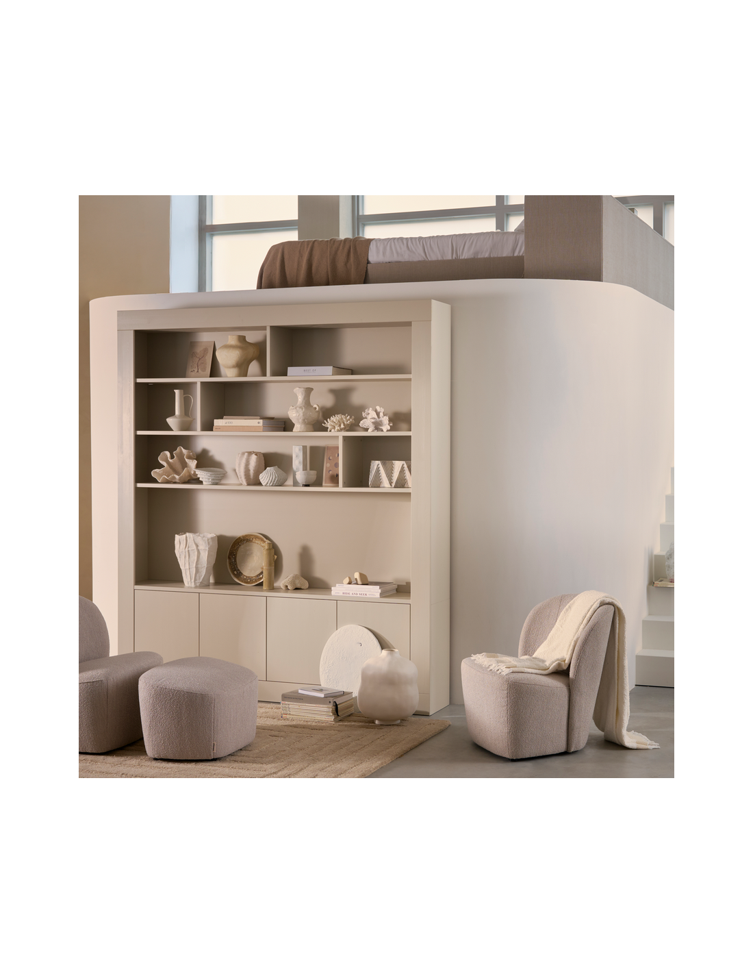 WALLCOVER Reol udført i et rustikt design af støvgrå lakeret fyrretræ. Den rustikke stil kendetegnes ved tydelige knaster fra træets naturlige fremtoning. Reolen måler 229 cm i højden og 210 x 31 cm i bredde og dybde. I reolen forefindes 4 skabslåger med push-to-open funktion.