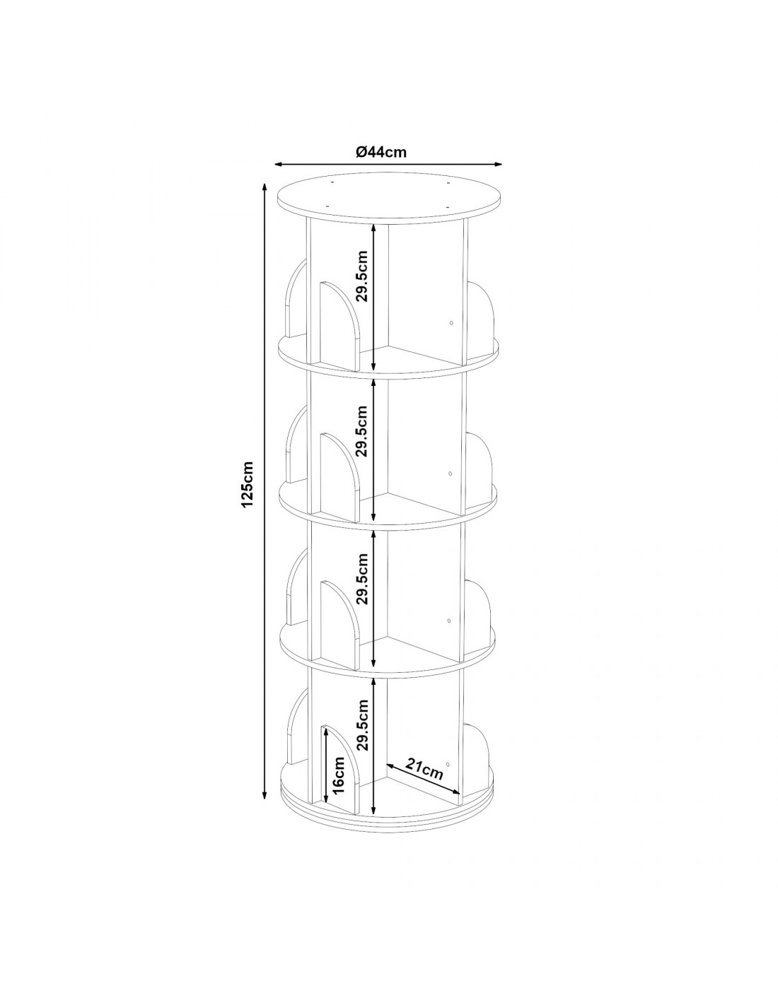 Rund bogreol på drejefod udført i et design af naturfarvet fyrretræ. Reolen måler 125 cm i højden og 44 cm i diameter.