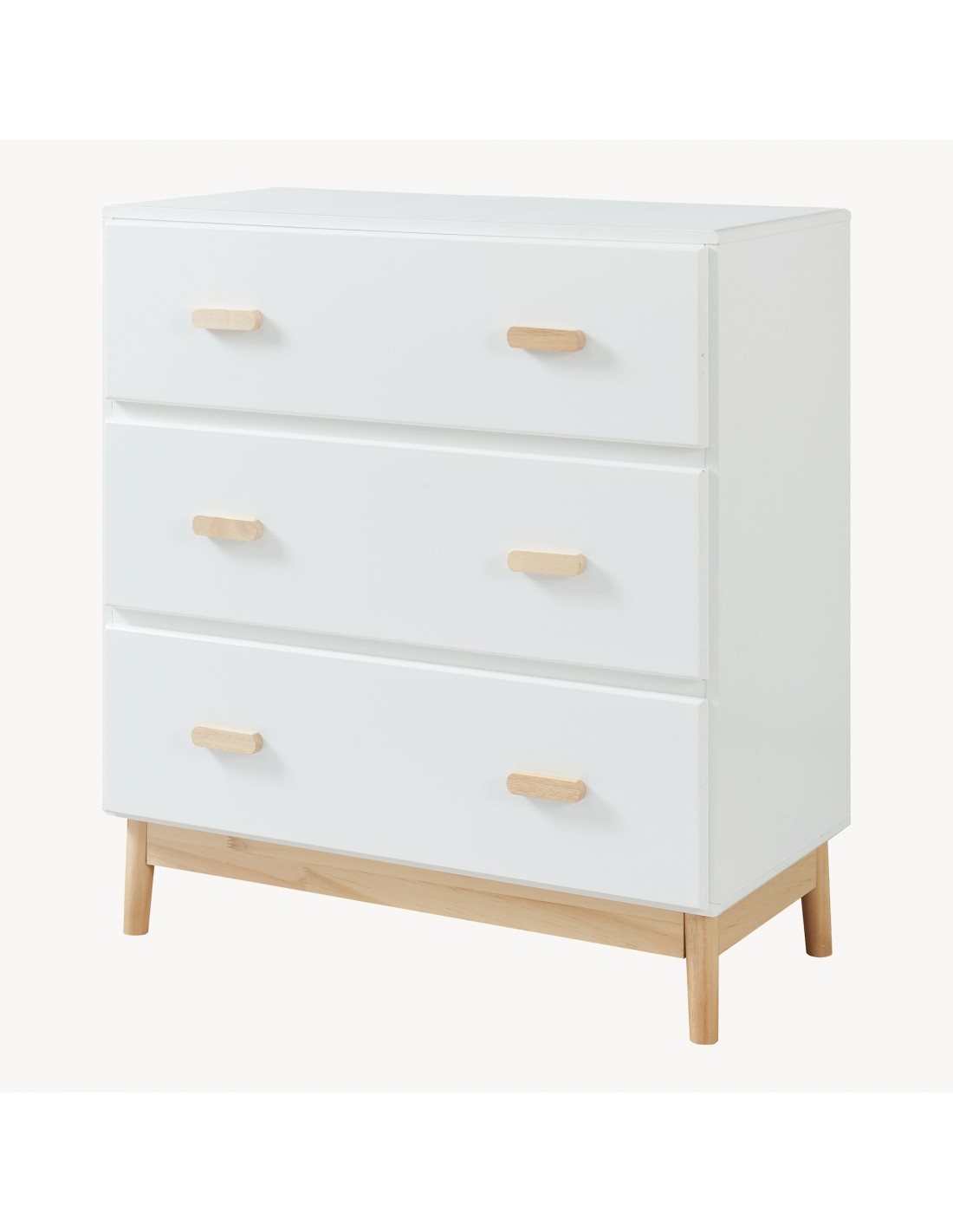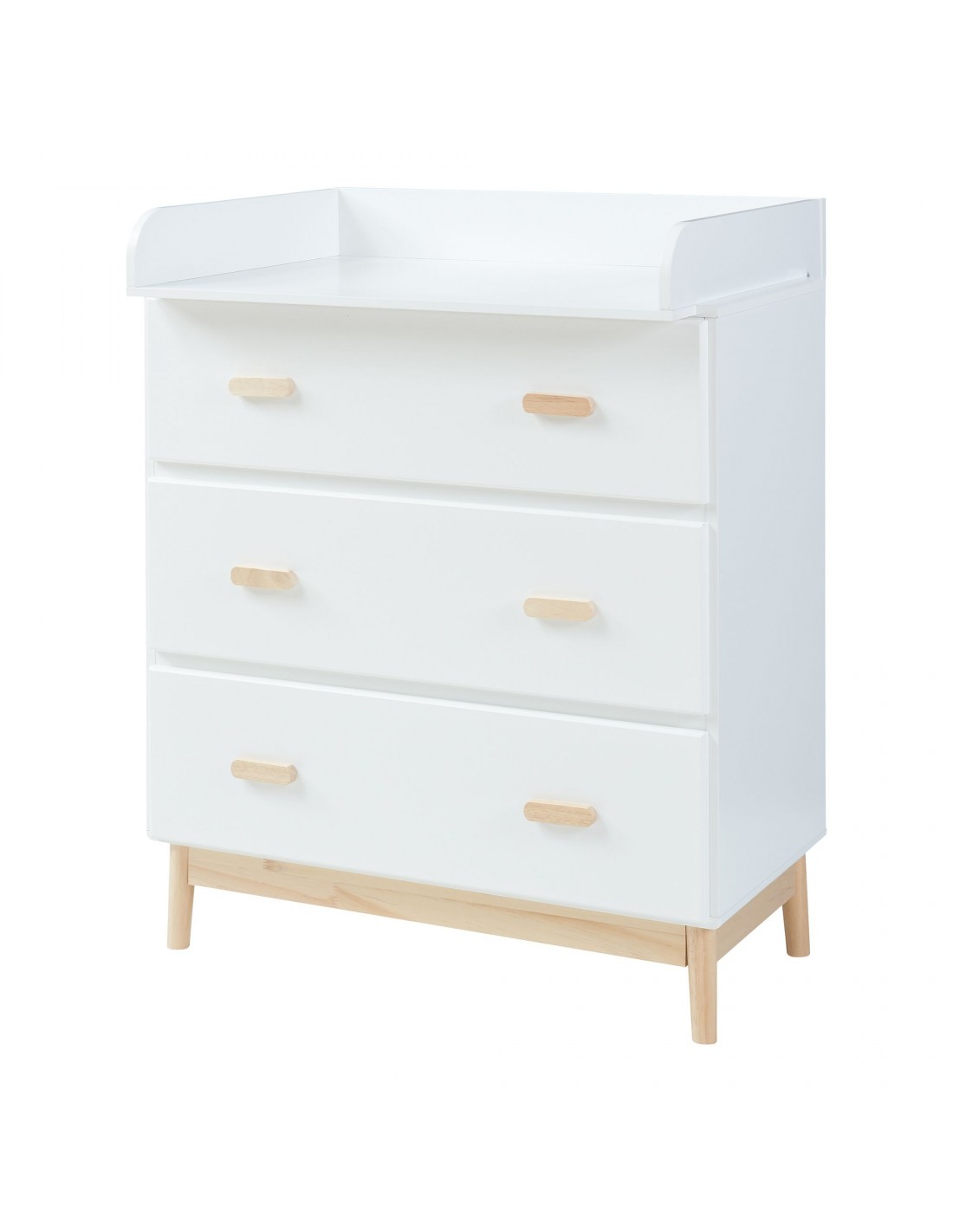 Puslekommode til børneværelset, udført i et design af hvid og naturfarvet MDF. Kommoden måler 90/100 cm i højden og 80 x 40/53 cm i bredde og dybde. I kommoden forefindes 3 skuffer med målene H23 x B72 cm.