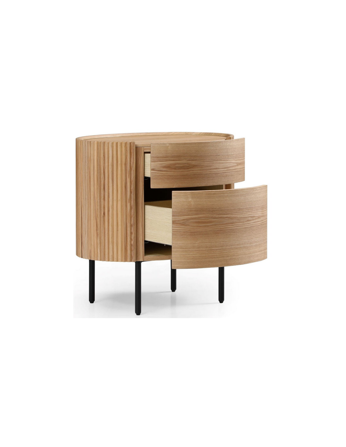 LANTINE Sengebord udført i et moderne design, fremstillet i et design af sortlakeret metal og egetræsfinér. Sengebordet måler 60,2 cm i højden og 58 x 44,2 cm i bredde og dybde og indeholder 2 skuffer med push-to-open funktion.