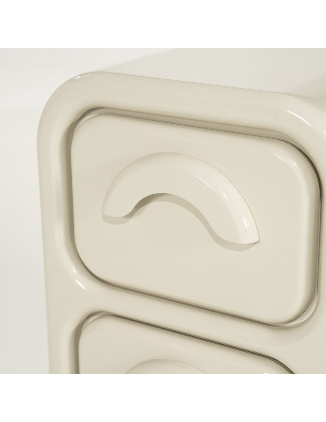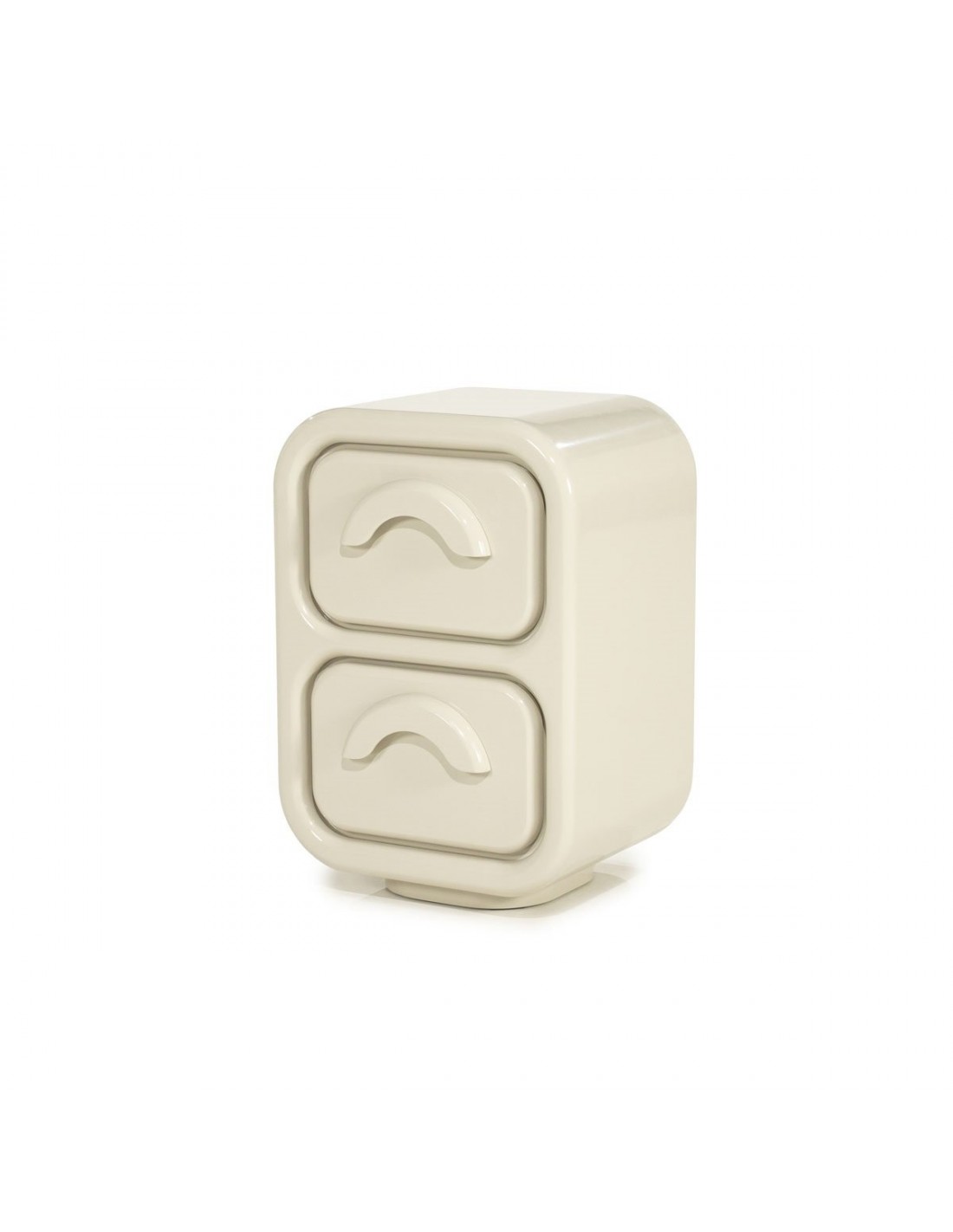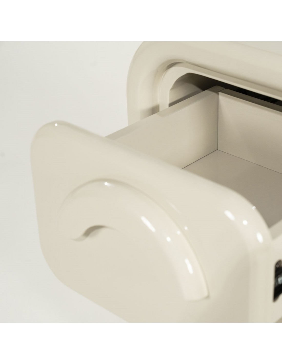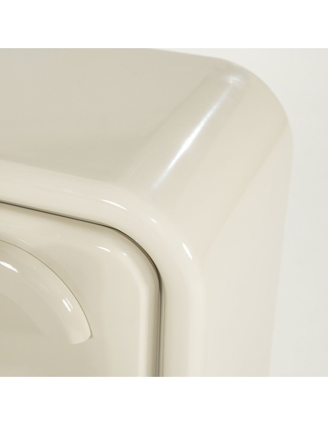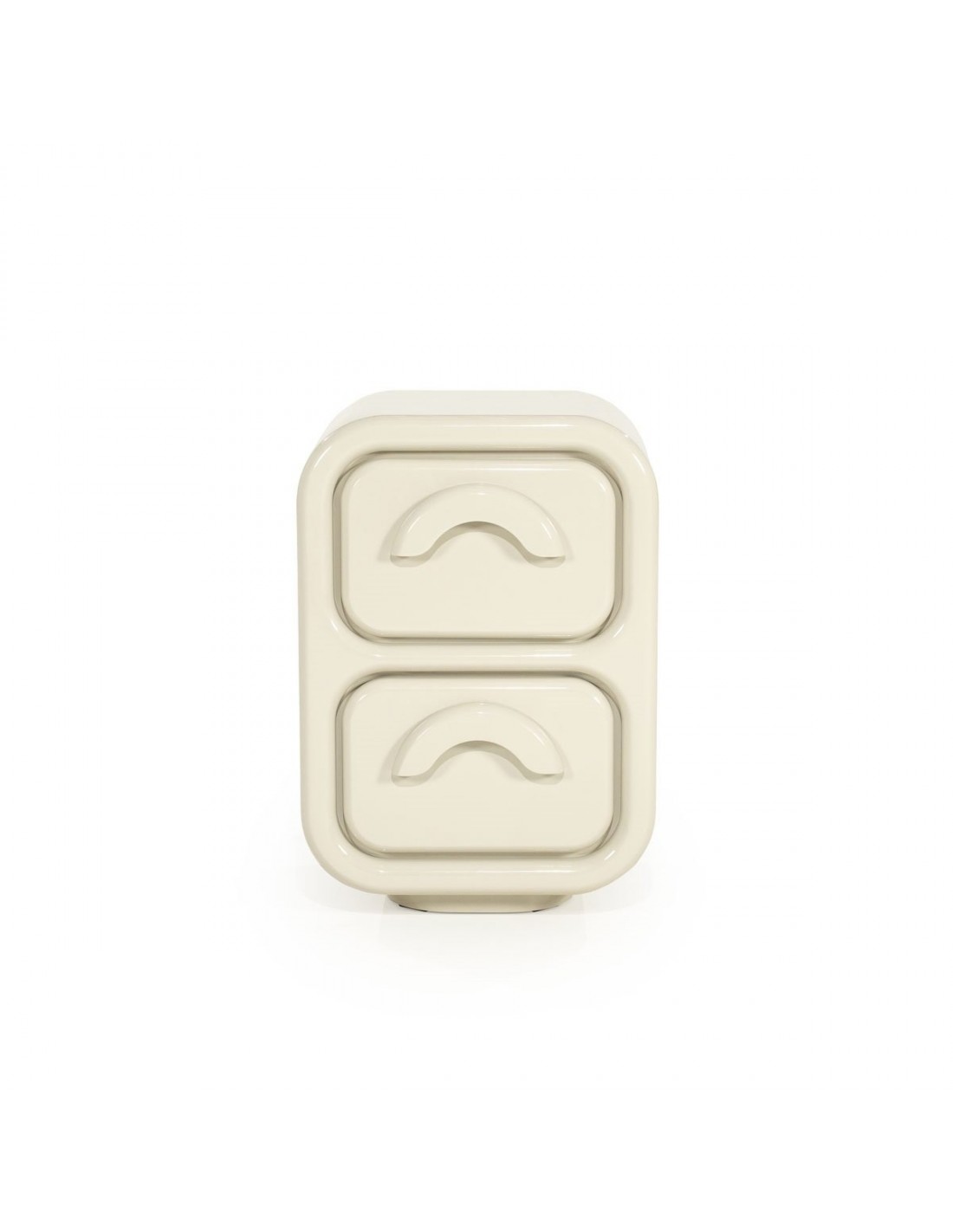 GUBBY Sengebord med 2 skuffer, udført i et retropræget design af beige højglans lakeret MDF. Sengebordet måler 58 cm i højden og 40,5 x 31,5 cm i bredde og dybde.