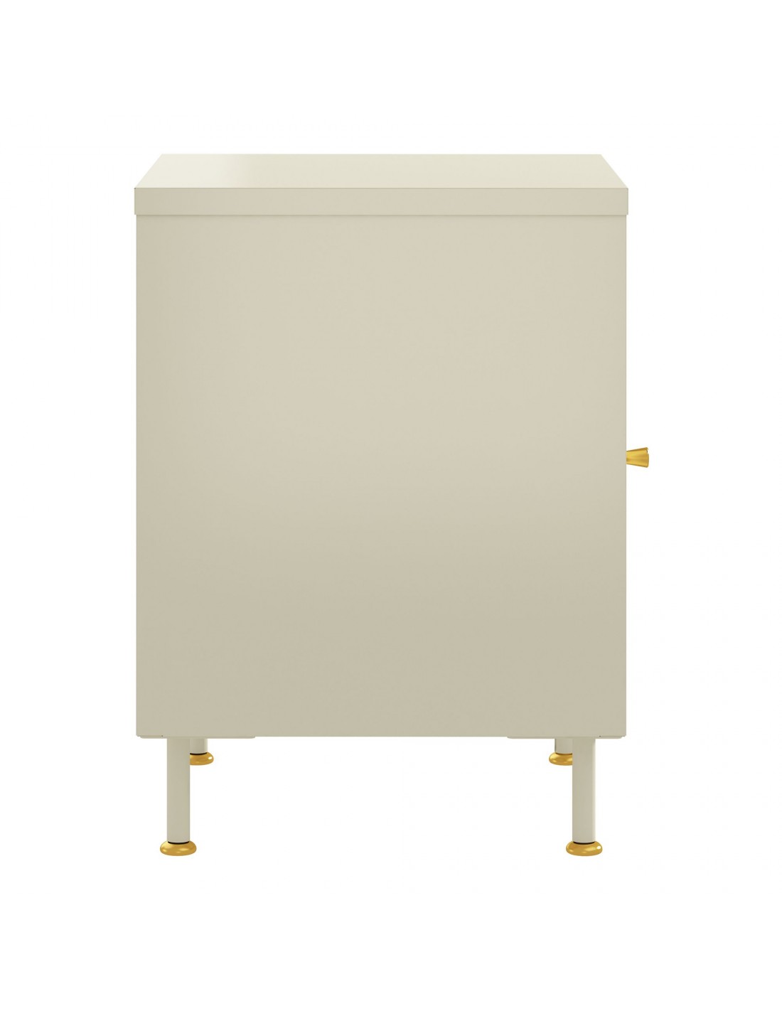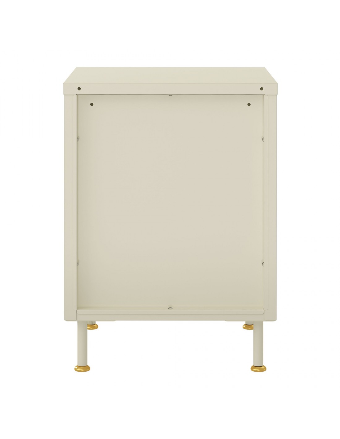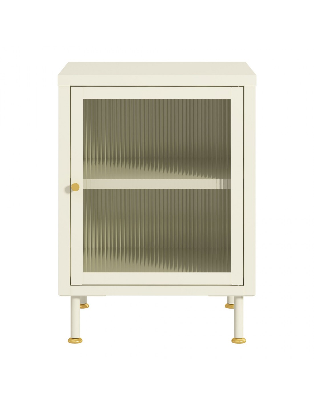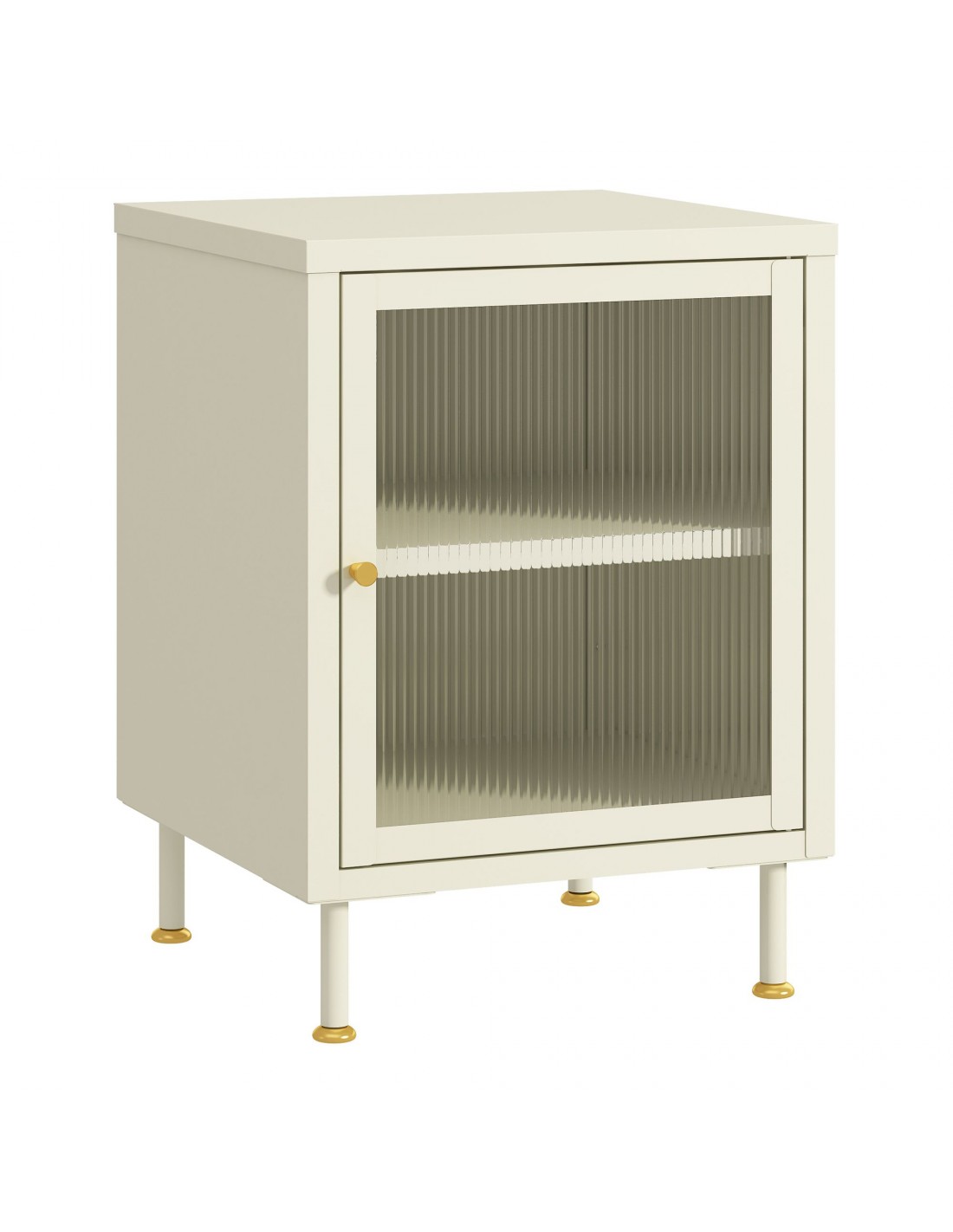 Sengebord udført i et moderne og Skandinavisk design af cremehvid lakeret stål og klart rillet glas. Sengebordet har skabslåge der åbner til højre (kan ikke spejlvendes). Sengebordet måler 56 cm i højden og 40 x 40 cm i bredde og dybde.