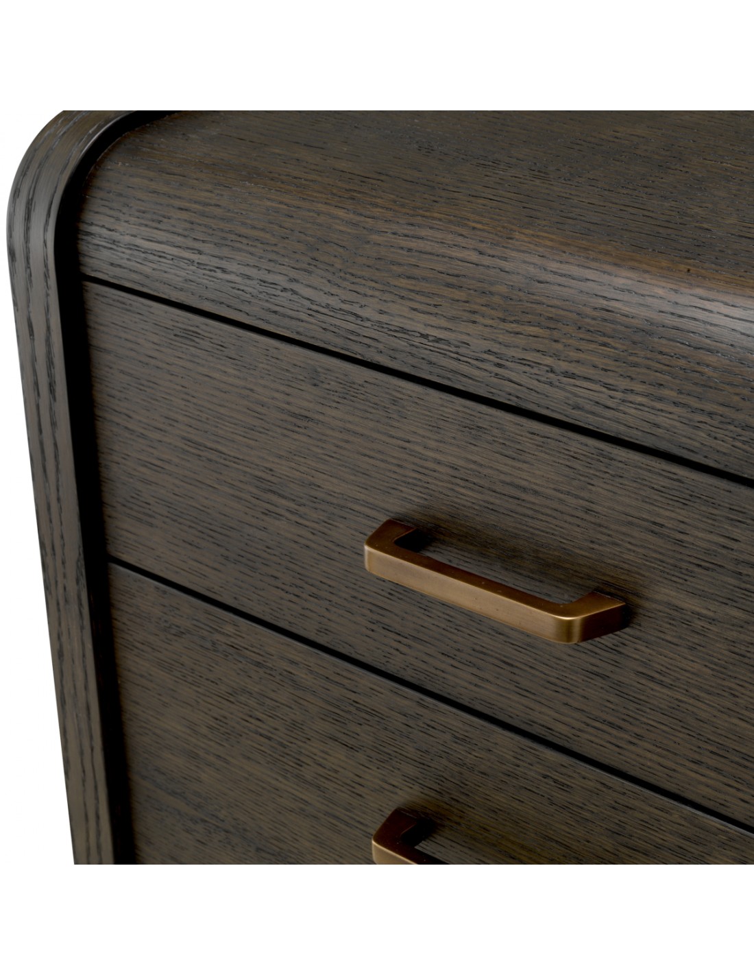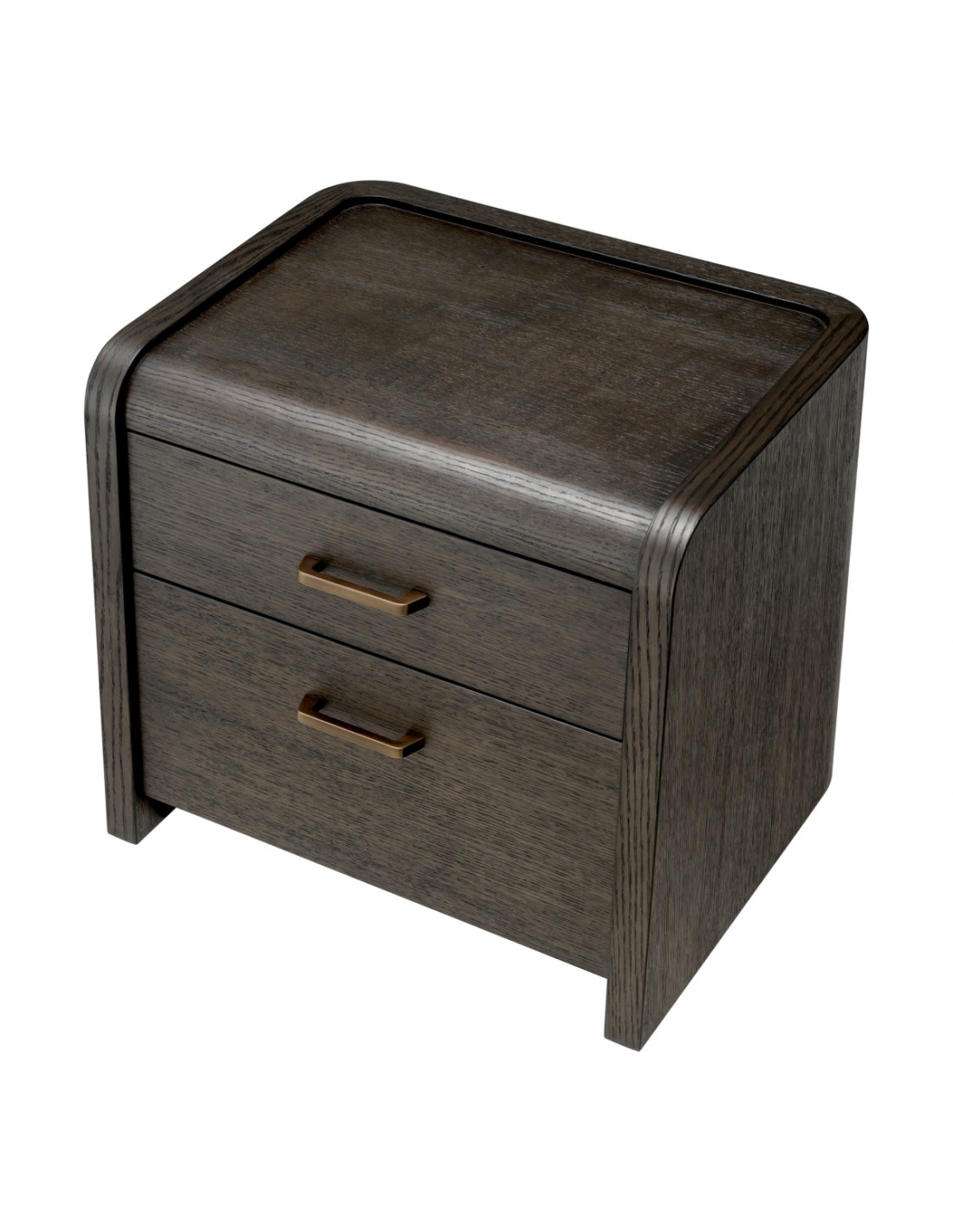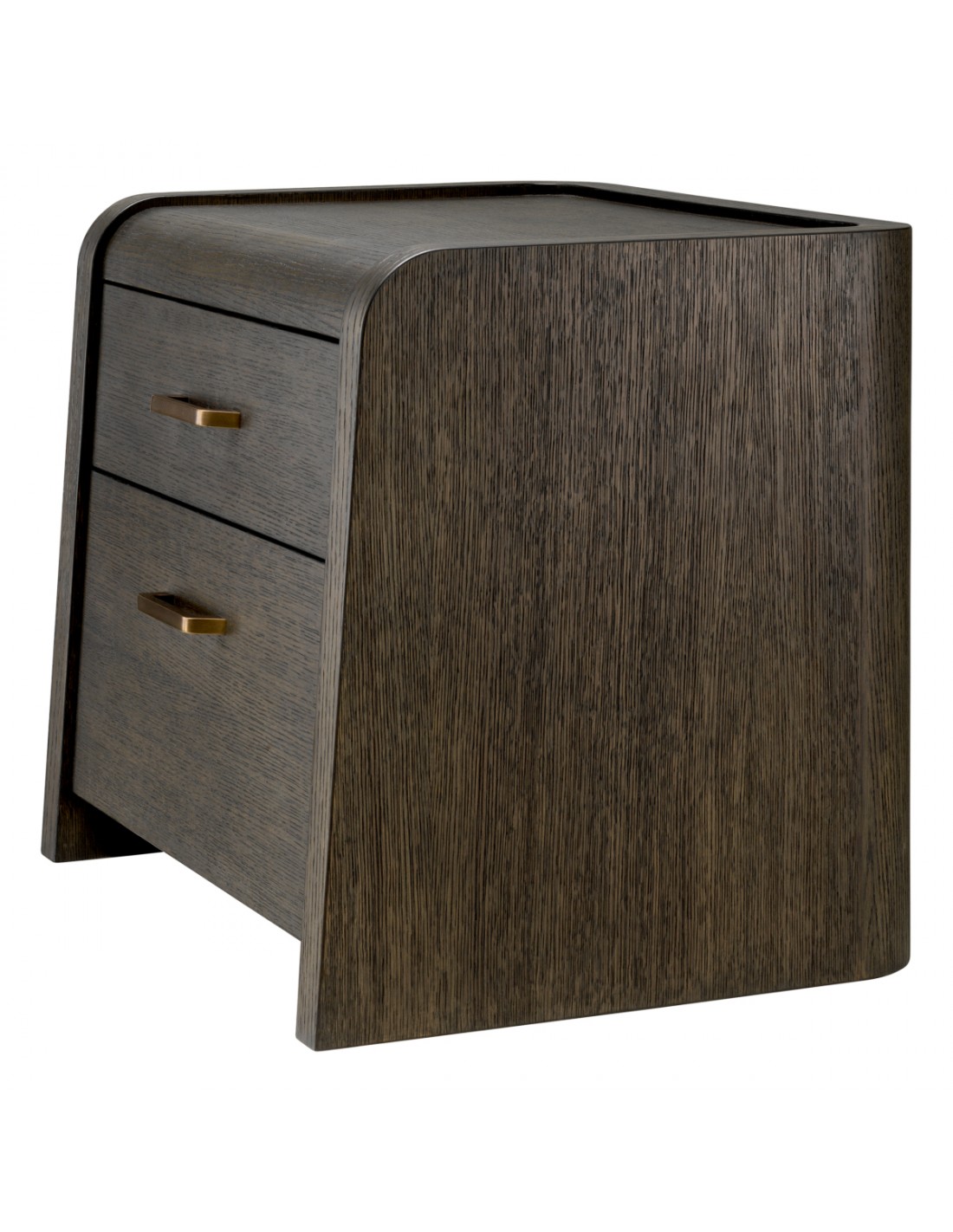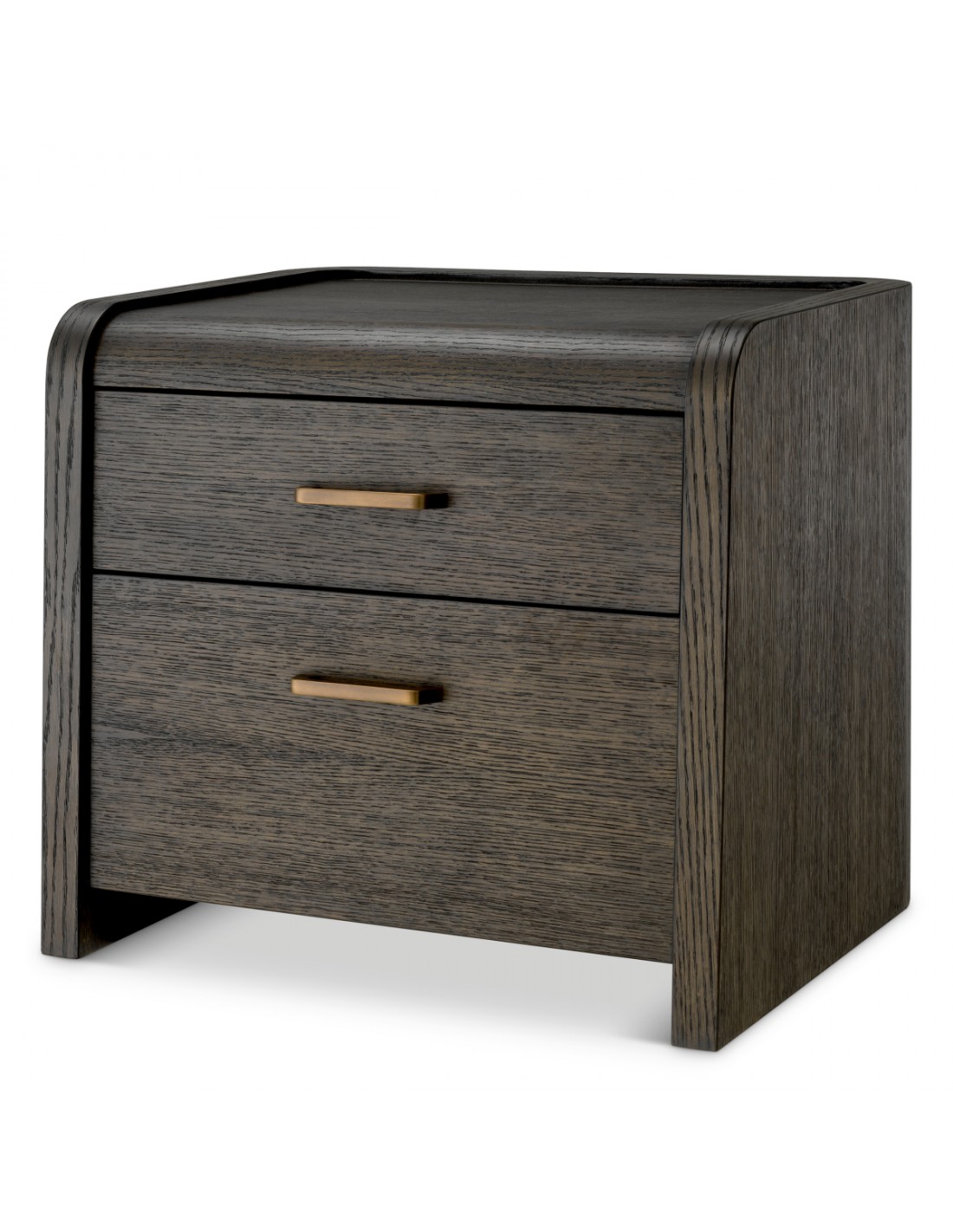 Eichholtz Joane sengebord udført i et luksuriøst og moderne design, fremstillet af antik bronzelakeret stål og mokkabrun egetræsfinér med 2 skuffer. Sengebordet måler 53,5 cm i højden og 60 x 49 cm i bredde og dybde.