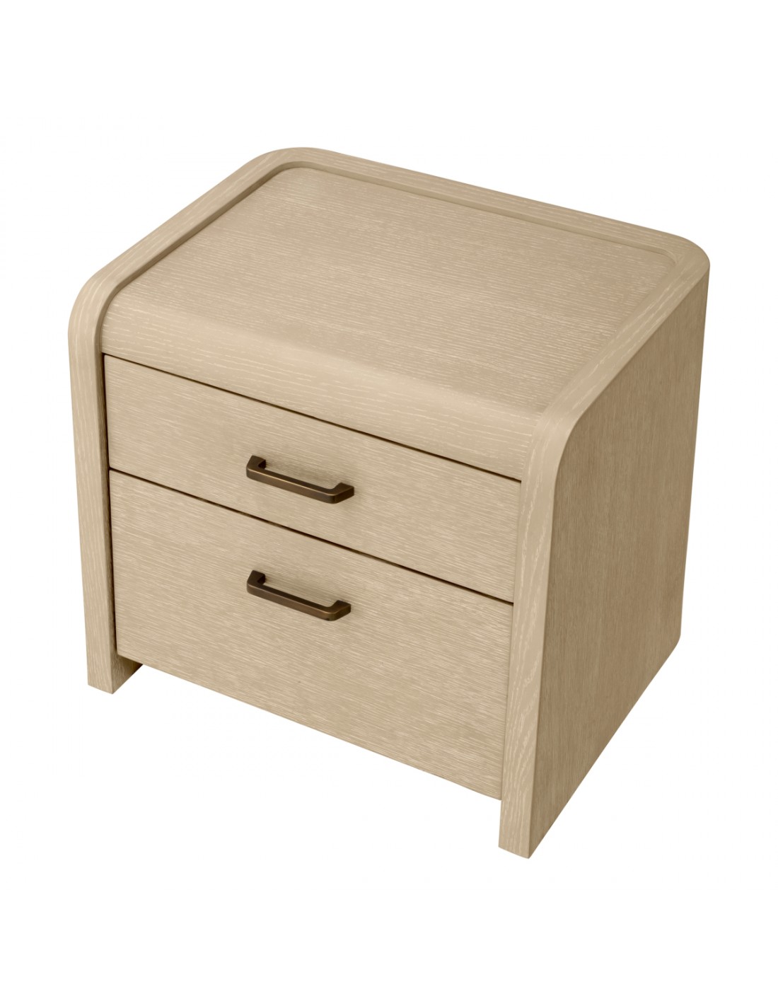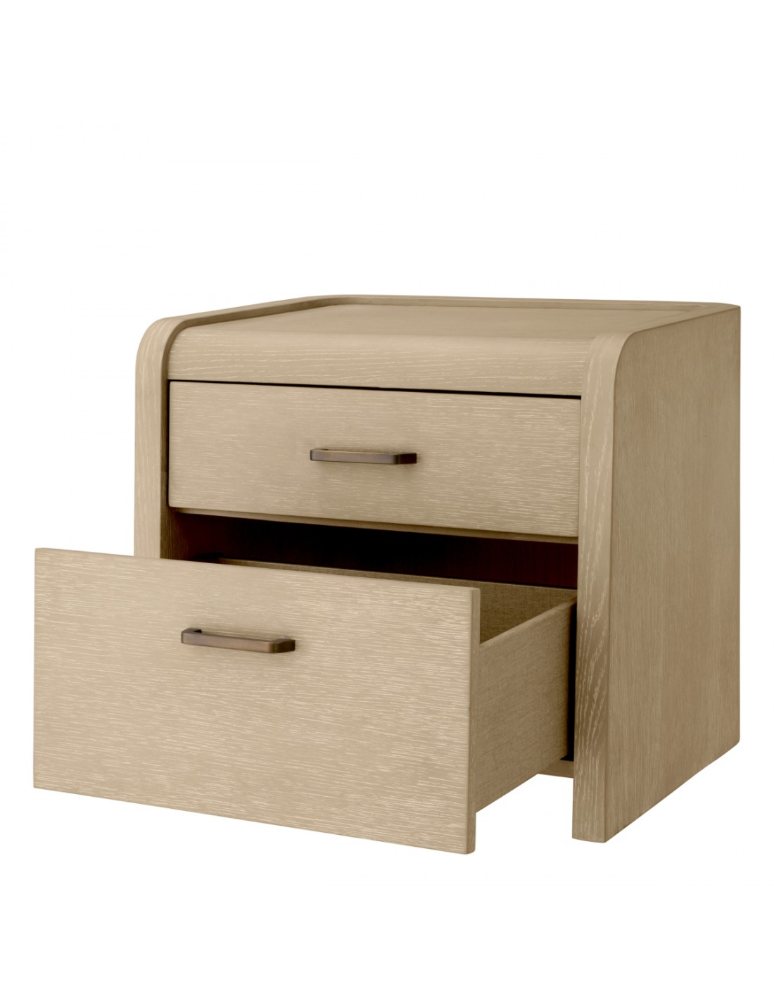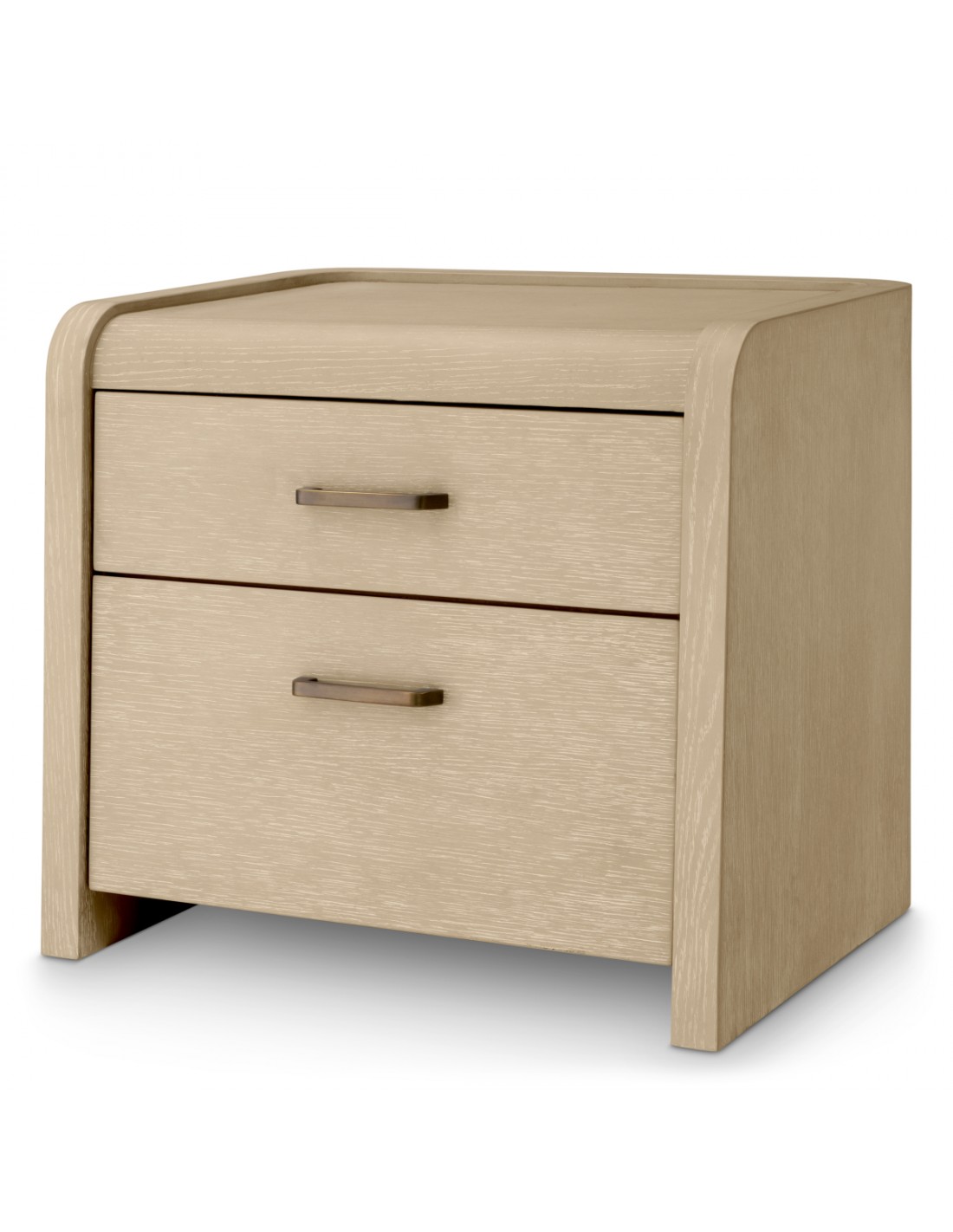 Eichholtz Joane sengebord udført i et luksuriøst og moderne design, fremstillet af antik bronzelakeret stål og vasket egetræsfinér med 2 skuffer. Sengebordet måler 53,5 cm i højden og 60 x 49 cm i bredde og dybde.