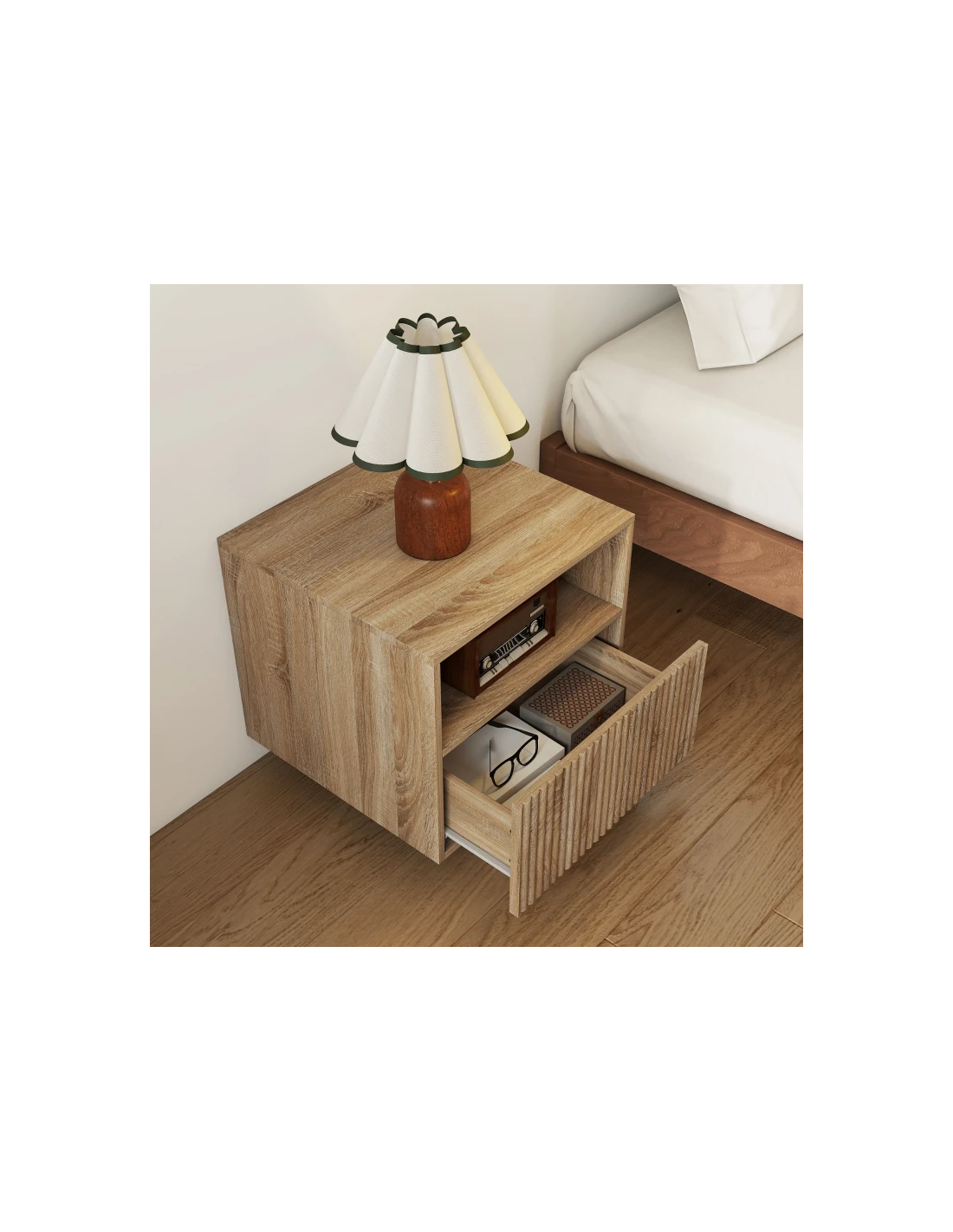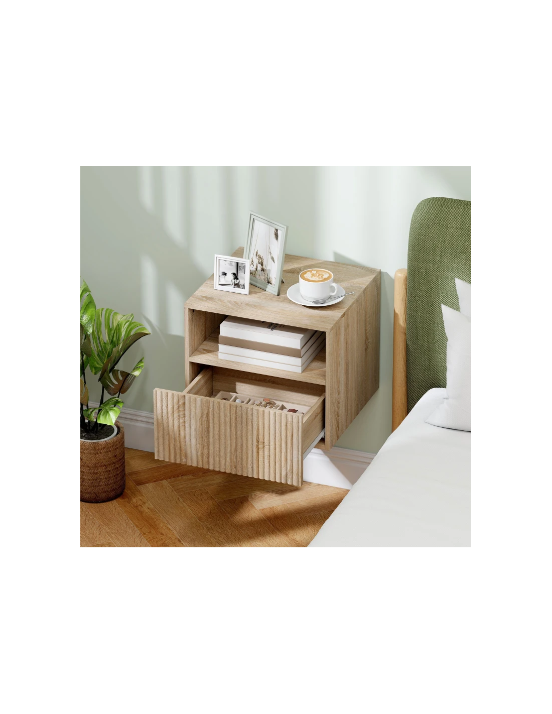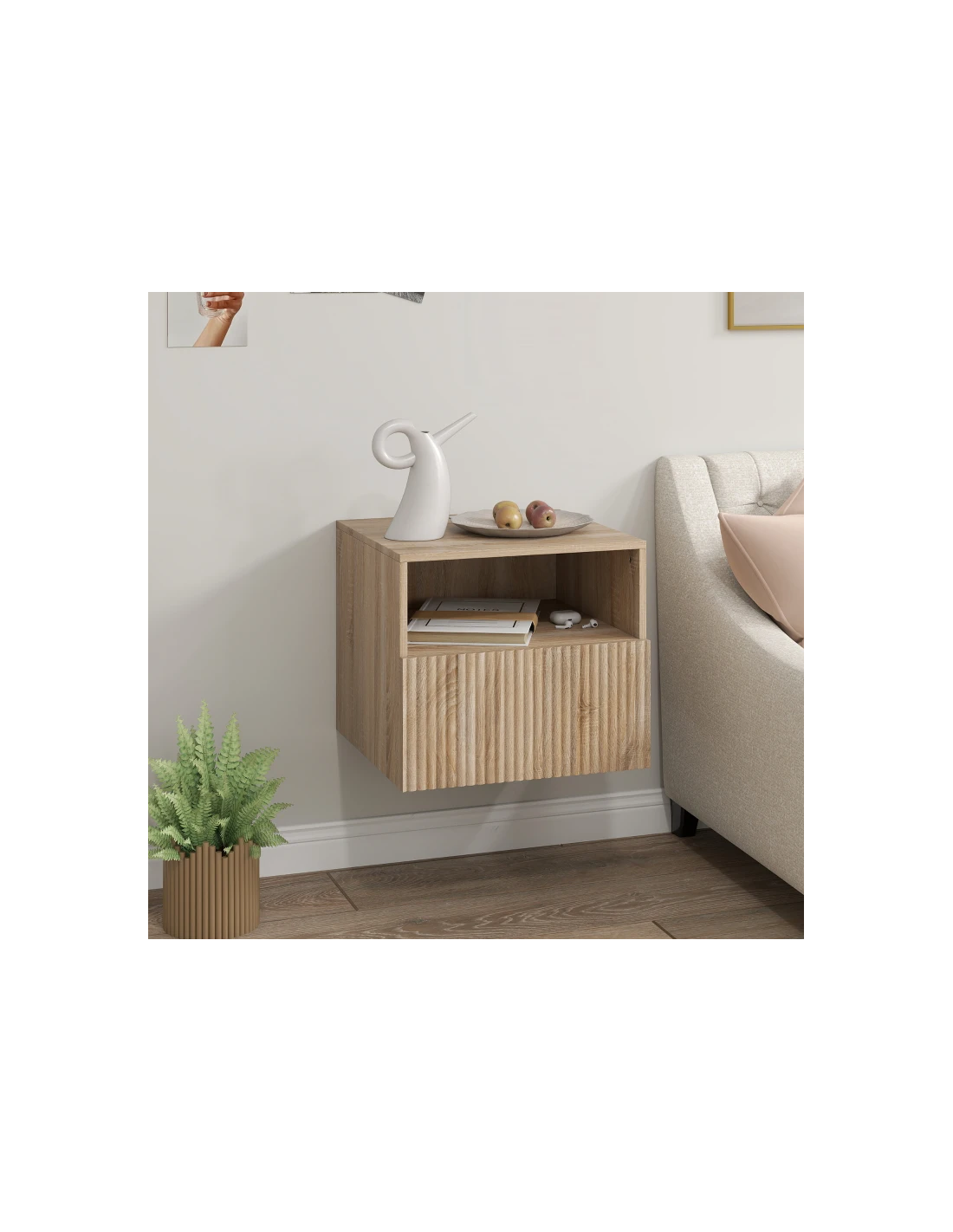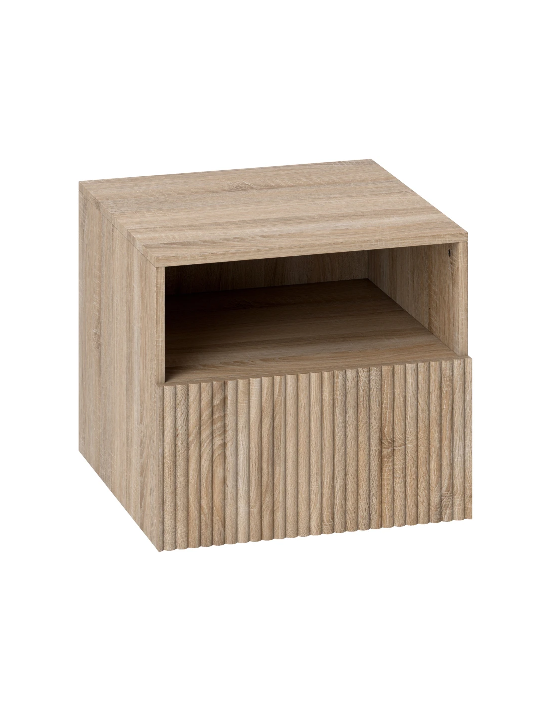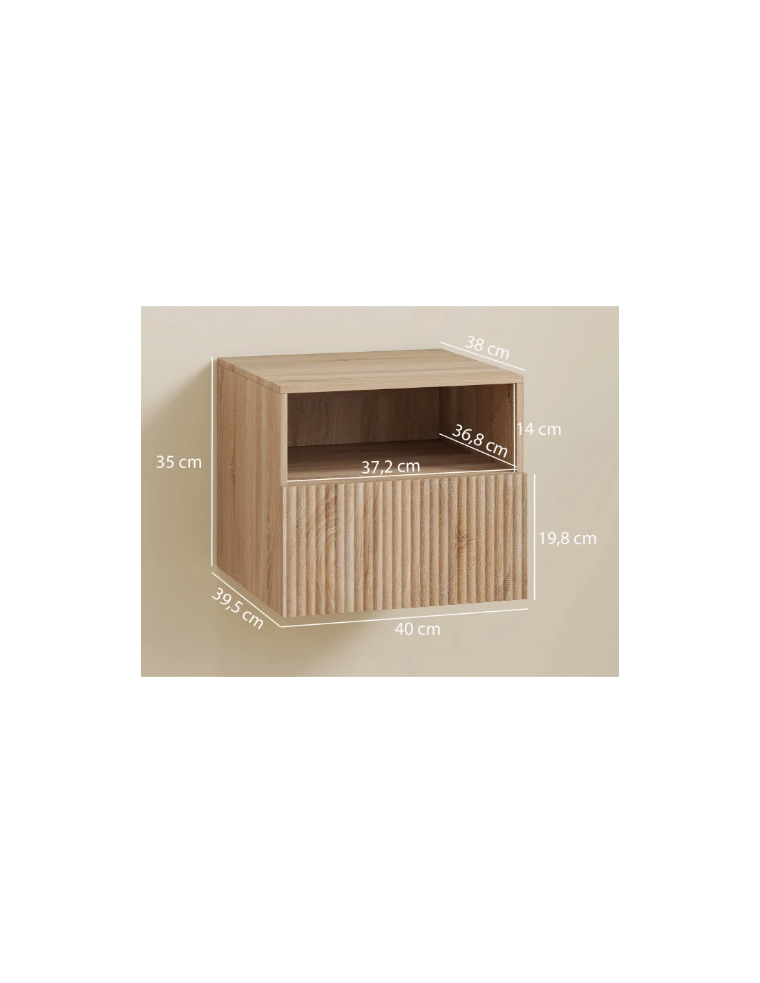 Væghængt sengebord udført i et moderne design af naturbrun MDF og møbelplade. Sengebordet måler 35 cm i højden og 40 x 39,5 cm i bredde og dybde og har grebsfri skuffefront.