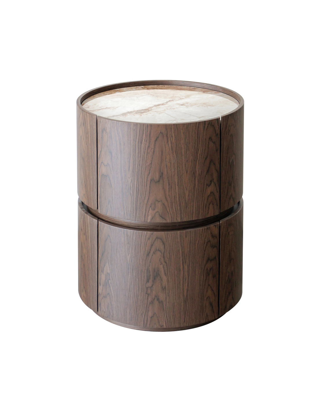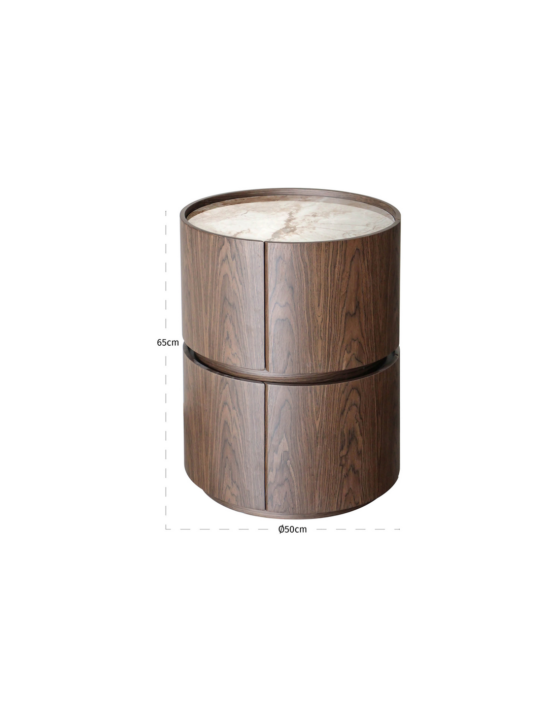 ELLERY Sengebord udført i et smukt og stilrent design, fra hollandske Richmond Interiors. Sengebordet er fremstillet af brunlakeret egetræsfinér og MDF med topplade i beige marmoriseret keramik. Sengebordet har 2 skuffer og måler 65 cm i højden og 50 cm i diameter.
