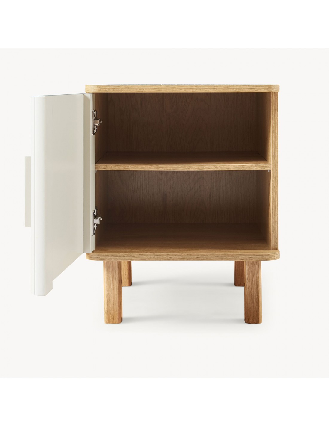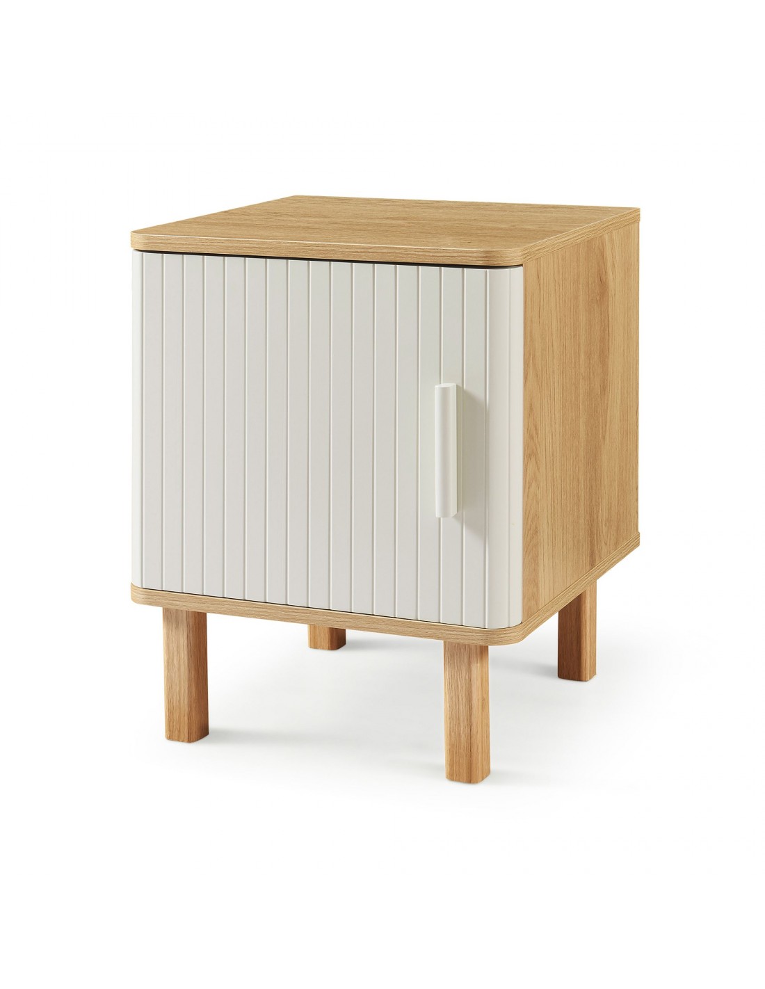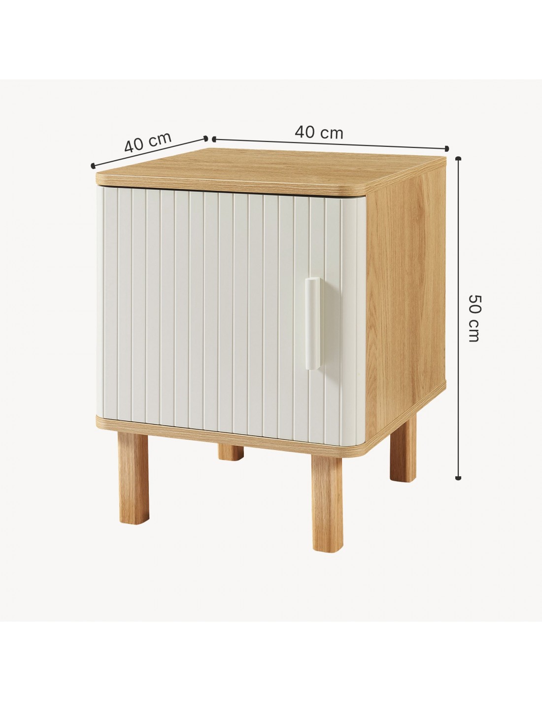 Sengebord udført i et moderne og Skandinavisk design af egetræsfarvet fyrretræ og MDF med skuffer i sandfarvet MDF. Sengebordet har 1 skabslåge der gemmer på 2 hylderum, og måler 50 cm i højden og 40 x 40 cm i bredde og dybde. Skabslågen kan ikke spejlvendes.