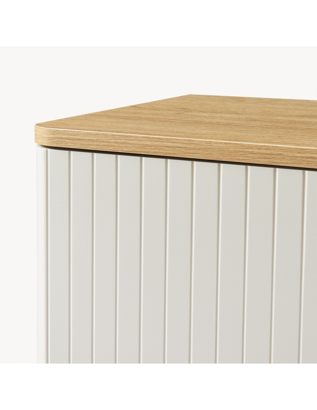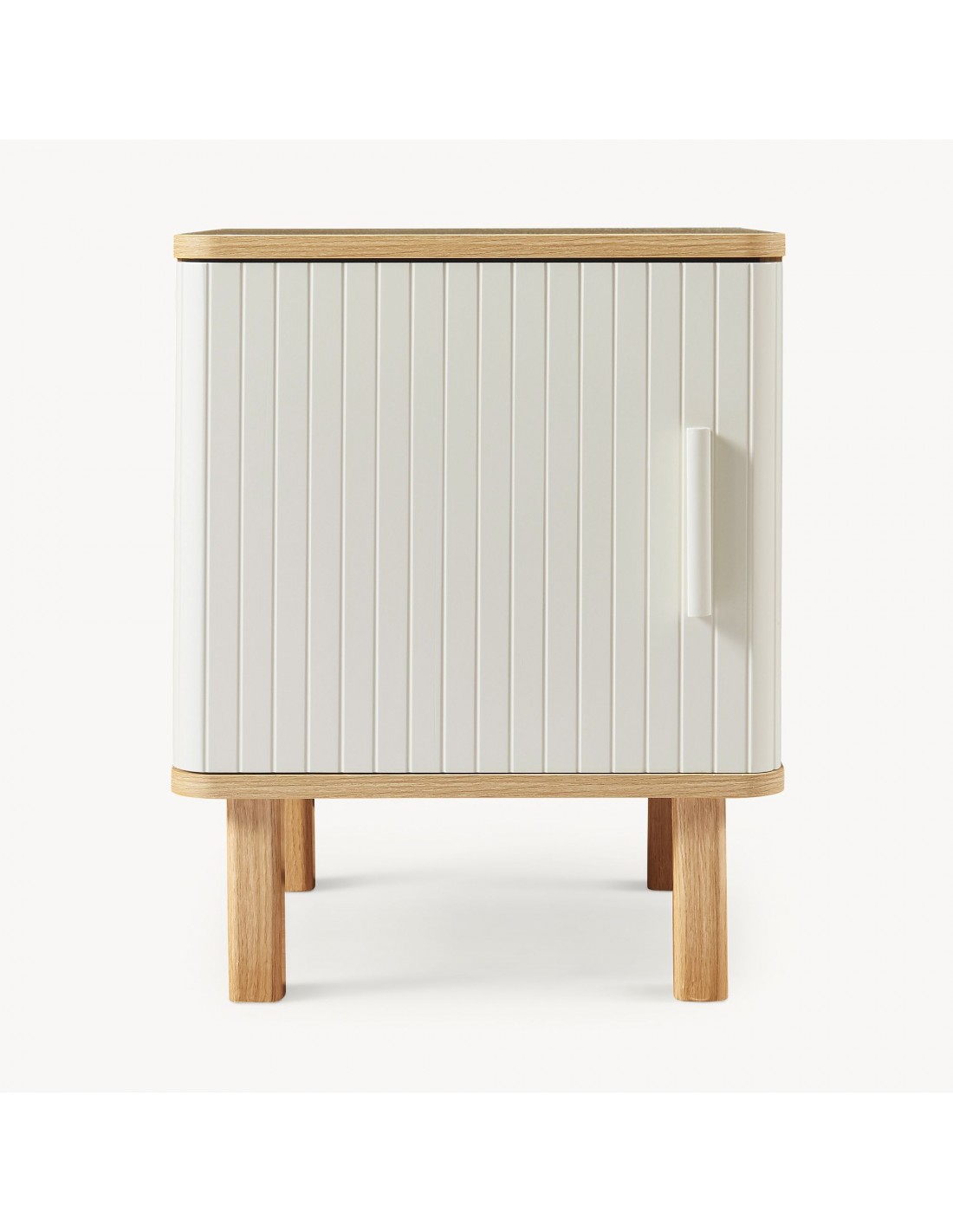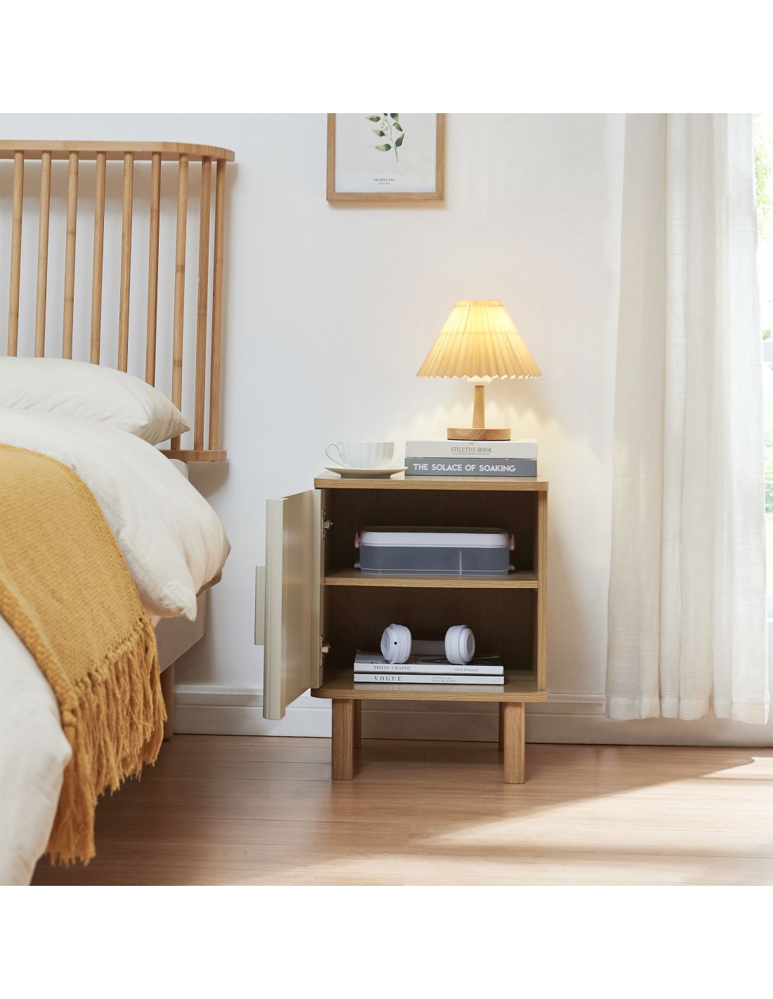 Sengebord udført i et moderne og Skandinavisk design af egetræsfarvet fyrretræ og MDF med skuffer i sandfarvet MDF. Sengebordet har 1 skabslåge der gemmer på 2 hylderum, og måler 50 cm i højden og 40 x 40 cm i bredde og dybde. Skabslågen kan ikke spejlvendes.