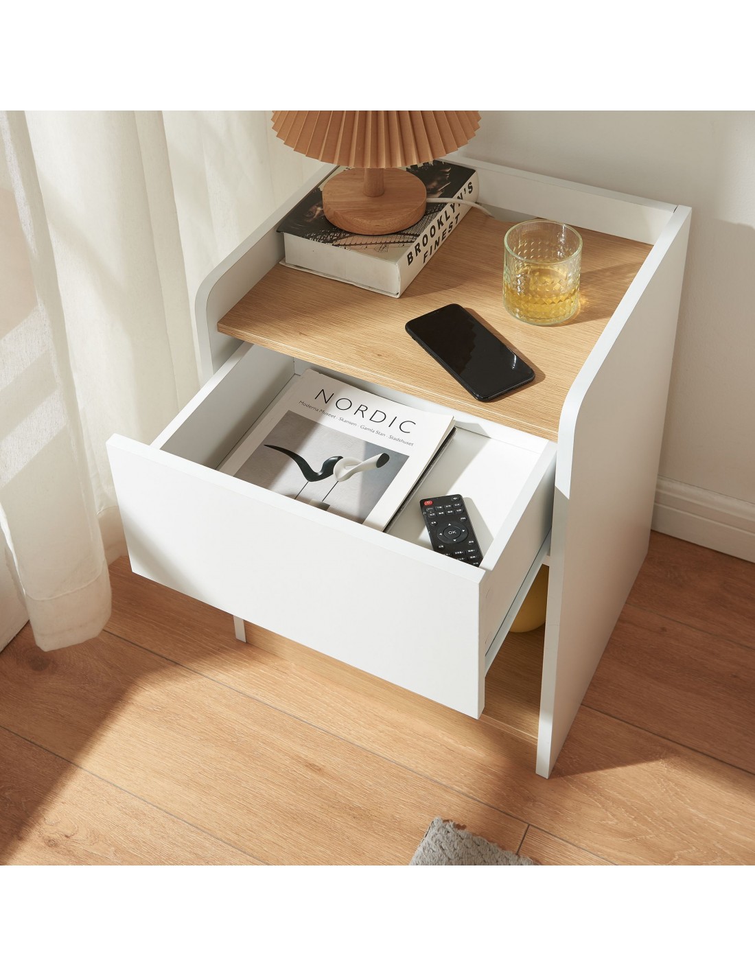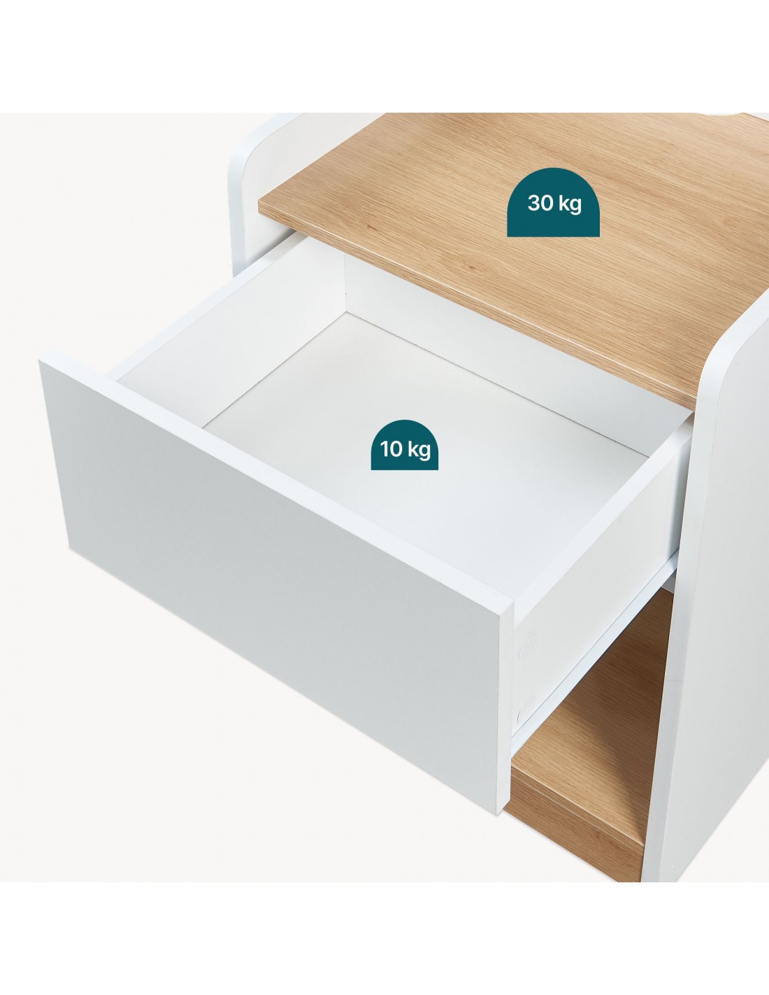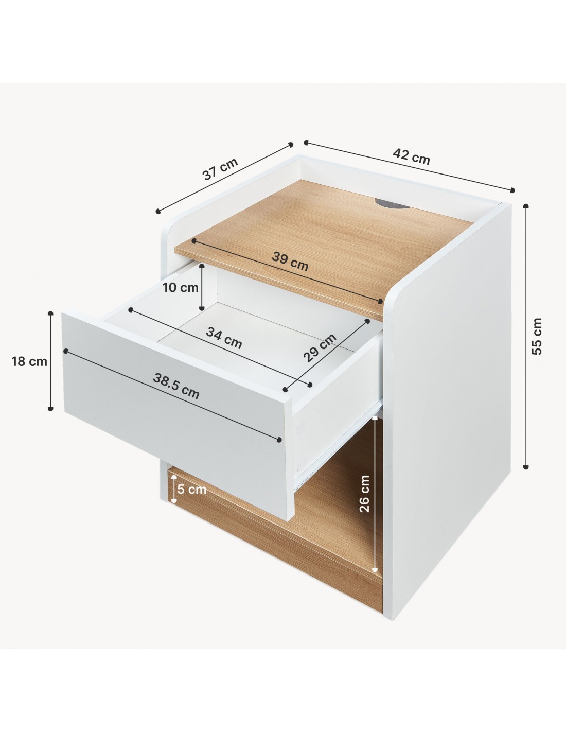 Sengebord udført i et moderne og Skandinavisk design af hvid- og egetræsfarvet MDF med skuffe. Sengebordet måler 55 cm i højden og 42 x 37 cm i bredde og dybde.