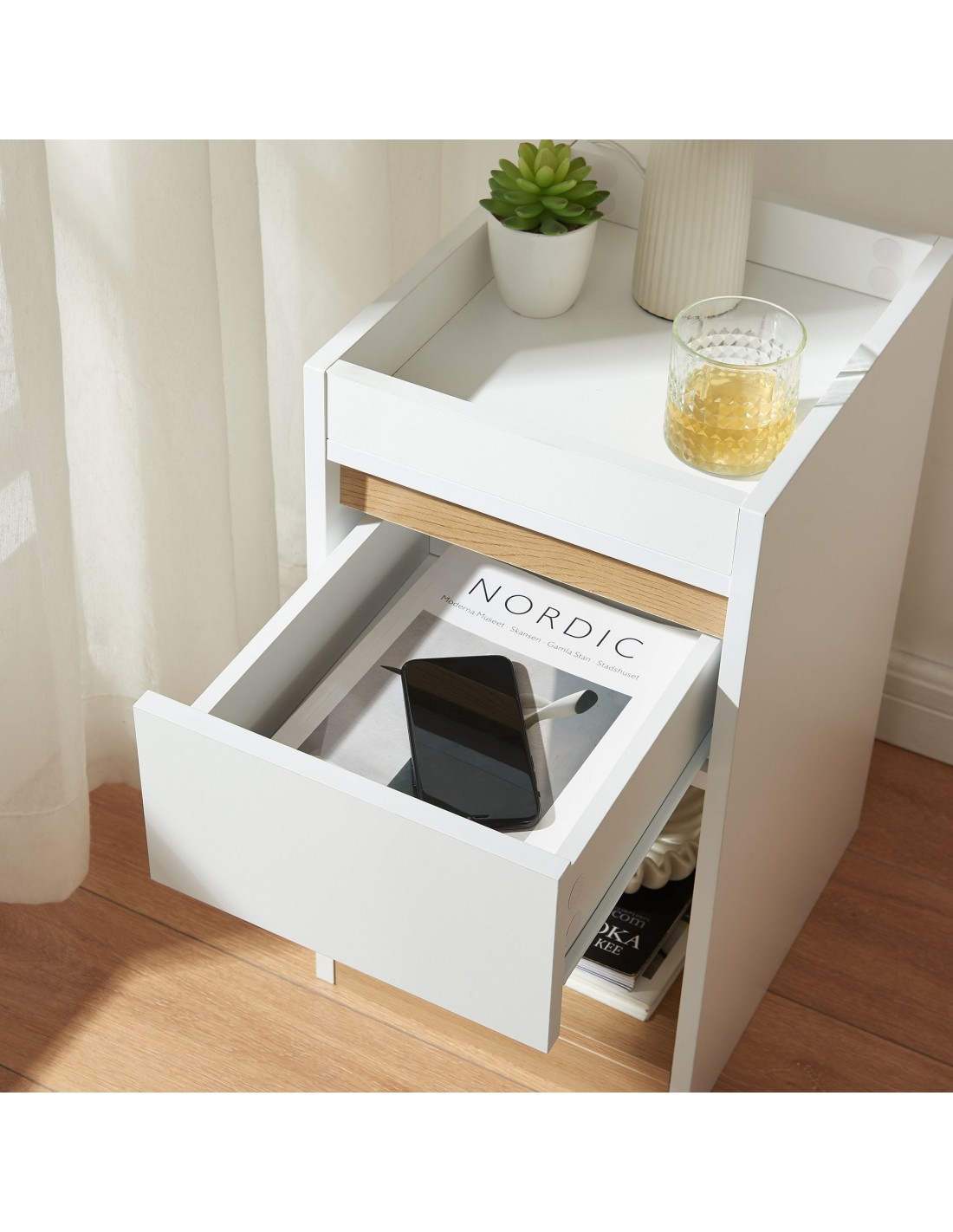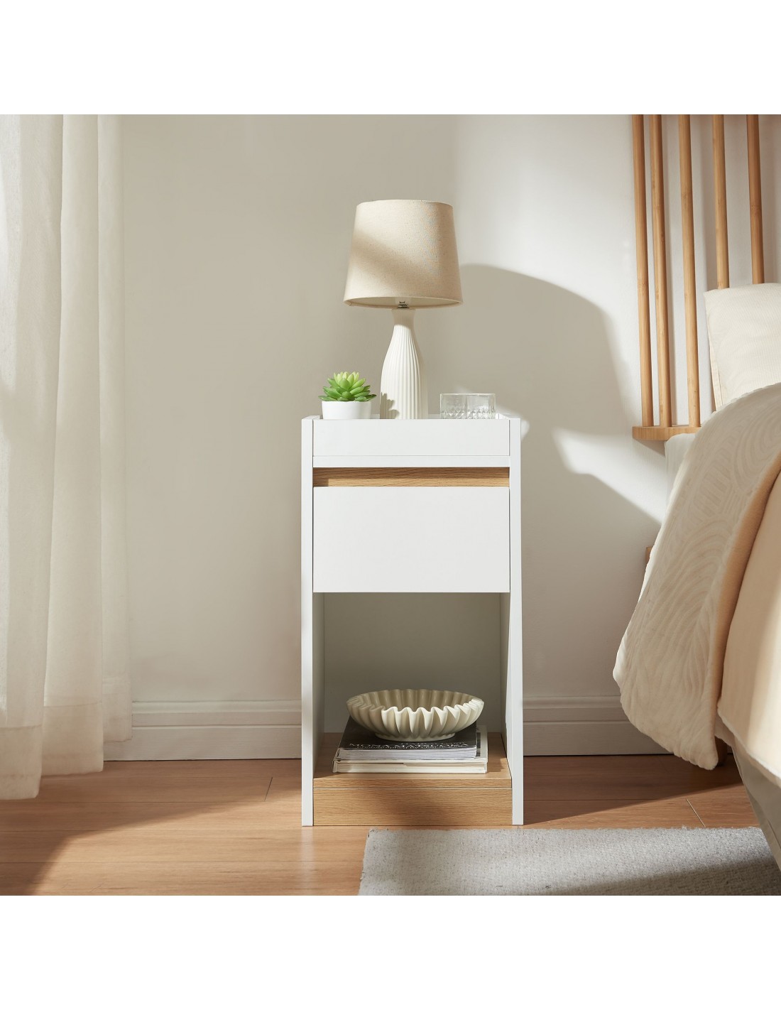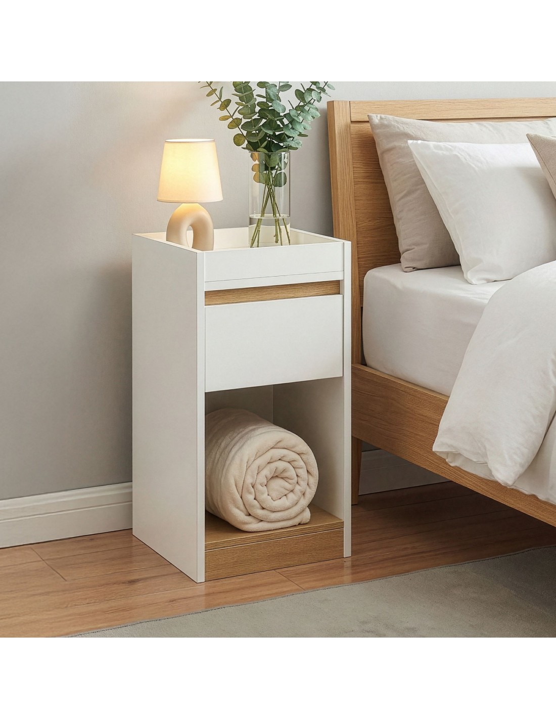 Sengebord udført i et moderne og Skandinavisk design af hvid- og egetræsfarvet MDF med skuffe. Sengebordet måler 55 cm i højden og 30 x 35 cm i bredde og dybde.