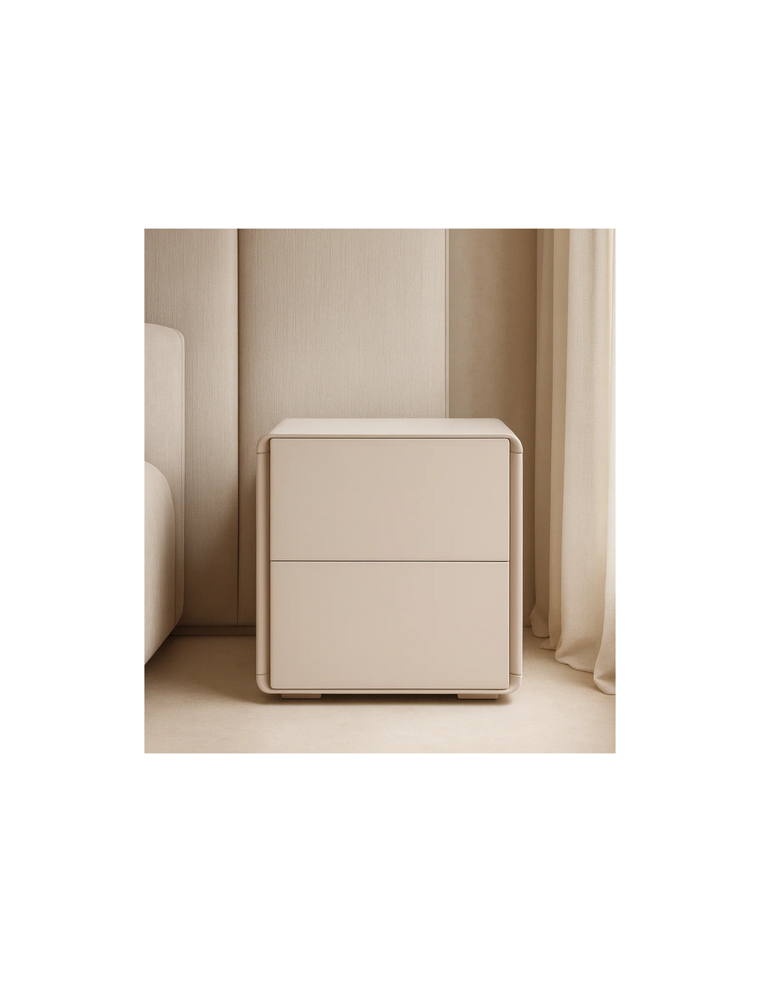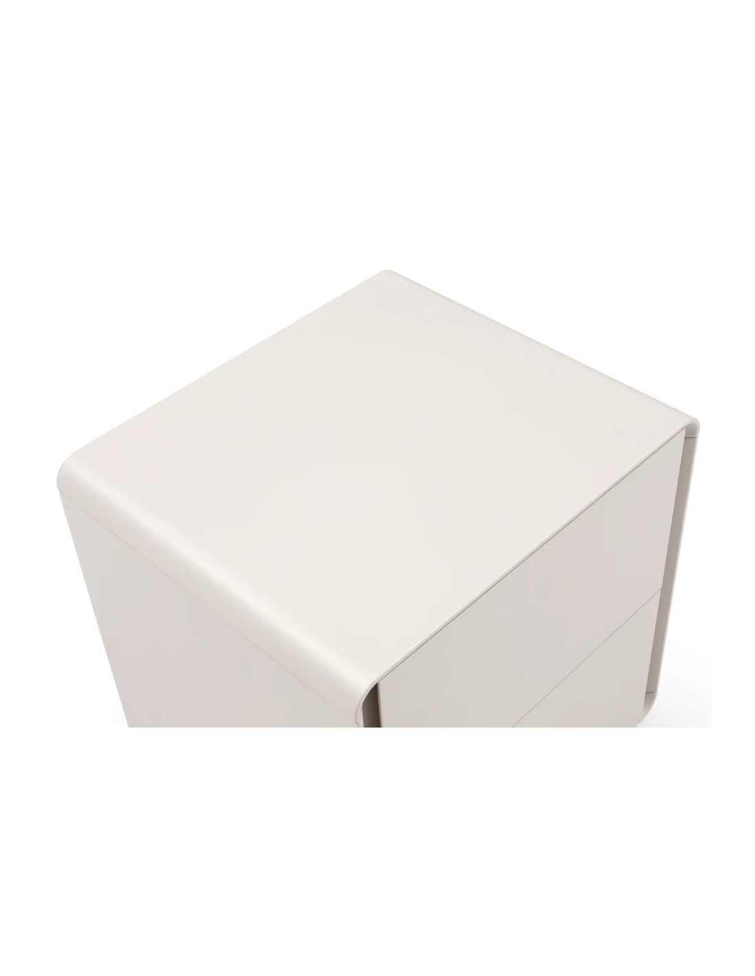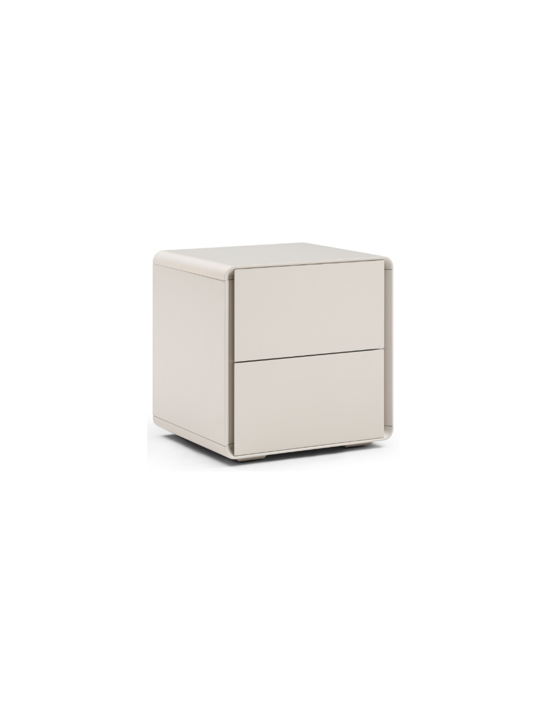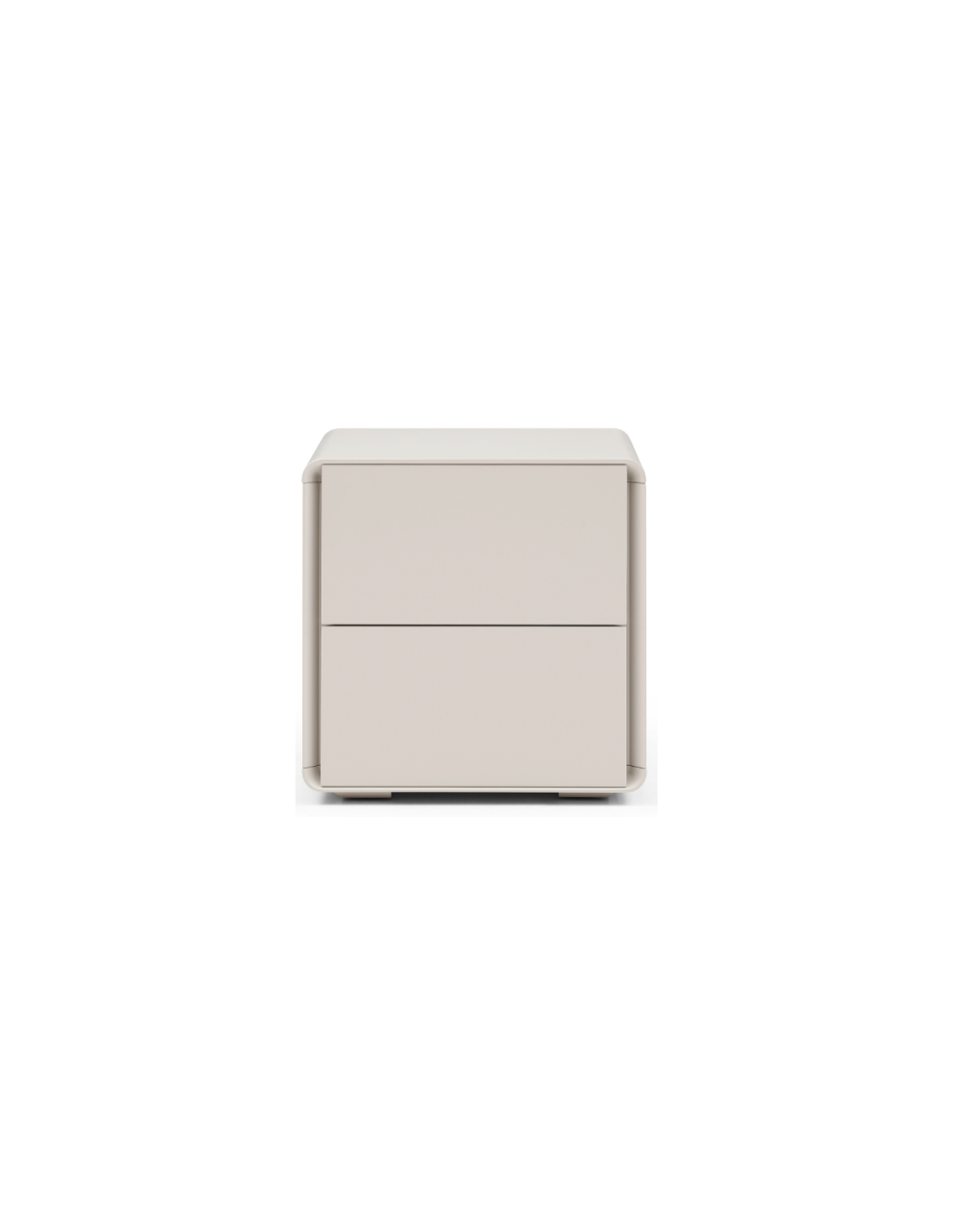 KOTA Sengebord udført i et moderne design, fremstillet af beige egetræsfinér og linoleum. Sengebordet måler 52 cm i højden og 45 x 52 cm i bredde og dybde og har 2 skuffer med push-to-open funktion.