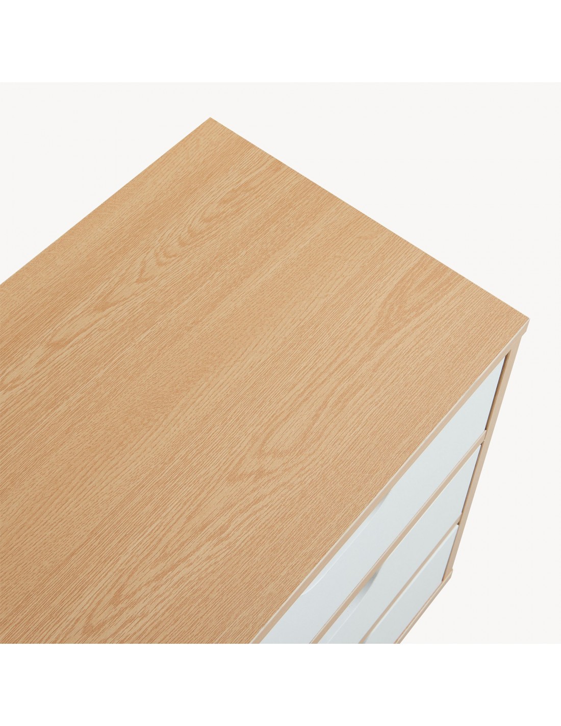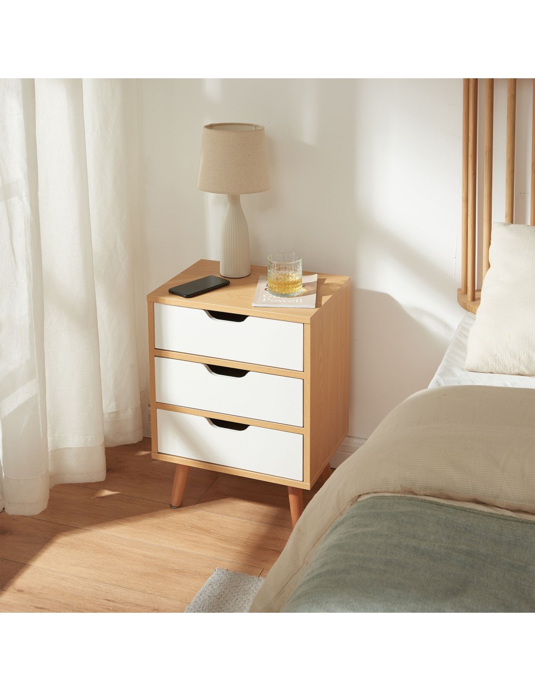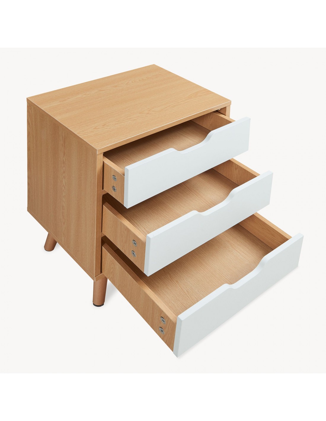 Sengebord udført i et moderne og Skandinavisk design af hvid- og naturfarvet fyrretræ og MDF med skuffer. Sengebordet måler 55 cm i højden og 40 x 30 cm i bredde og dybde.