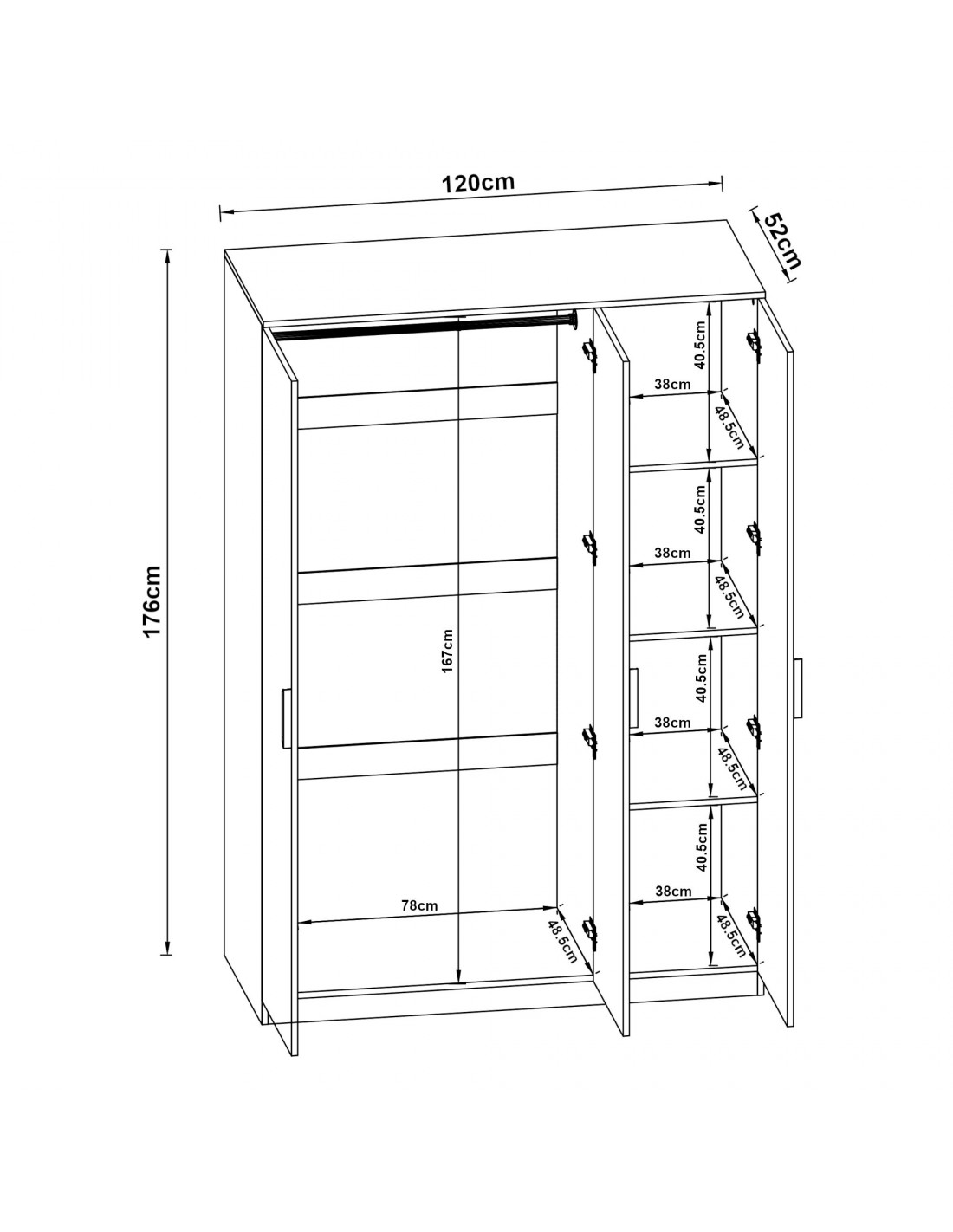 • 1 bøjlestang og 4 hylderum (se mål billede 3 i rækken af produktbilleder)