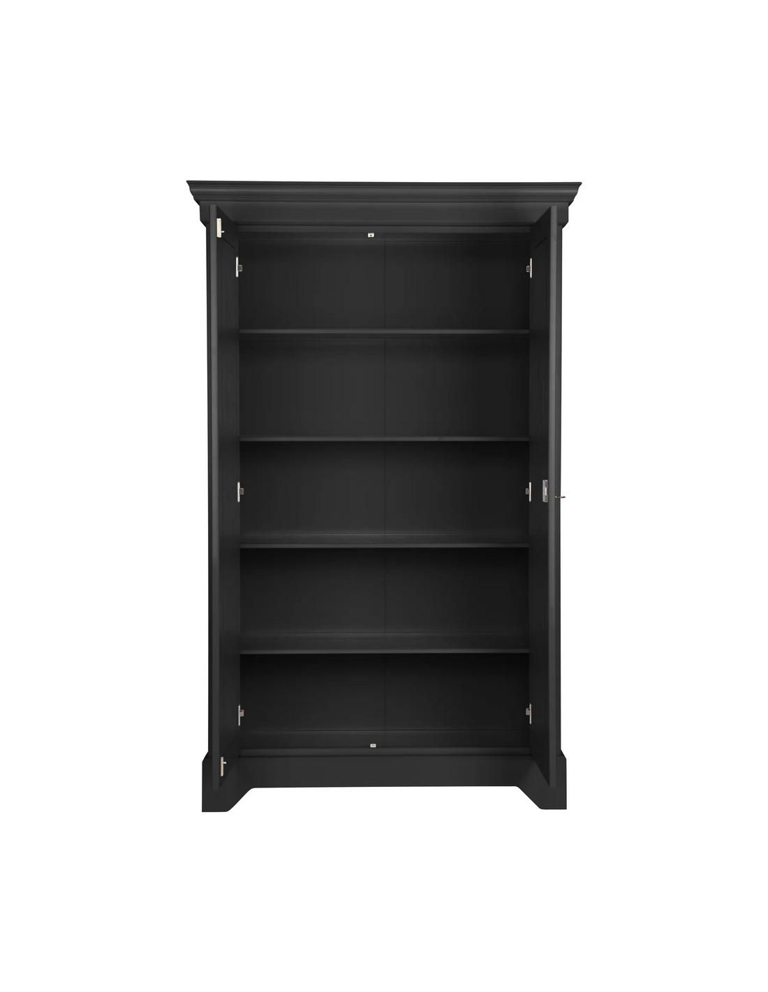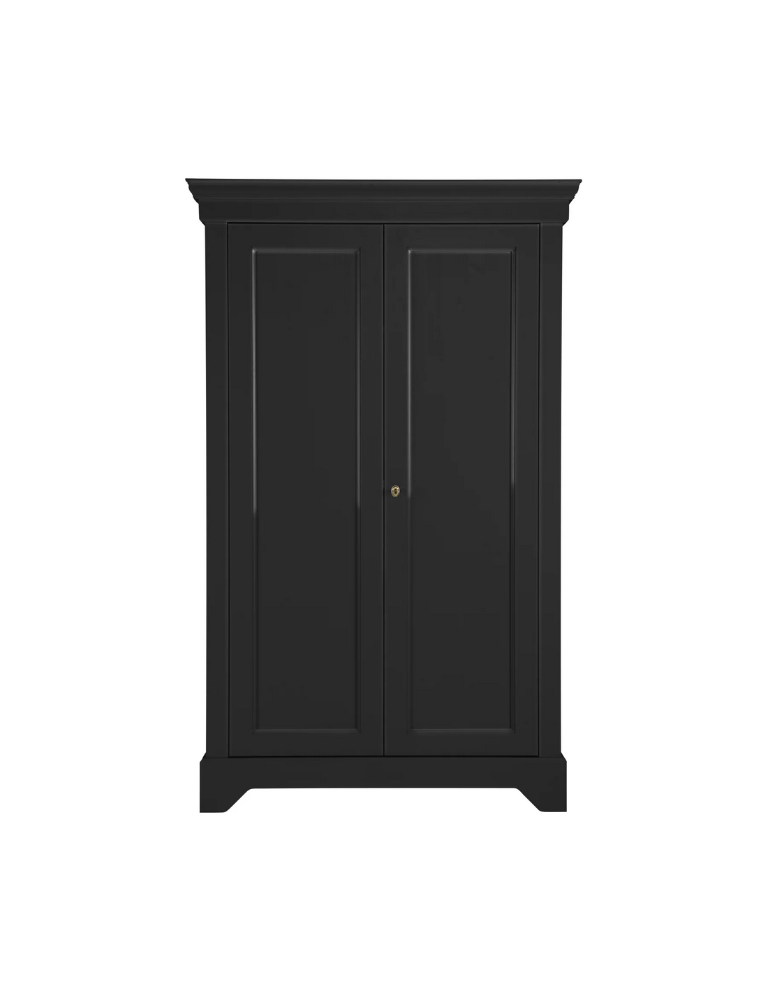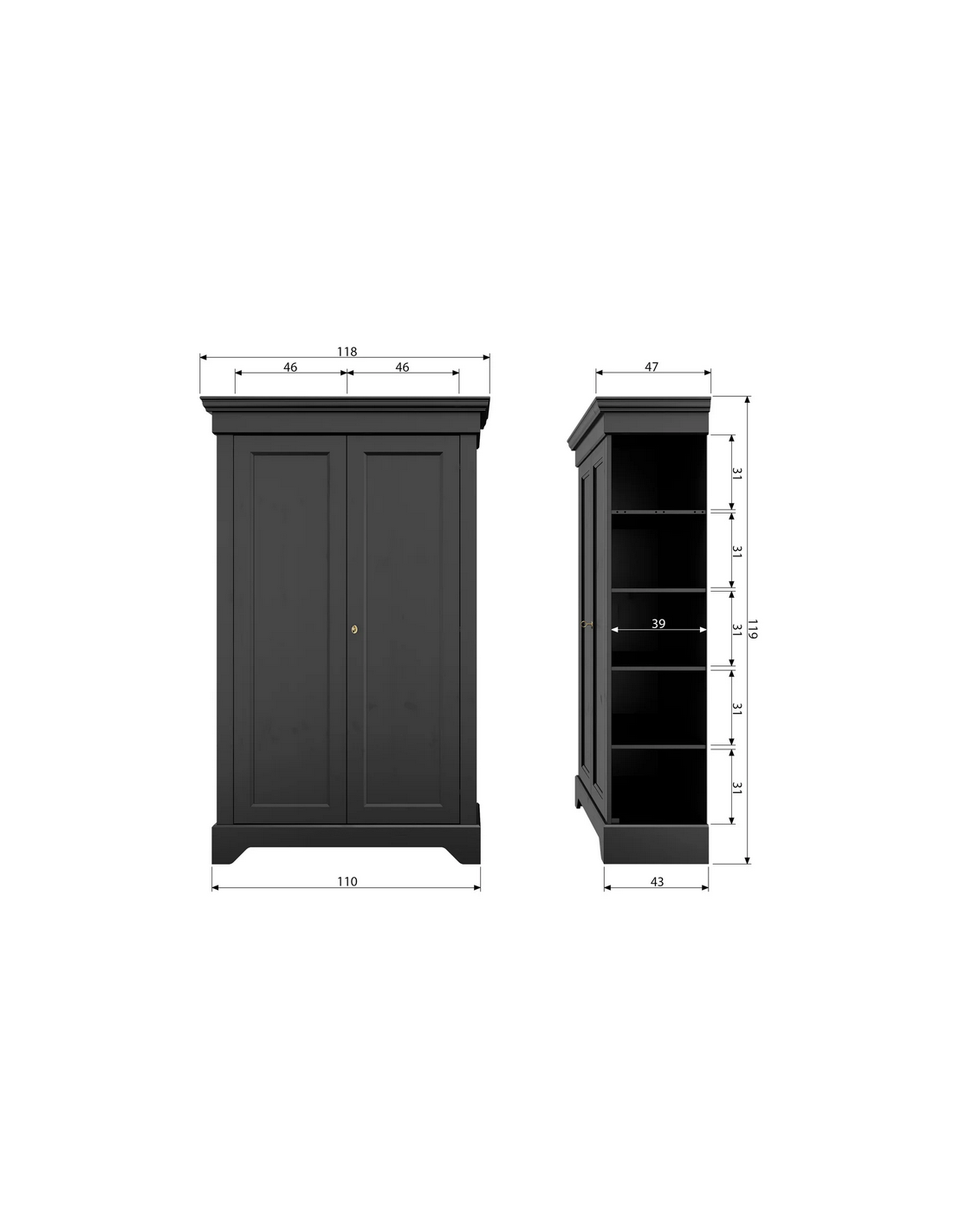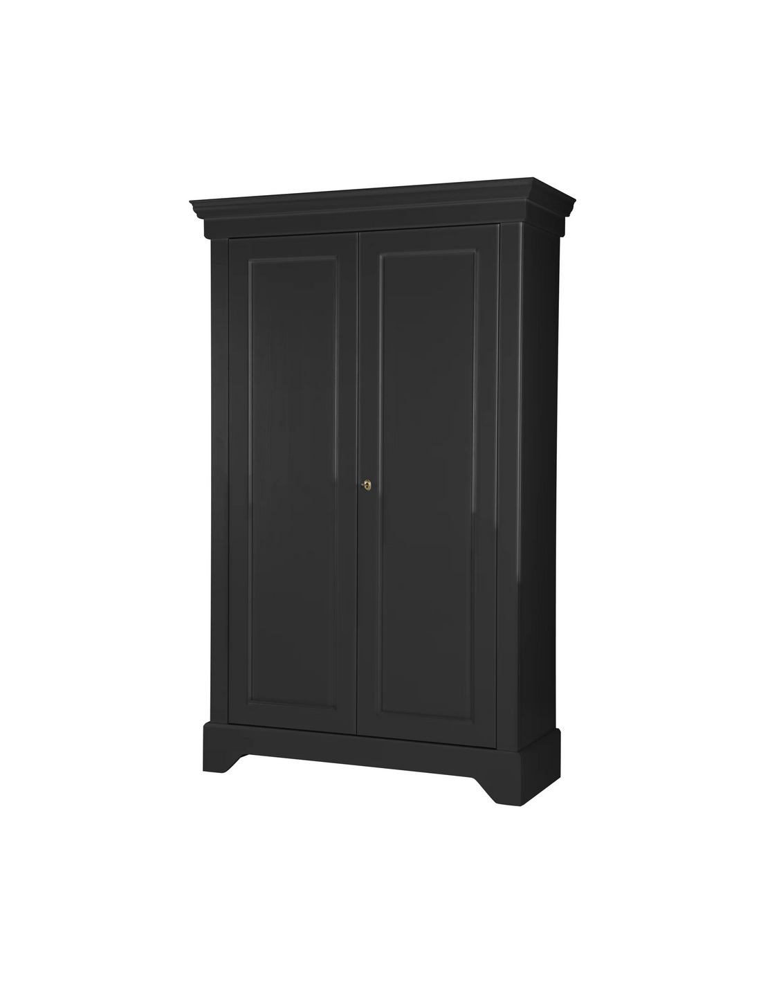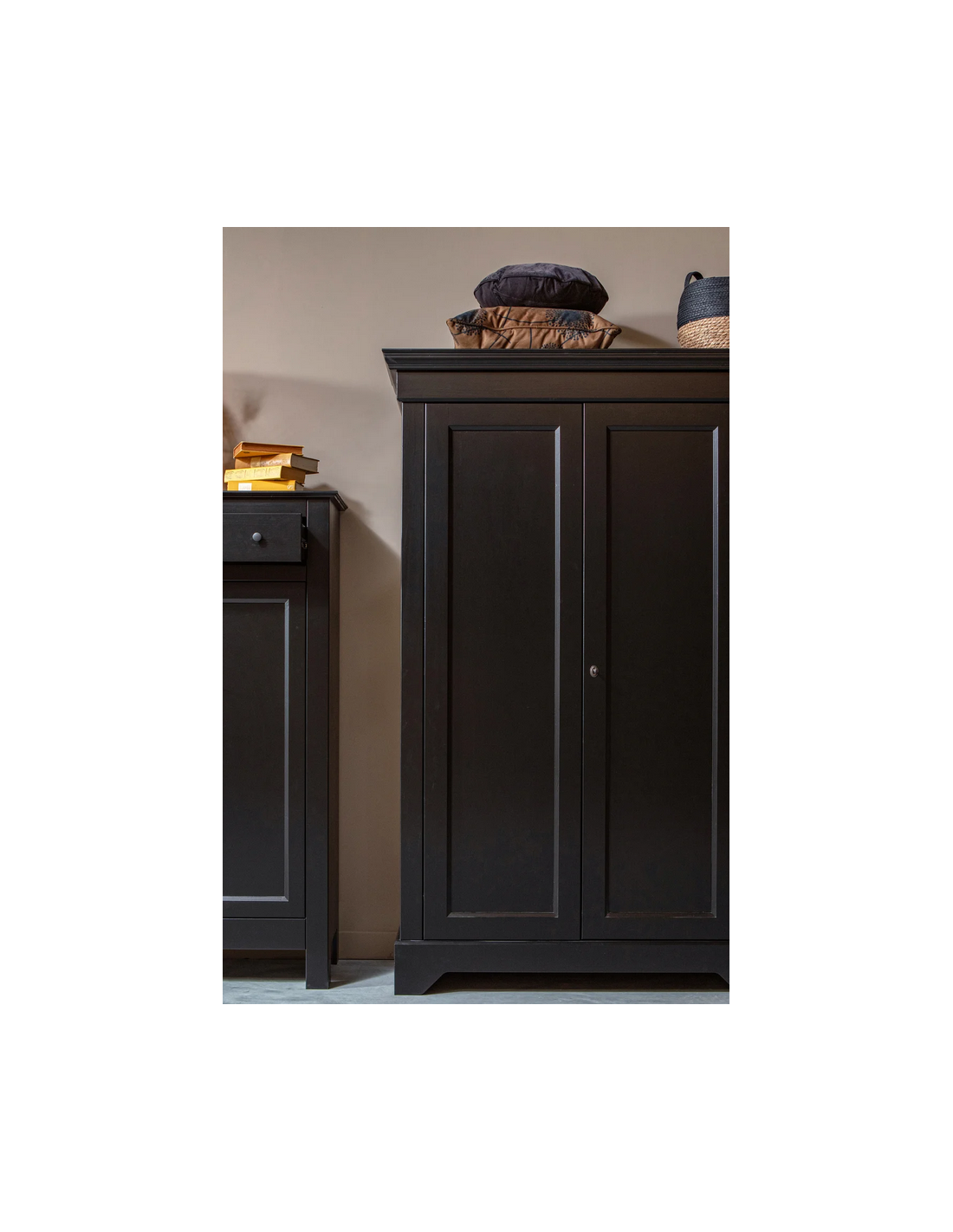 ISABEL Klædeskab fremstillet i et rustikt design af rustikt sortlakeret fyrretræ, med tydelige knaster der er malet over. Klædeskabet kan også anvendes som vitrineskab. Skabet måler 191 cm i højden og 118 x 47 cm i bredde og dybde.