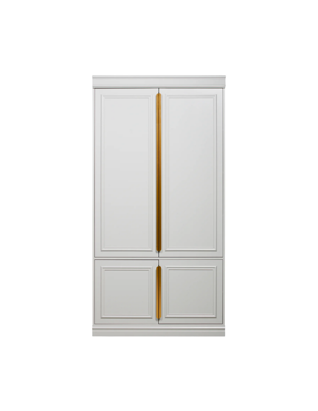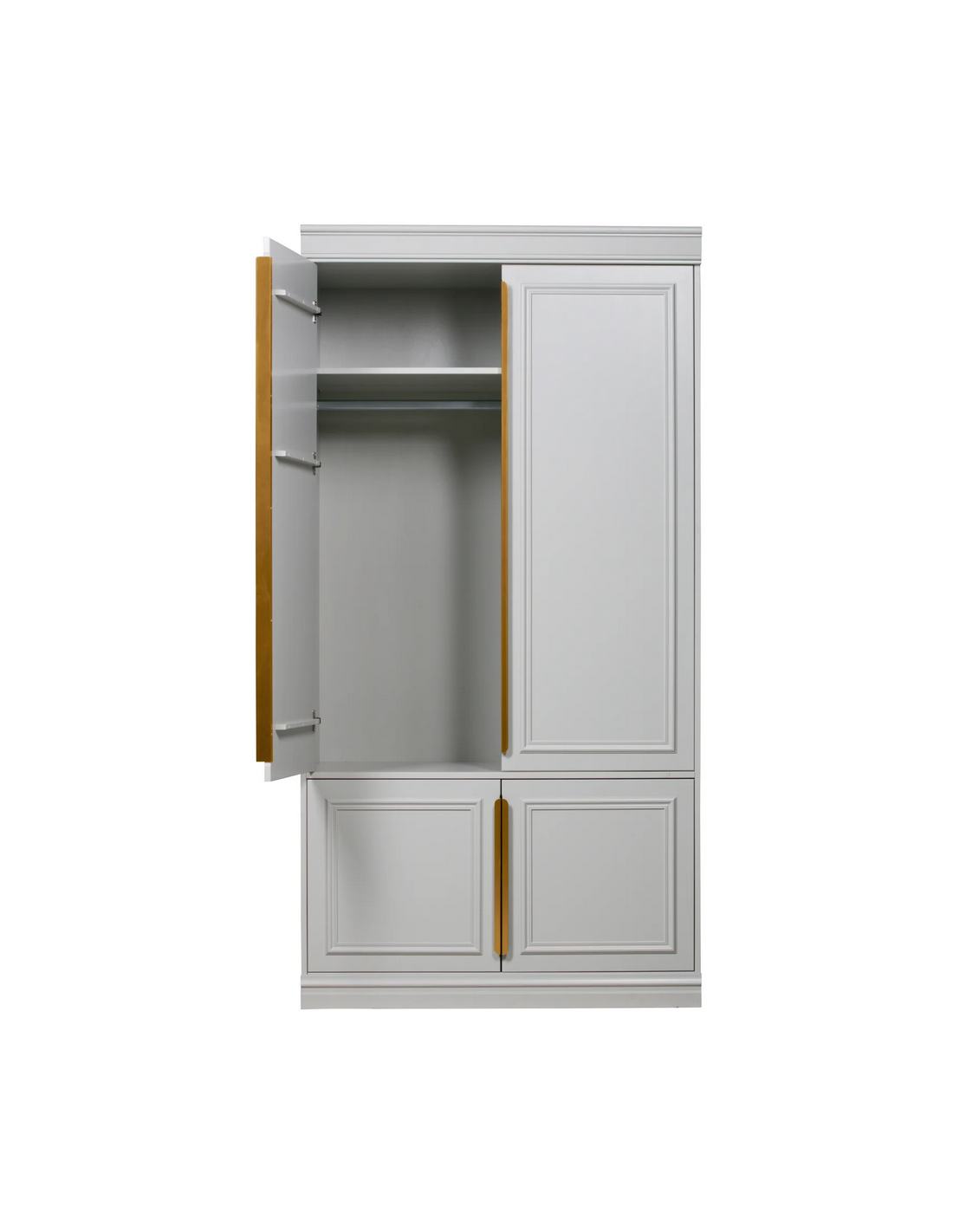 ORGANIZE Klædeskab fremstillet i et rustikt design af rustikt støvgrå lakeret fyrretræ, med tydelige knaster der er malet over. Håndtagene er i rødguld lakeret metal. Klædeskabet måler 215 cm i højden og 110 x 62 cm i bredde og dybde og indeholder 1 bøjlestang, 1 hylde i øverste del samt 2 hylderum i nederste del.