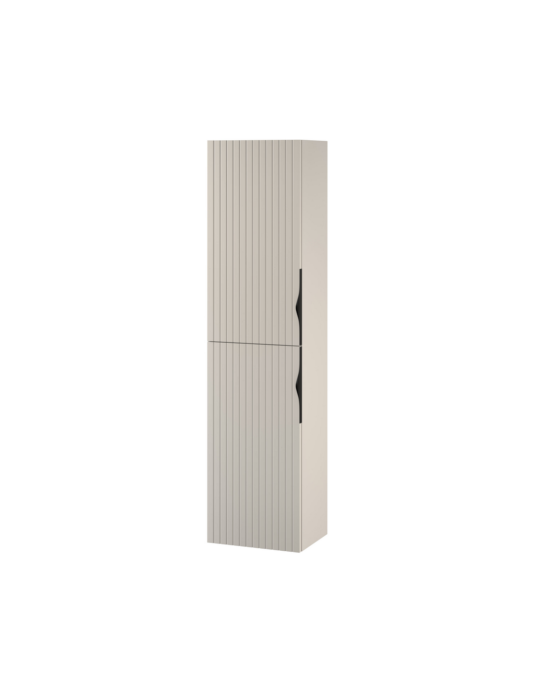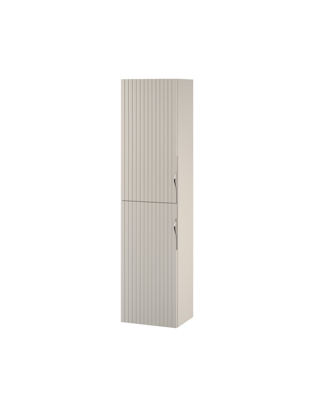 TIRSO Højskab til væg på badeværelset, fremstillet i et moderne design af cashmere farvet MDF. Skabet kommer med 2 skabslåger, som hvert indeholder 1 justerbar hylde. Skabet måler 160 cm i højden og 40 x 30 cm i bredde og dybde. Skabslågerne kan spejlvendes og til skabet medfølger greb i både sort og kromlakeret metal, således der kan vælges efter ønske.