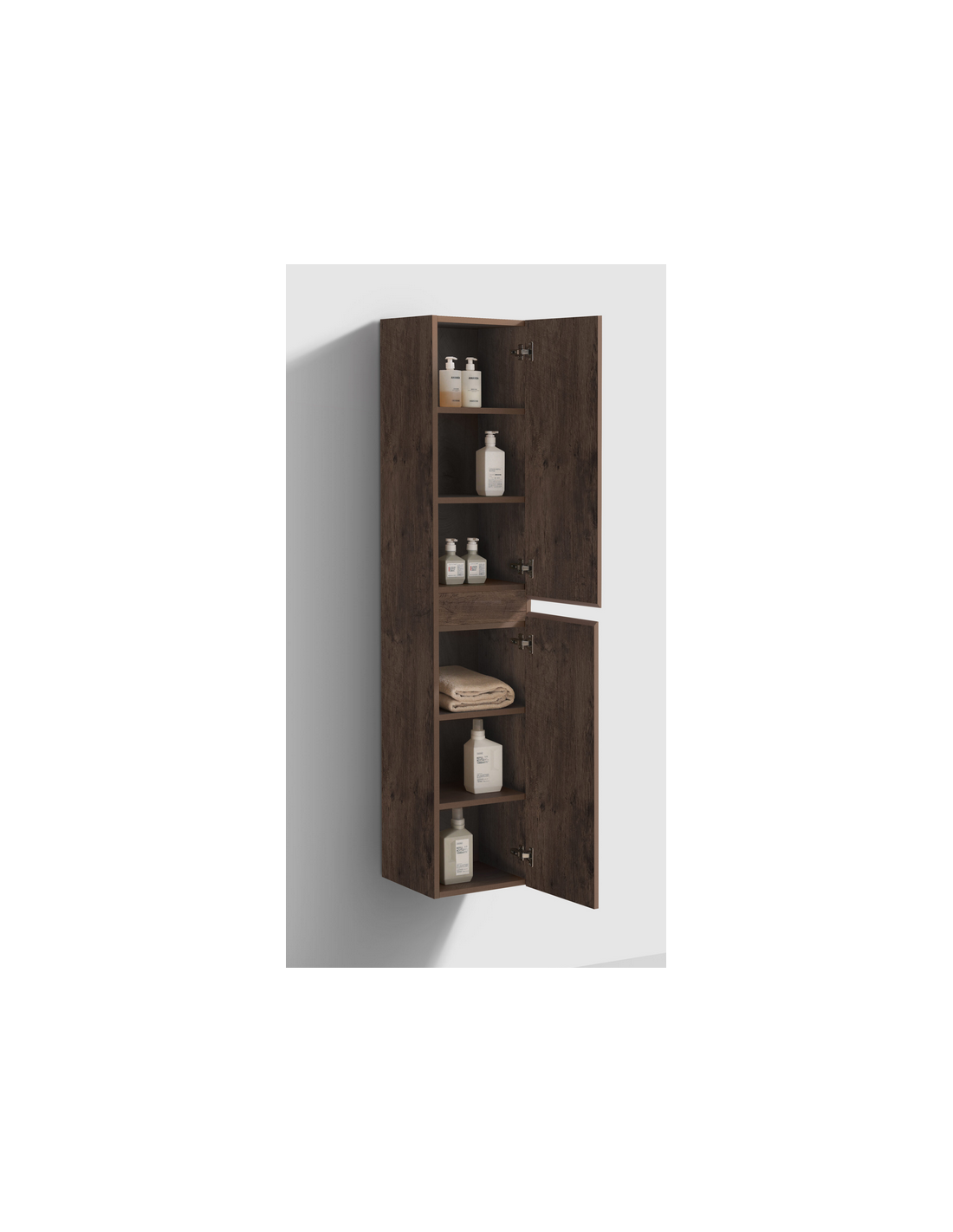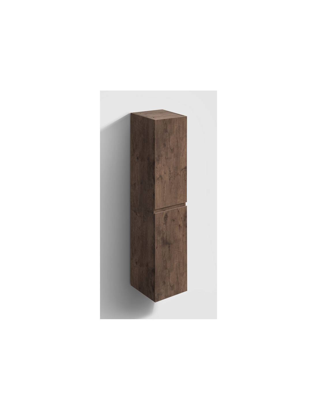 INBE Badeværelsesskab med 2 skabsrum, hvor skabslågerne kan spejlvendes. Skabet er fremstillet i et Skandinavisk design af mørk egetræsfarvet melamin. Skabet måler 180 cm i højden og 35 x 35 cm i bredde og dybde med grebsfri låger og softclose funktion.