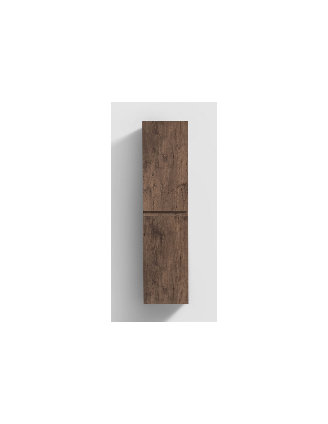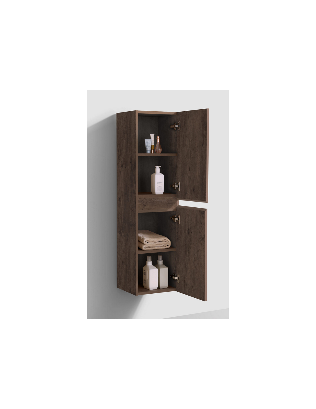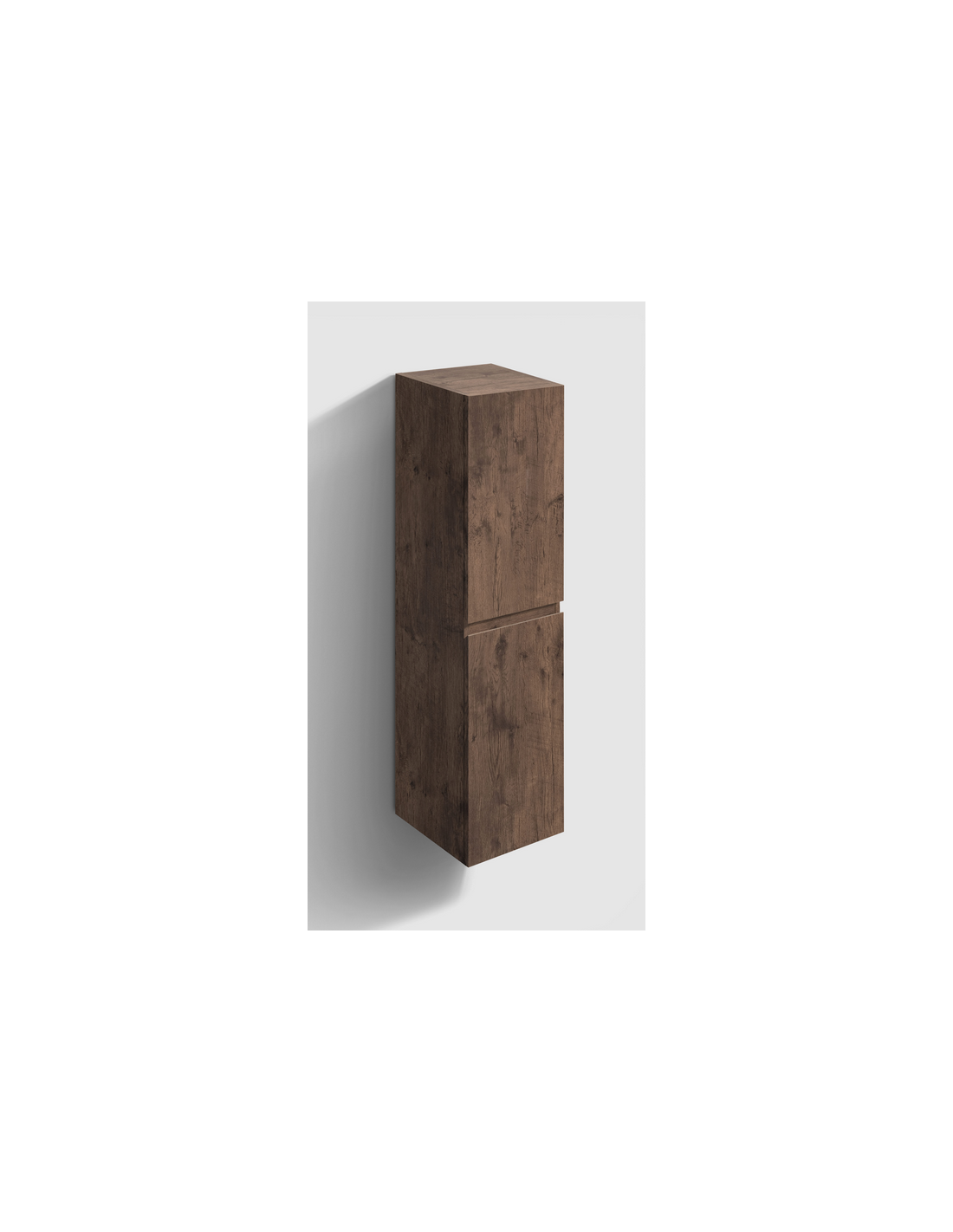 INBE Badeværelsesskab med 2 skabsrum, hvor skabslågerne kan spejlvendes. Skabet er fremstillet i et Skandinavisk design af mørk egetræsfarvet melamin. Skabet måler 130 cm i højden og 35 x 35 cm i bredde og dybde med grebsfri låger og softclose funktion.
