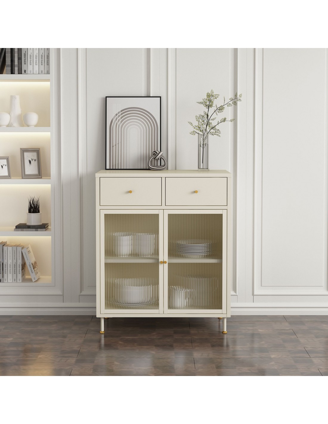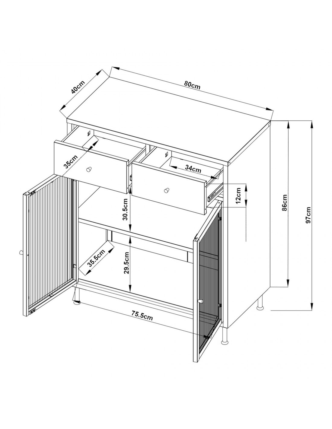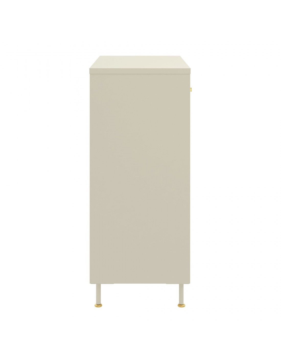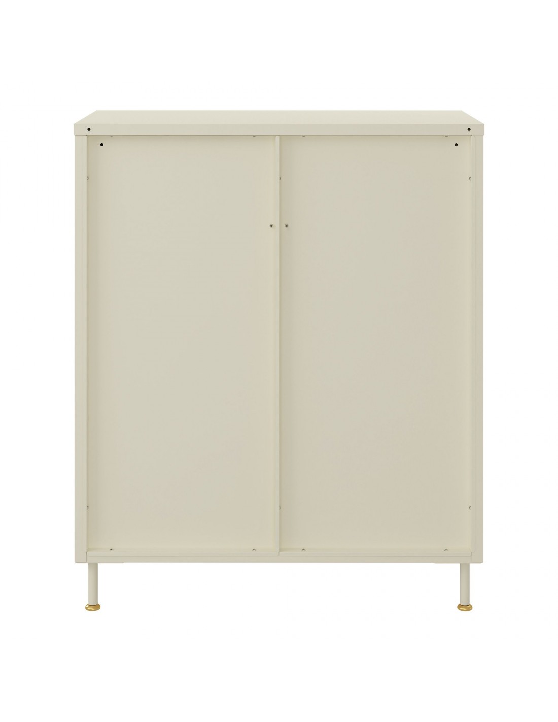 Lavt vitrineskab udført i et design af cremehvid lakeret stål og klart rillet glas. Vitrineskabet 2 skuffer og 2 skabslåger, der gemmer på 2 hylderum. Vitrineskabet måler 97 cm i højden og 80 x 40 cm i bredde og dybde.