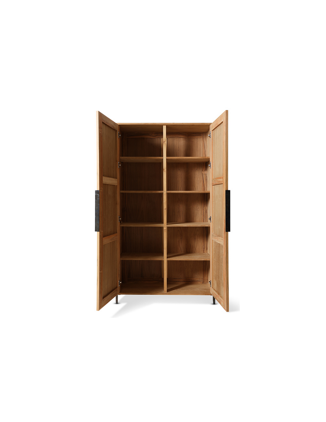 PIONEER Vitrineskab fra hollandske HK Living, udført i et rustikt design af industrielt sortlakeret jern, rustikt fyrretræ og mørkegrøn kanvas. Vitrinen måler 180 cm i højden og 100 x 37,5 cm i bredde og dybde og indeholder 5 dobbelte hylderum.