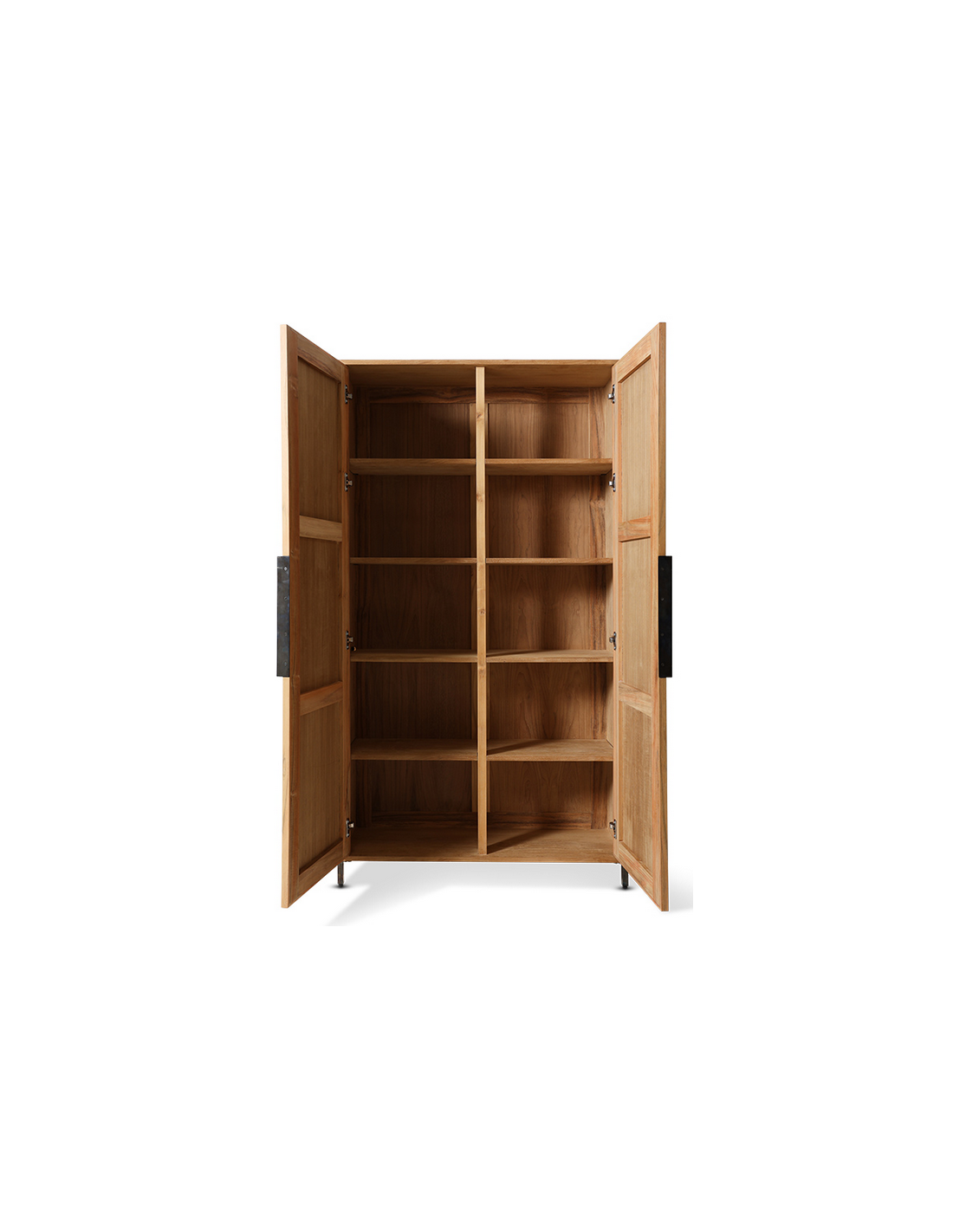 PIONEER Vitrineskab fra hollandske HK Living, udført i et rustikt design af industrielt sortlakeret jern og rustikt fyrretræ og rattan. Vitrinen måler 180 cm i højden og 100 x 37,5 cm i bredde og dybde og indeholder 5 dobbelte hylderum.