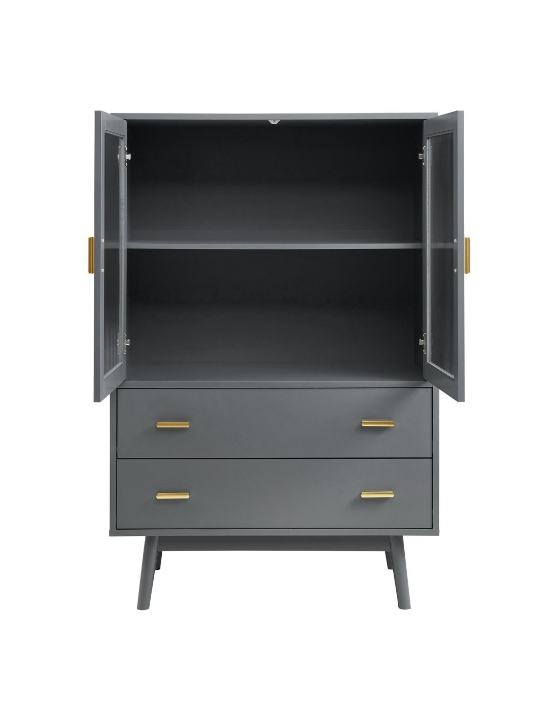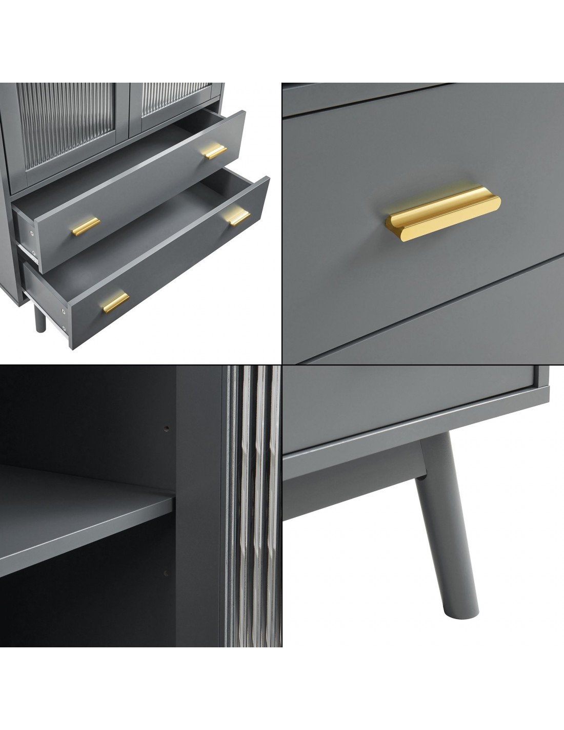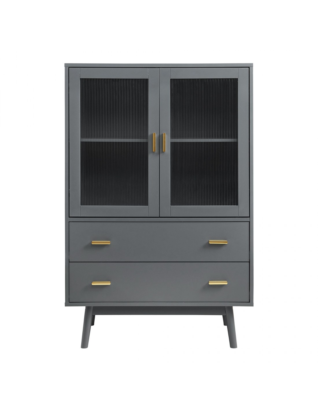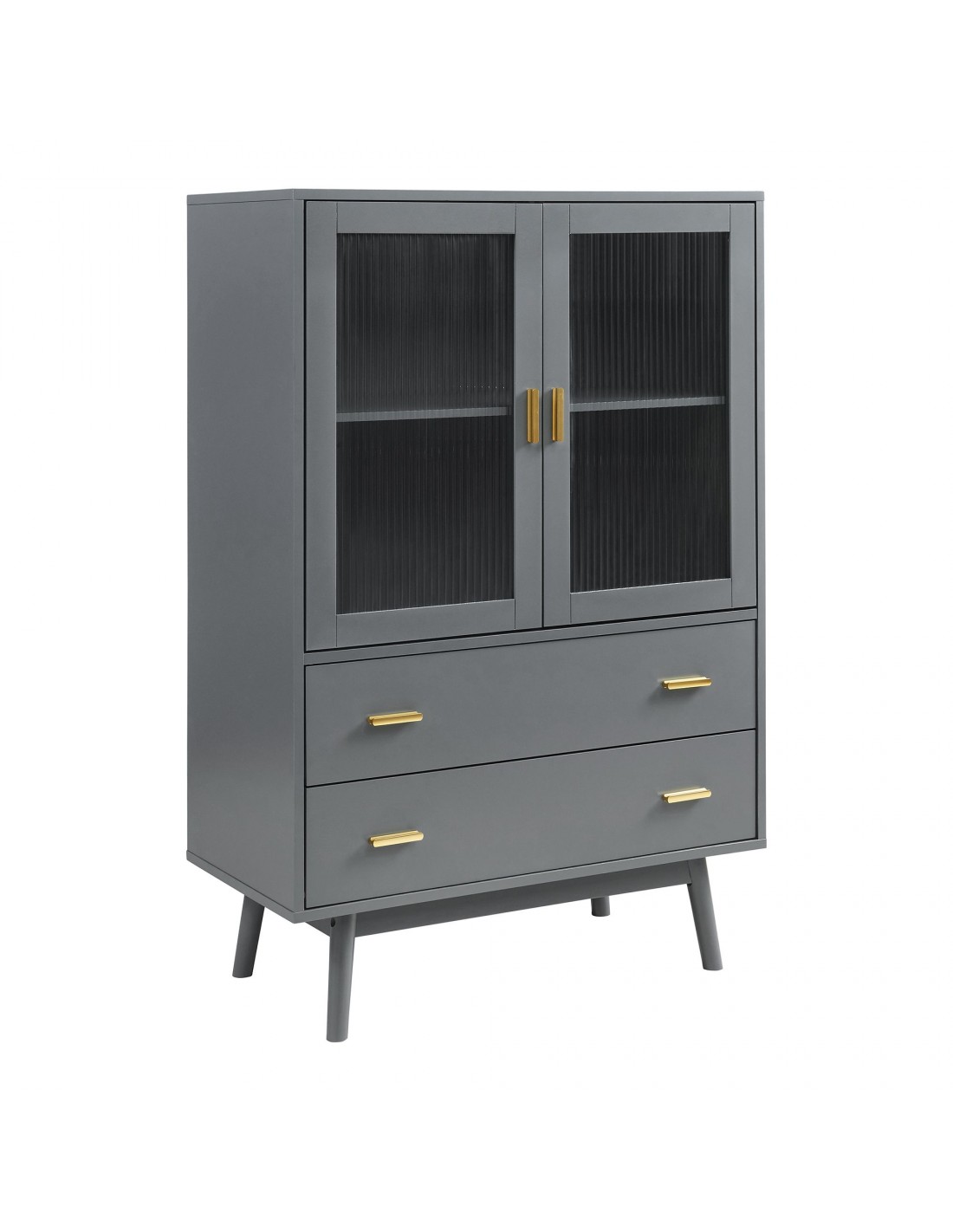 SUS Lavt vitrineskab udført i et design af grålakeret fyrretræ og MDF med fronter i klart rillet glas. Vitrineskabet 2 skuffer og 2 skabslåger, hvor skabslågerne gemmer på 2 hylderum. Vitrineskabet måler 120 cm i højden og 80 x 40 cm i bredde og dybde.
