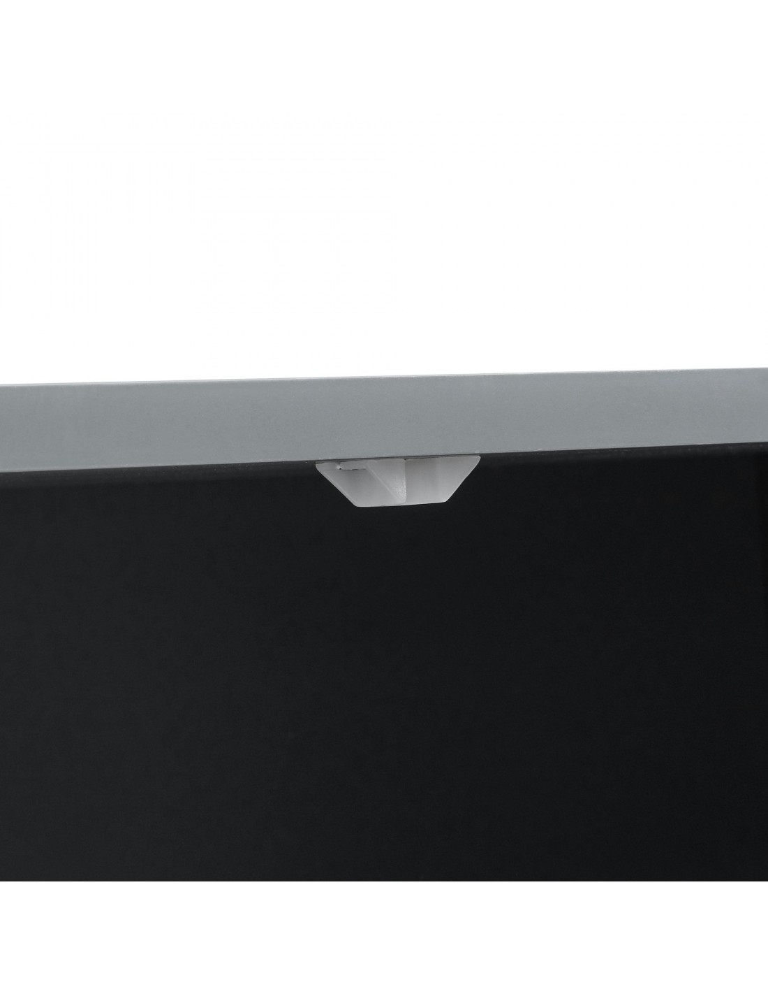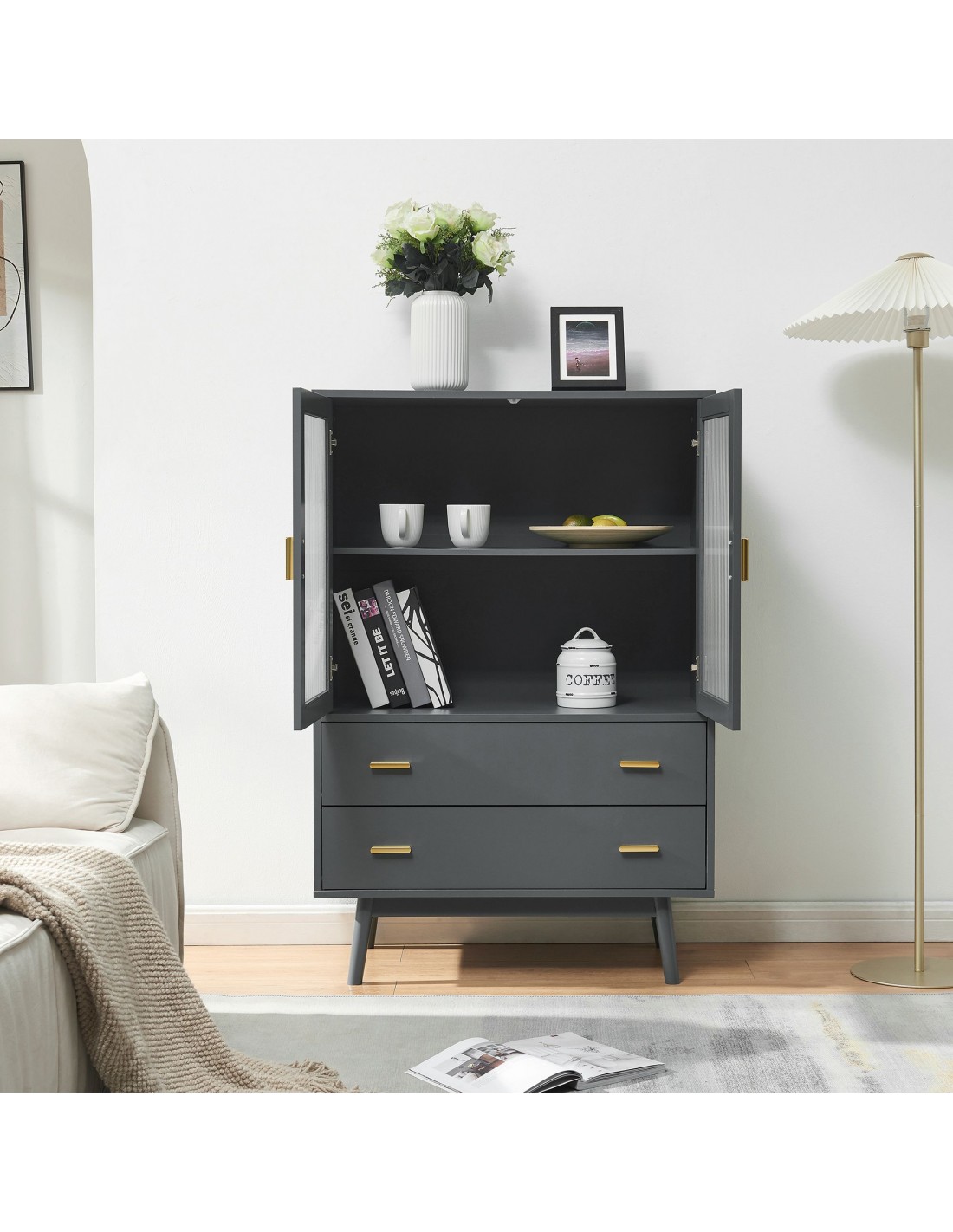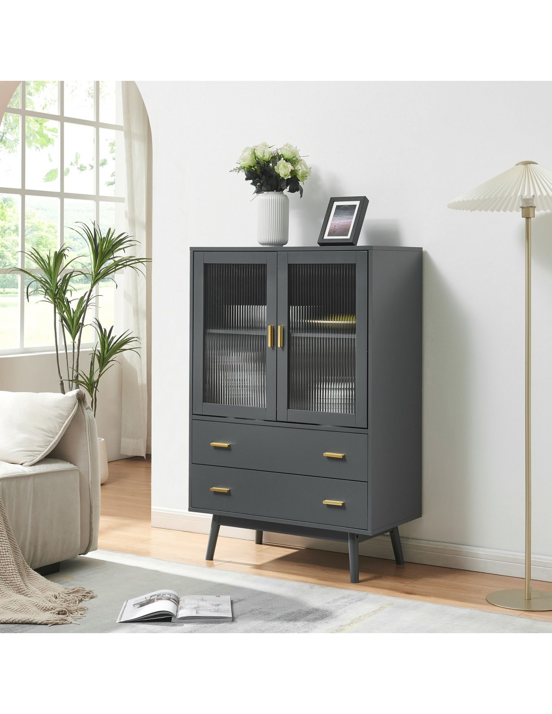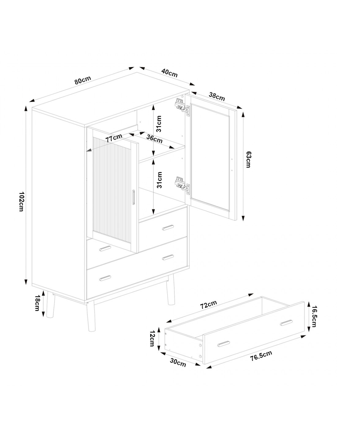 SUS Lavt vitrineskab udført i et design af grålakeret fyrretræ og MDF med fronter i klart rillet glas. Vitrineskabet 2 skuffer og 2 skabslåger, hvor skabslågerne gemmer på 2 hylderum. Vitrineskabet måler 120 cm i højden og 80 x 40 cm i bredde og dybde.
