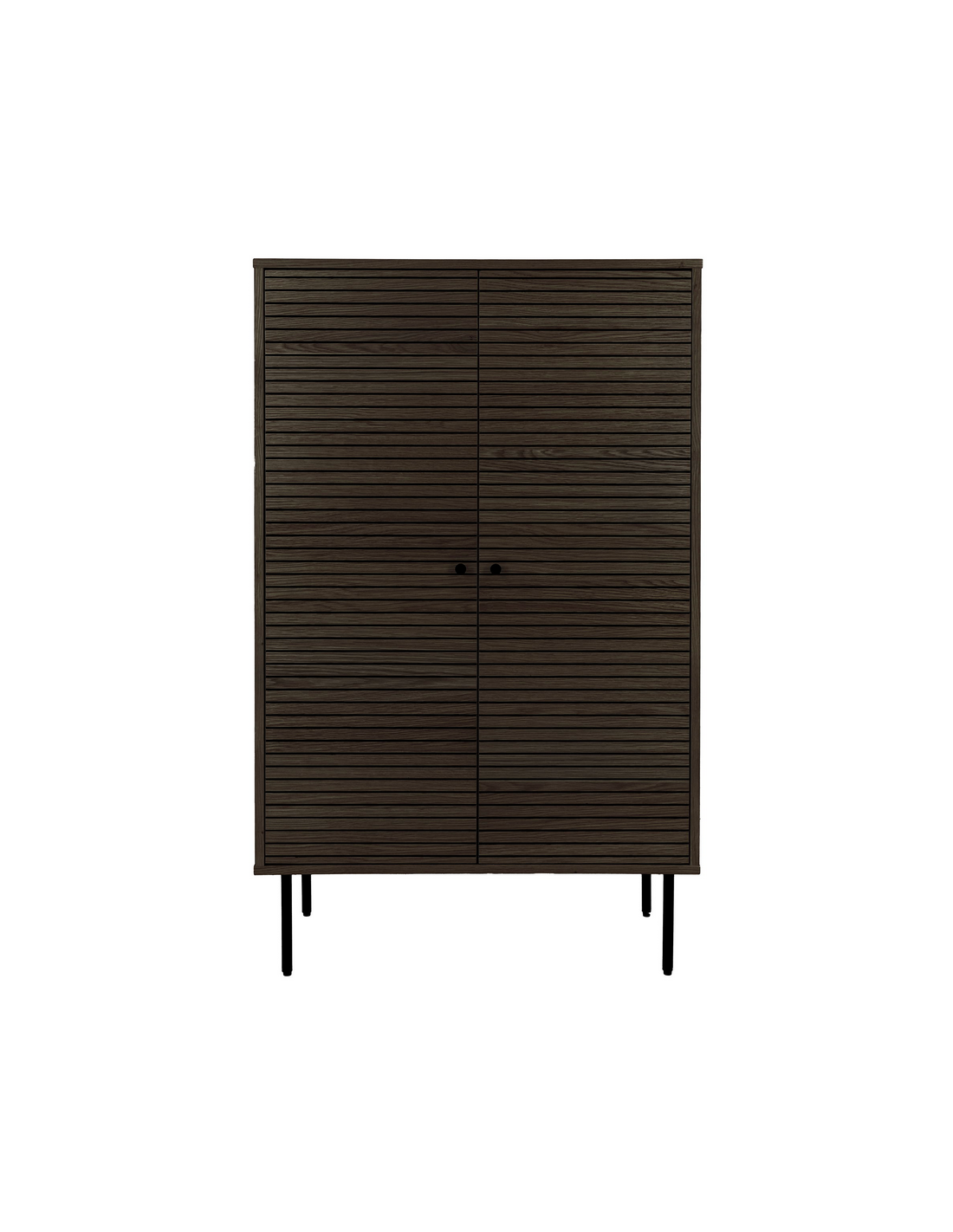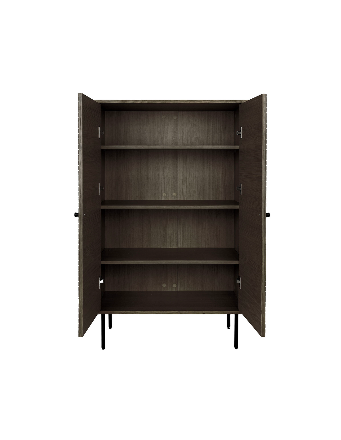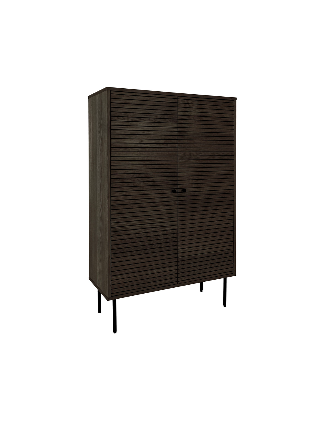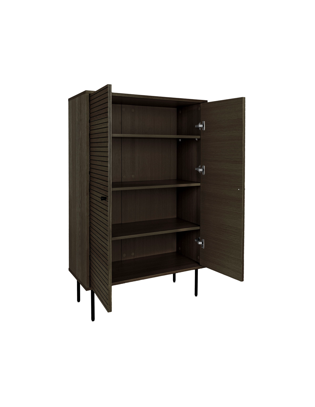 Vitrineskab med 4 hylderum, udført i et moderne design af sortlakeret metal og mørkebrun egetræsfinér. Vitrineskabet måler 130 cm i højden og 80 x 40 cm i bredde og dybde.