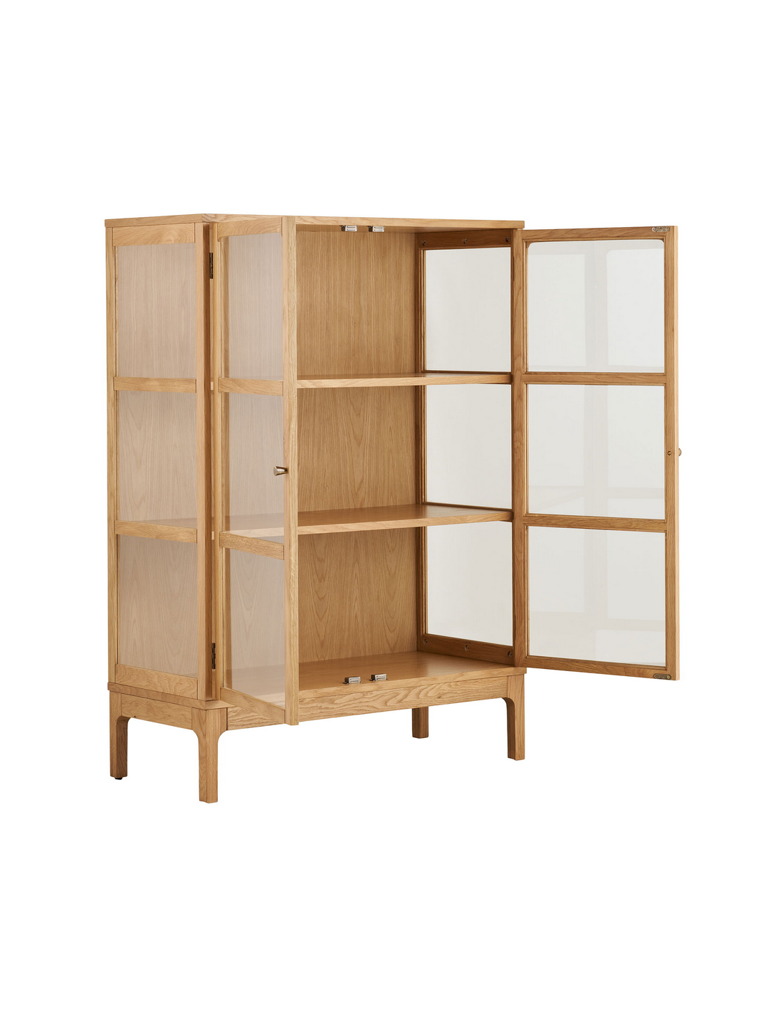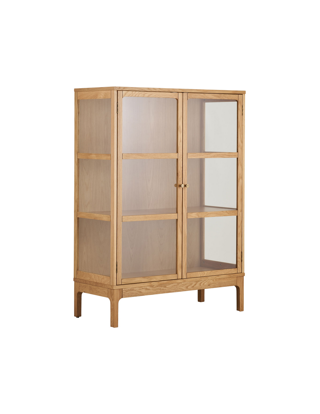Vitrineskab med 3 hylderum, udført i et moderne design af egetræsfinér og klart glas. Vitrineskabet måler 126 cm i højden og 90 x 40 cm i bredde og dybde.