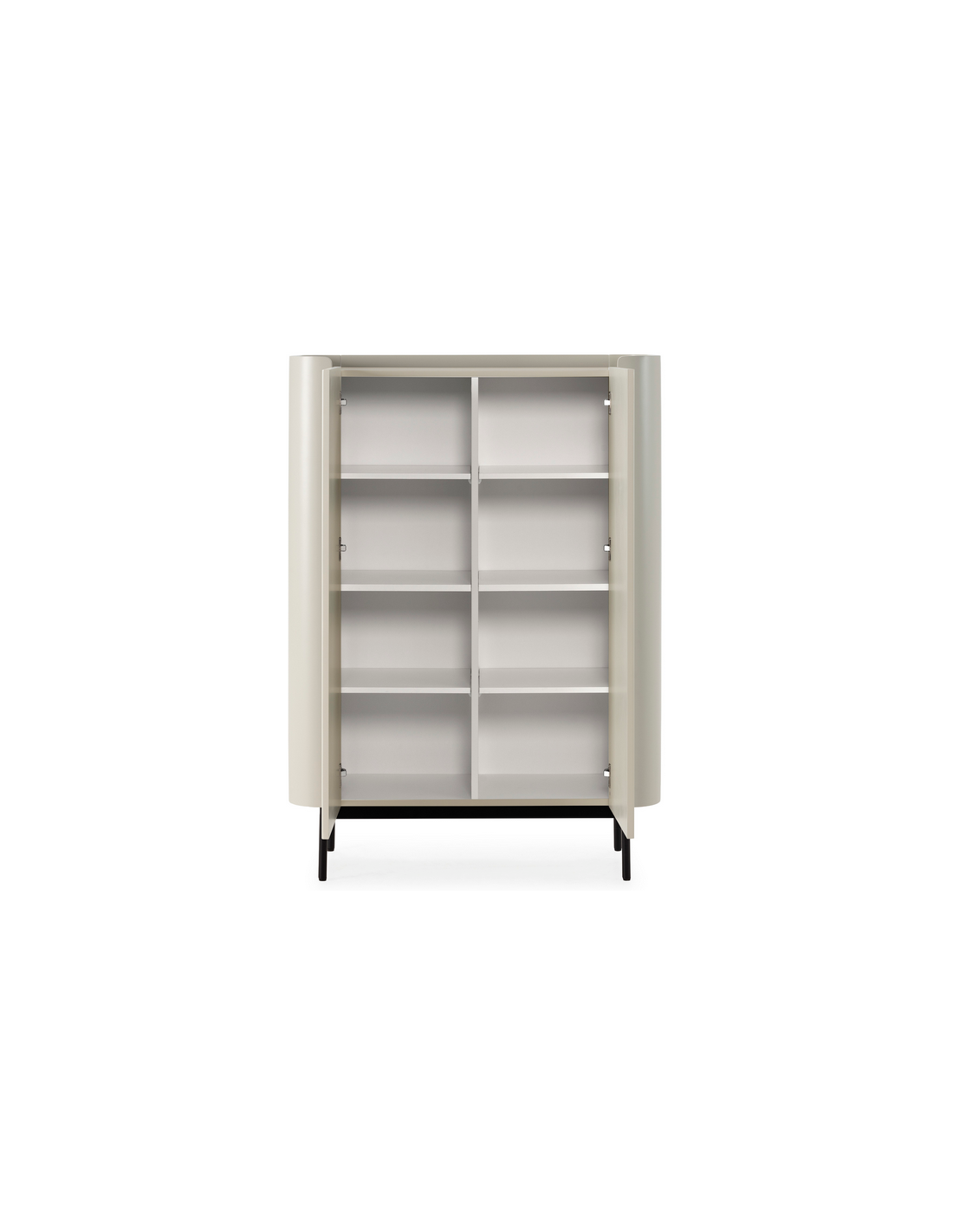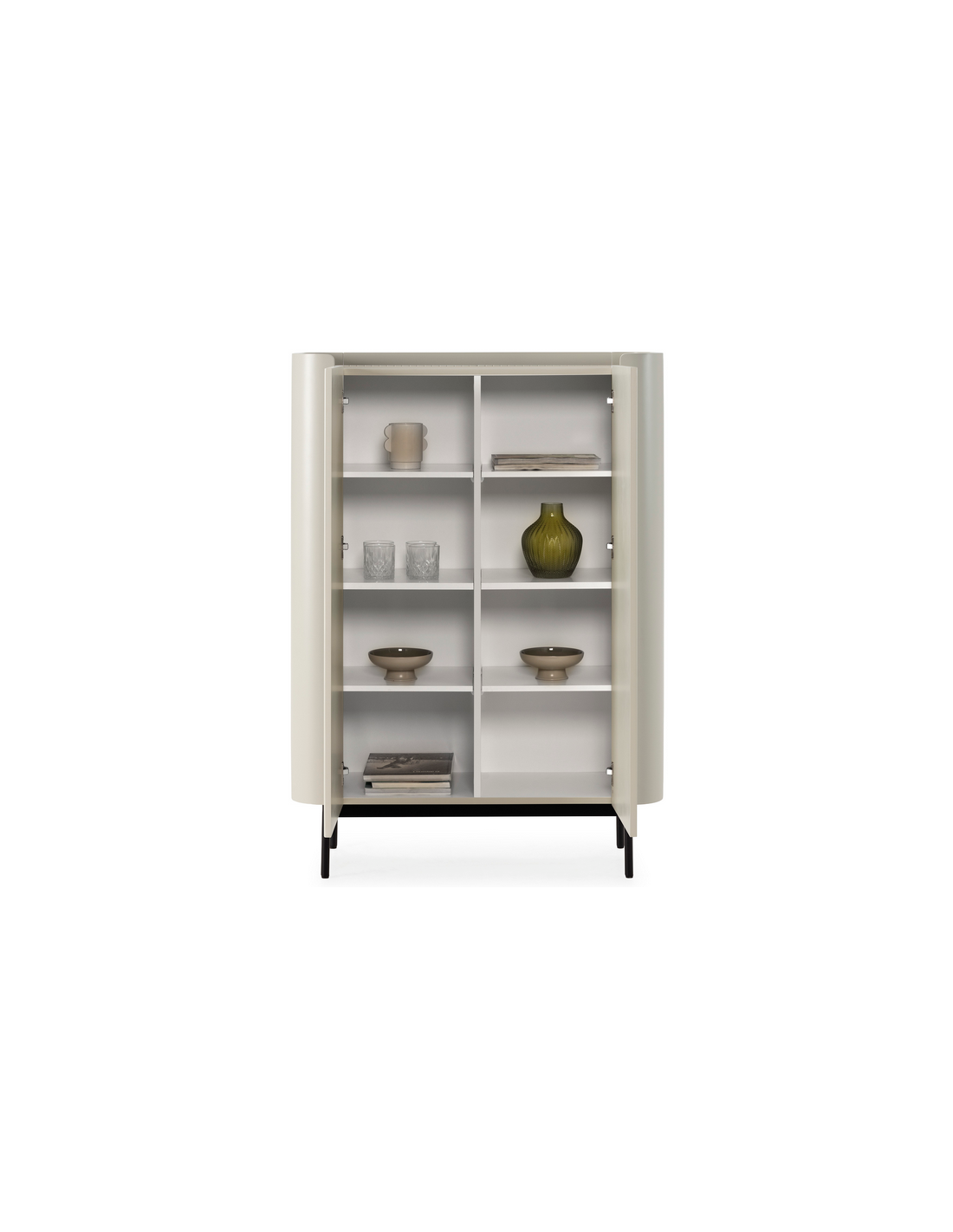 WILLA Vitrineskab med 2 skabslåger, udført i et moderne design af sortlakeret metal og cremefarvet MDF. Vitrineskabet måler 140 cm i højden og 100 x 40 cm i bredde og dybde.