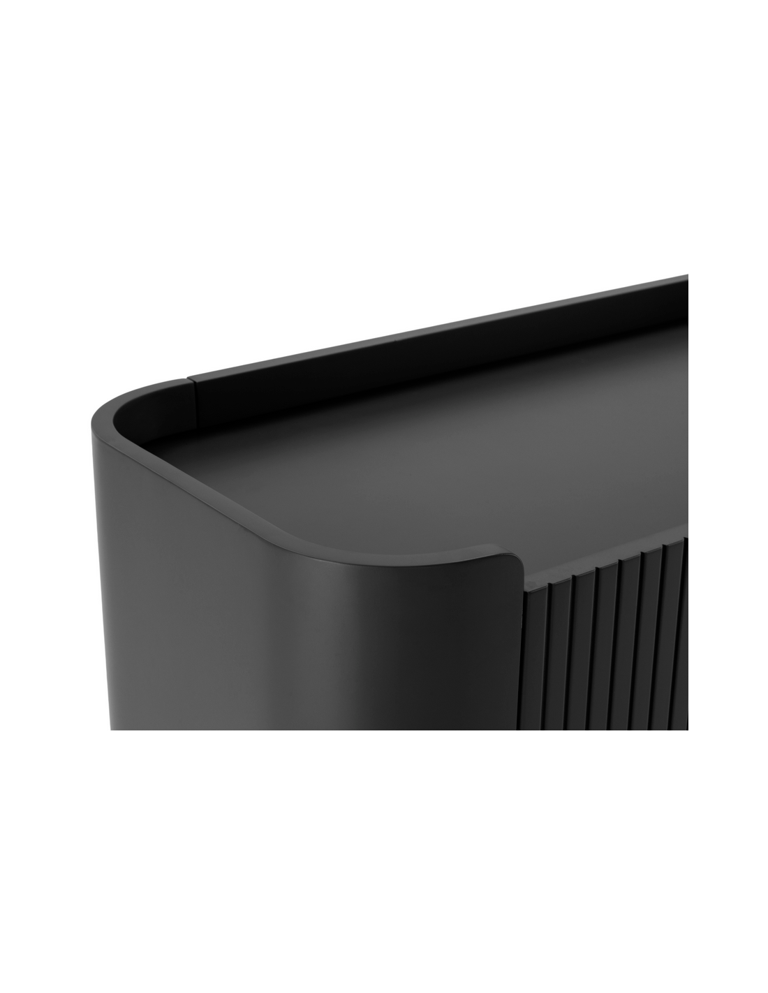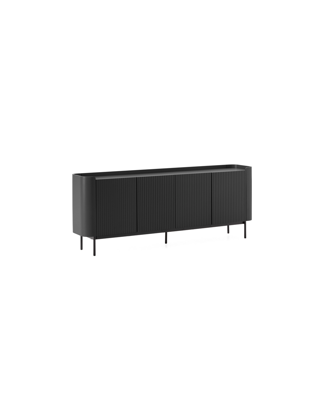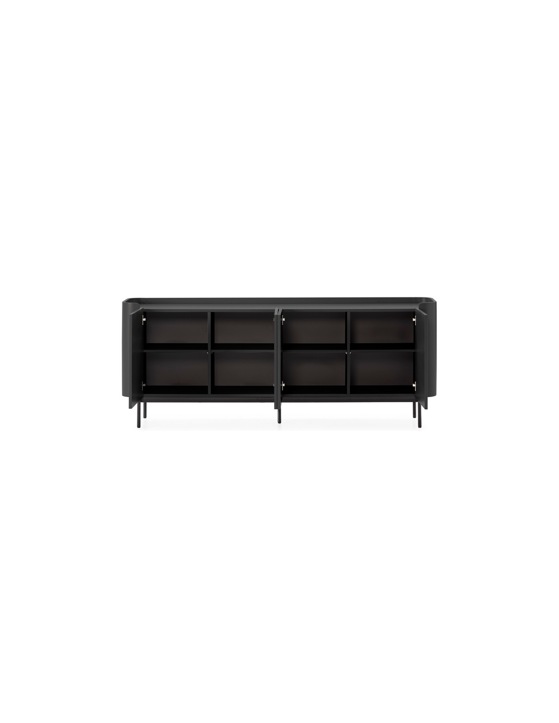 WILLA Skænk med 4 skabslåger, udført i et moderne design af sortlakeret metal og mat sort lakeret MDF. Skænken måler 80 cm i højden og 200 x 40 cm i bredde og dybde.