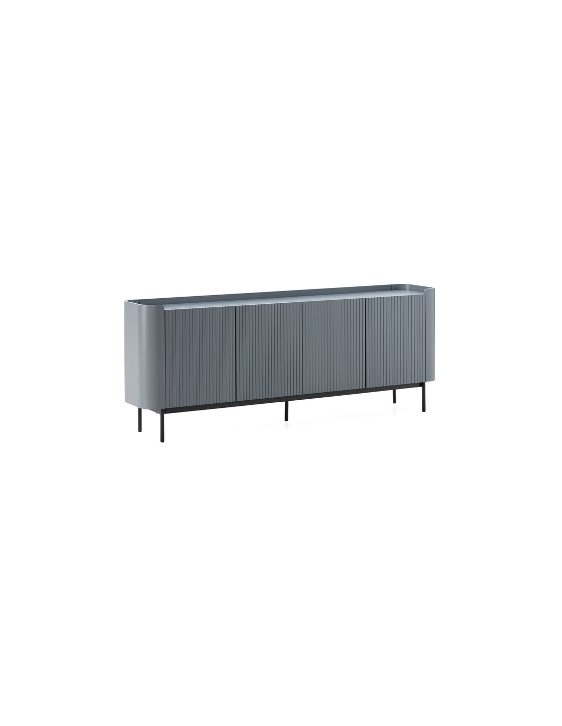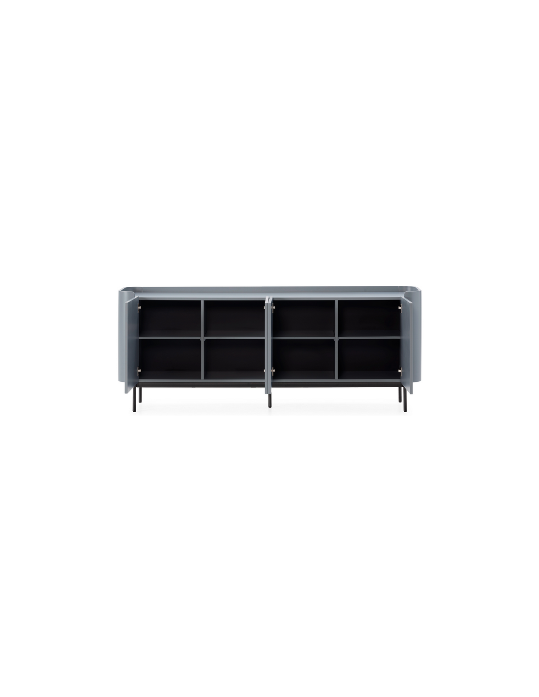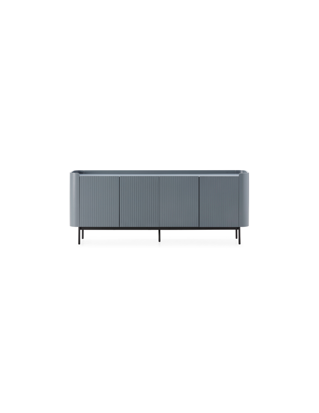 WILLA Skænk med 4 skabslåger, udført i et moderne design af sortlakeret metal og havblå MDF. Skænken måler 80 cm i højden og 200 x 40 cm i bredde og dybde.