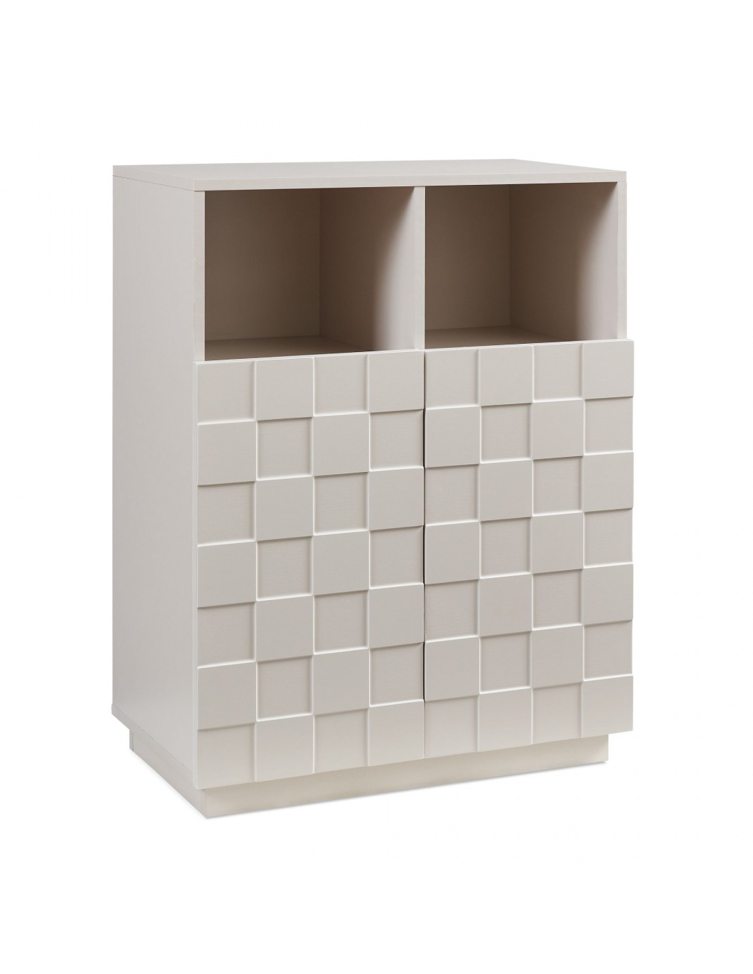 BOBRO Lavt vitrineskab udført i et design af beige møbelplade. Vitrineskabet 2 åbne hylderum og 2 skabslåger, der samlet gemmer på 4 hylderum. Vitrineskabet måler 85,5 cm i højden og 64 x 35,5 cm i bredde og dybde.