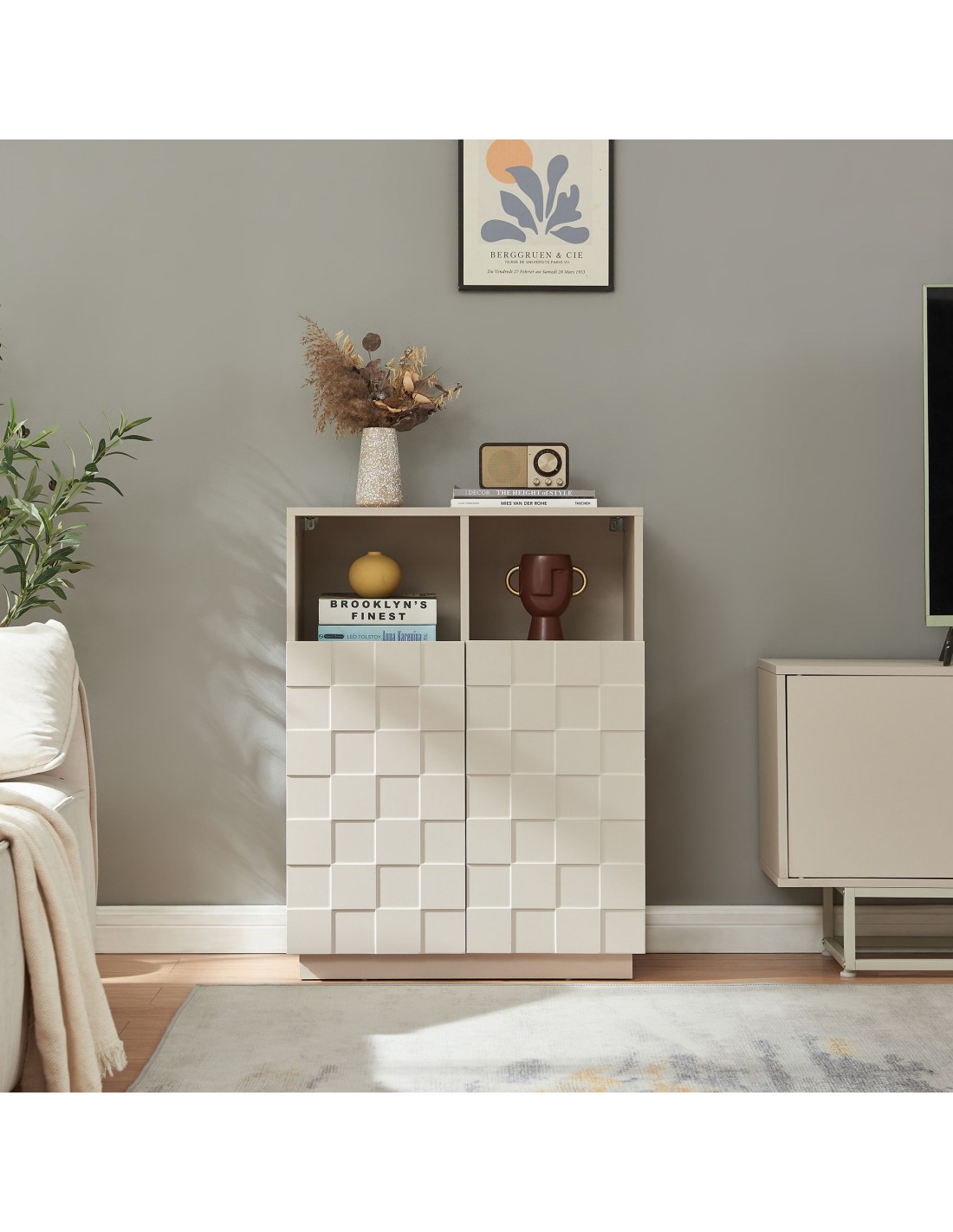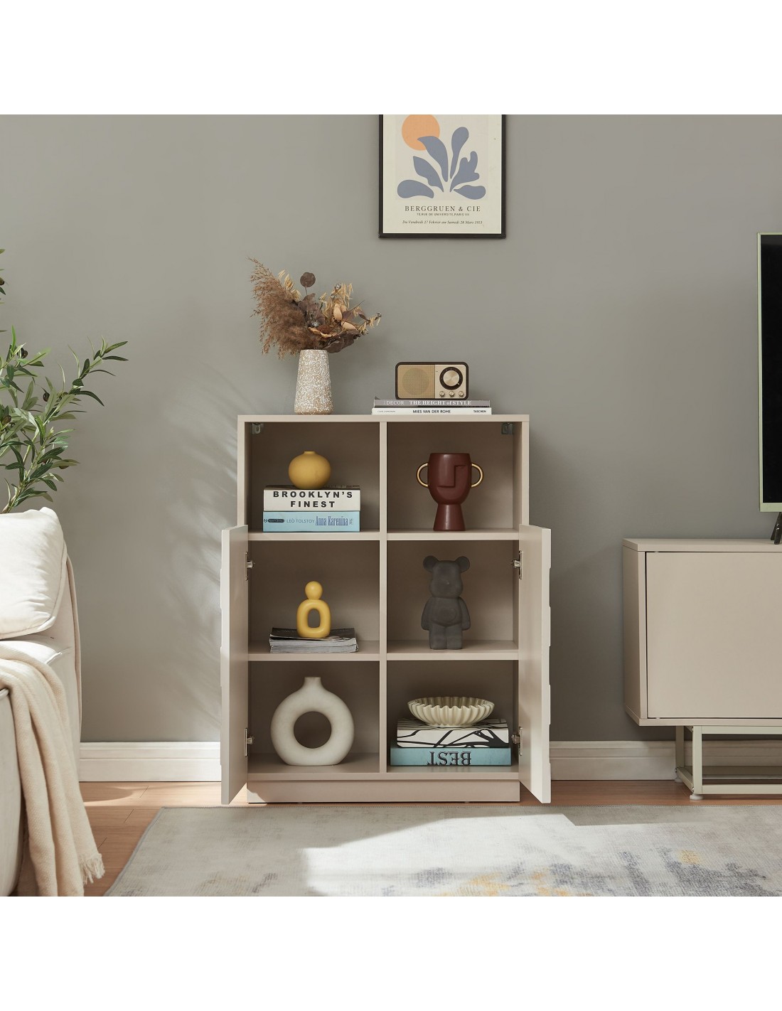 BOBRO Lavt vitrineskab i møbelplade H85,5 x B64 x D35,5 cm - Beige